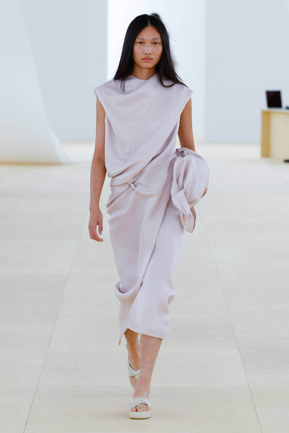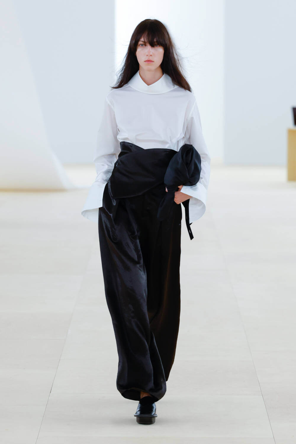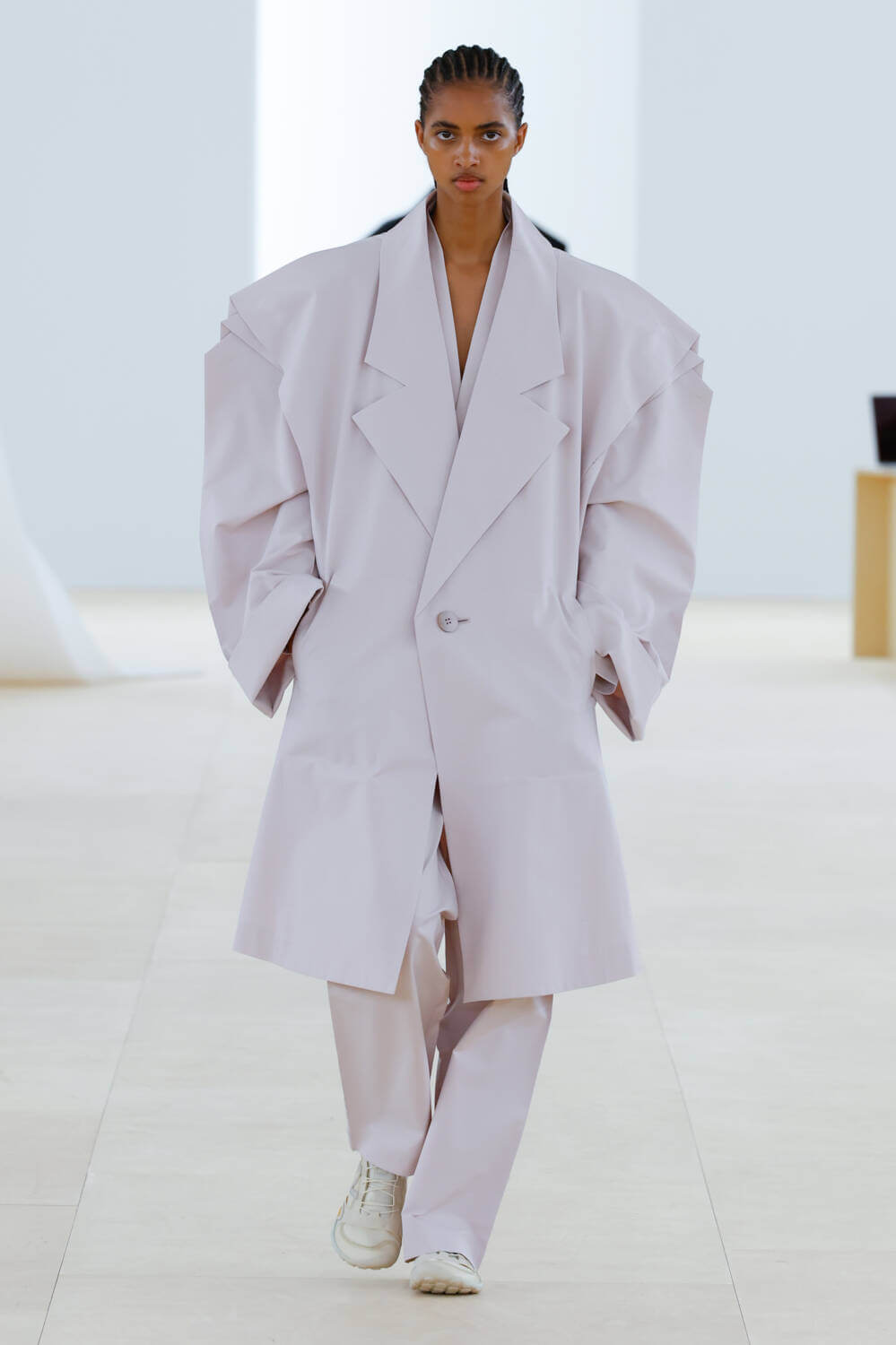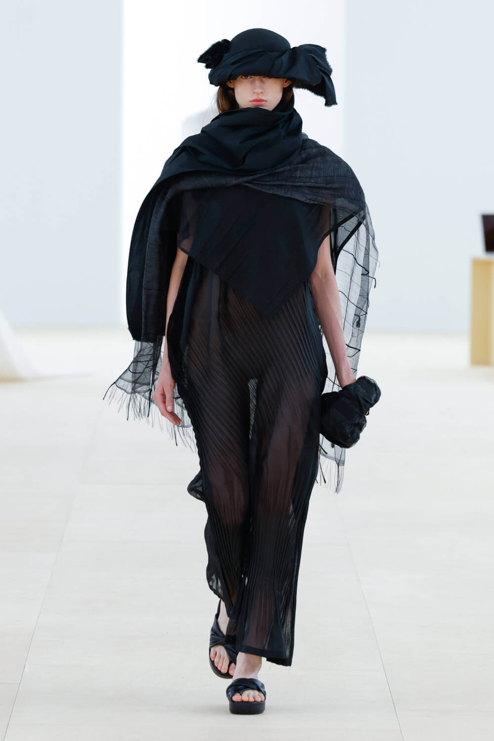 How do you turn ephemeral ideas like light and wind into tangible shapes? That’s the question Satoshi Kondo, artistic director at Issey Miyake, hoped to answer in the brand’s latest runway show. Walking into the space, guests immediately noticed the set, which featured pleated pieces of washi paper, appearing as if they were floating in air. Designed by Yoshihisa Tanaka to resemble membranes, the shapes are meant to move and interact with the air in the room as people pass by. In the center of the runway were musicians, playing soothing nature sounds that were equal parts white noise and cooing bird noises. While the room waited for the show to begin dancers, clad in black and white, interacted with the installations, exploring and laying beneath them.