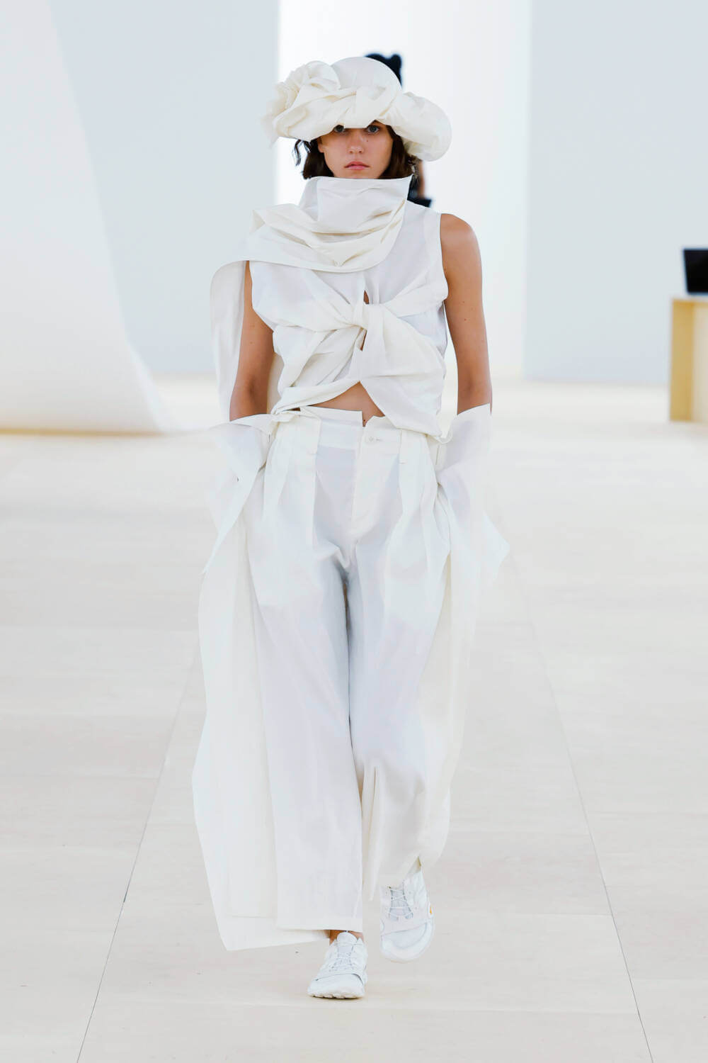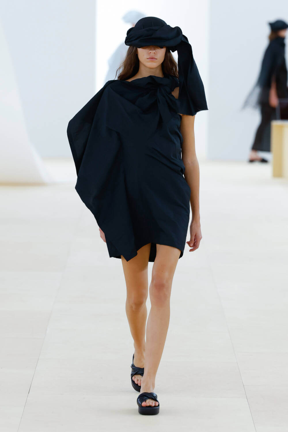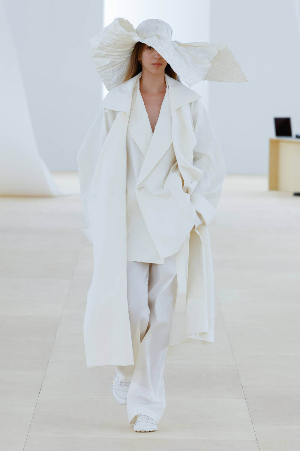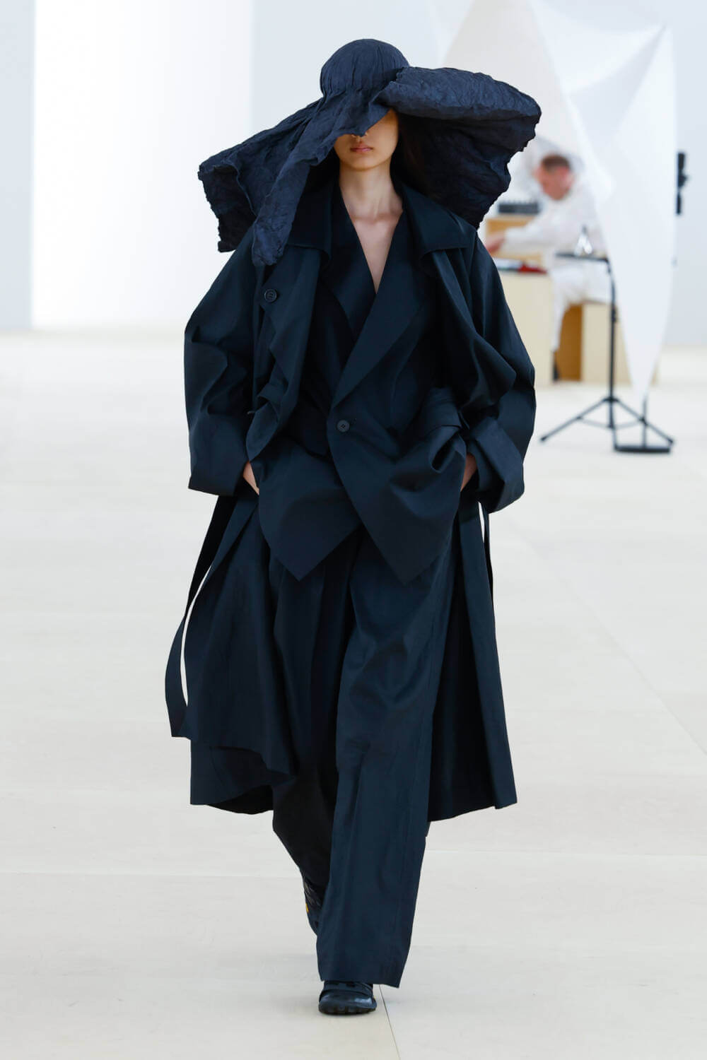 Enveloping, the fourth moment, uses a material that is woven with Japanese washi paper and polyester. Made from one piece of fabric, these twisted and fastened draped dresses play with the idea of depth and shadows across the body. Fixed in Time, the next-to-last grouping of looks have a two-dimensional effect, as if the outfits were pressed and flattened. And finally, to close, Twisted, three looks made by twisting a piece of fabric and designed to resemble as if it naturally formed over the body. Adorned with floppy hats, there was a lightness and ease to them, showcasing Kondo’s deftness in making formless ideas take shape in substantial ways.
