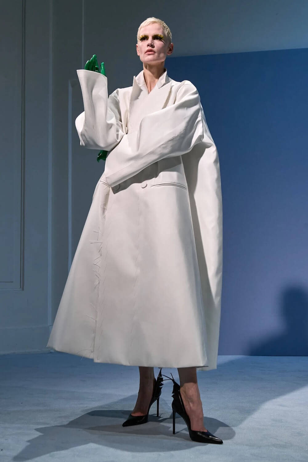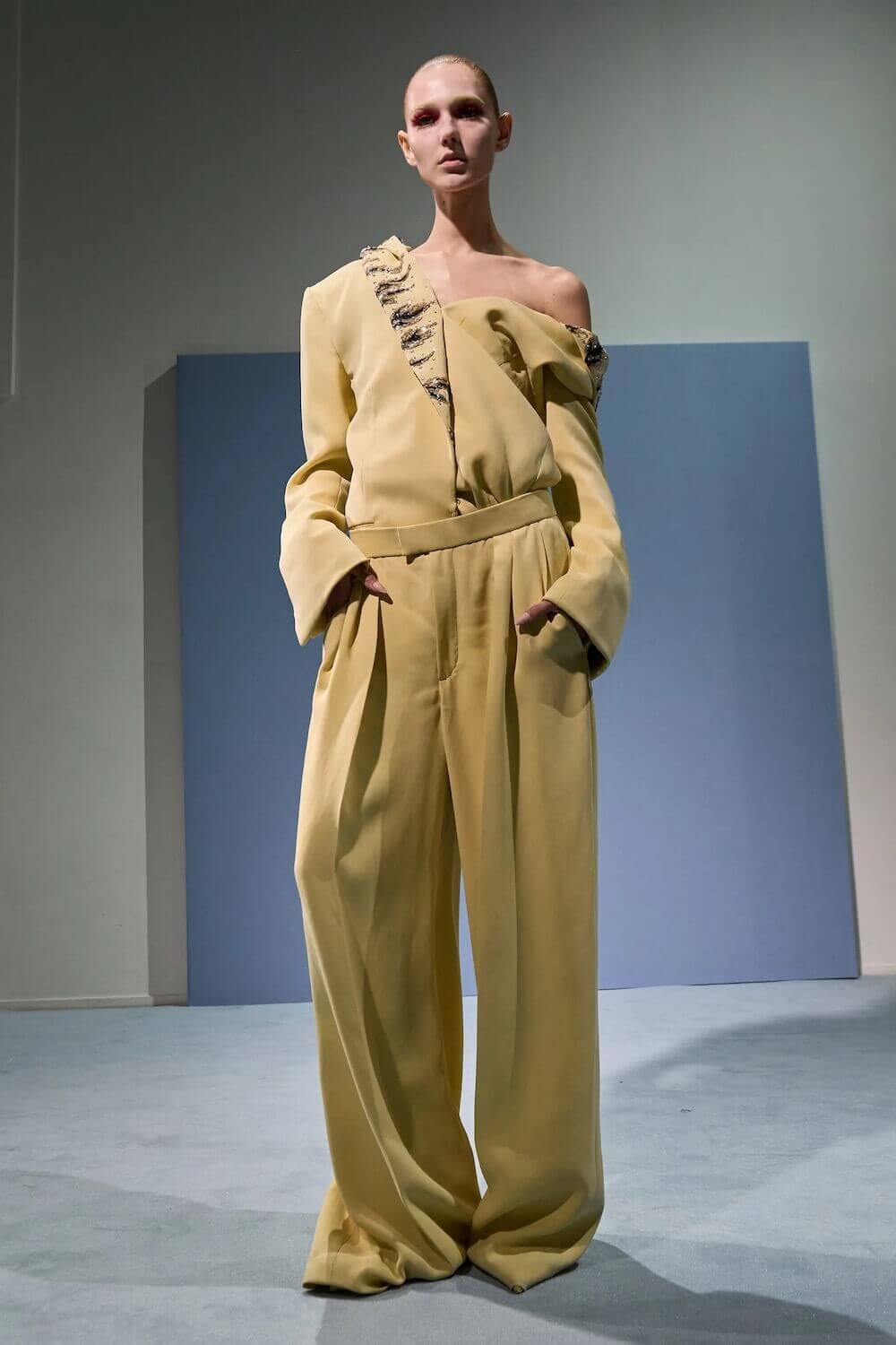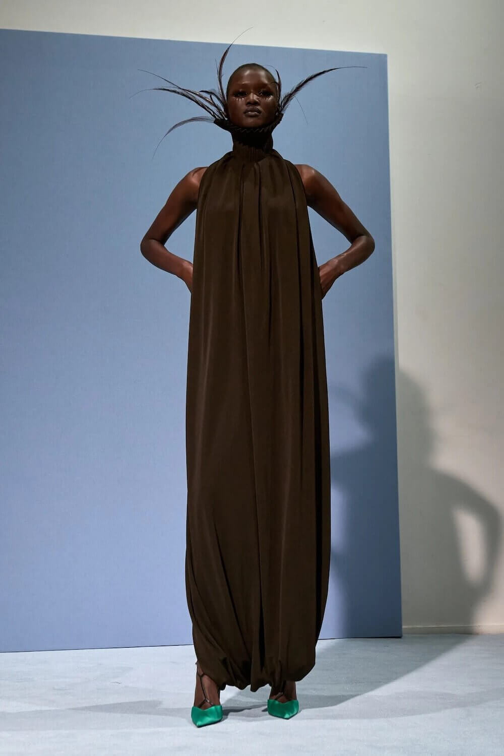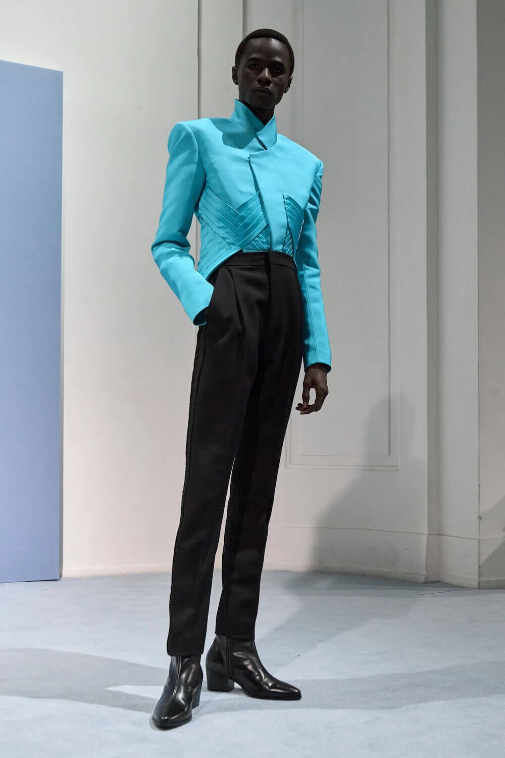 “We know Jean Paul and we know the loudness and the music and the styling. Sometimes you get so distracted by it that you lose the essence and purity of his immaculate work,” Haider Ackermann said before the haute couture show he designed for Jean Paul Gaultier on Wednesday evening. “He was very precise in his tailoring. All the construction, when I go to the archive, it’s just sublime. I wanted to bring back this purity.” The fourth collection under Gaultier’s seasonal invitation concept, it was the most minimal to date: ravishing razor-sharp suiting, exquisitely sculpted evening tops and dresses, and sportswear amplified through the techniques and fabrication of haute couture. “You have to look at the feathers,” Ackermann said, referring to the plume that exploded from the necklines of suits. “It’s beyond beautiful. In 1987, Jean Paul did his first couture show and one of the looks I really remember was a black tailored jacket with parrot feathers. It always stuck in my mind. So, when they called me, it was the first thing I thought about.”