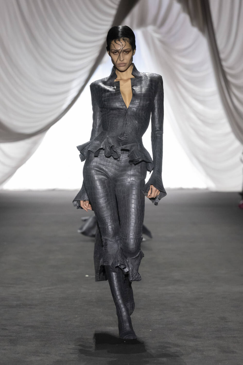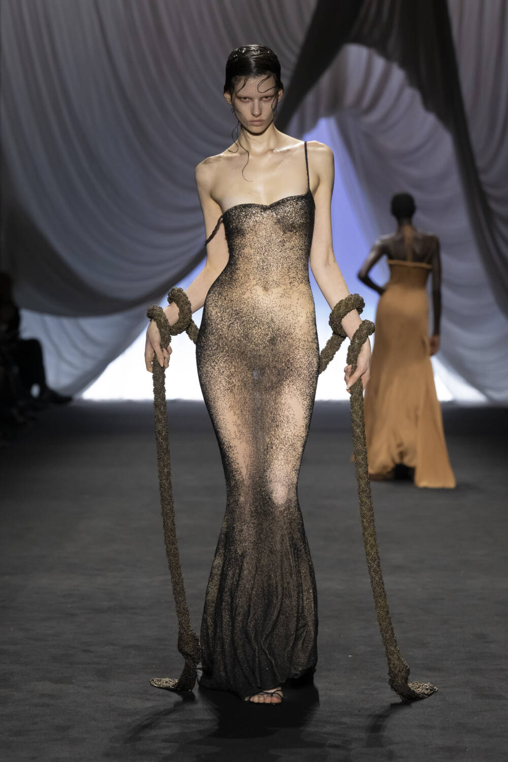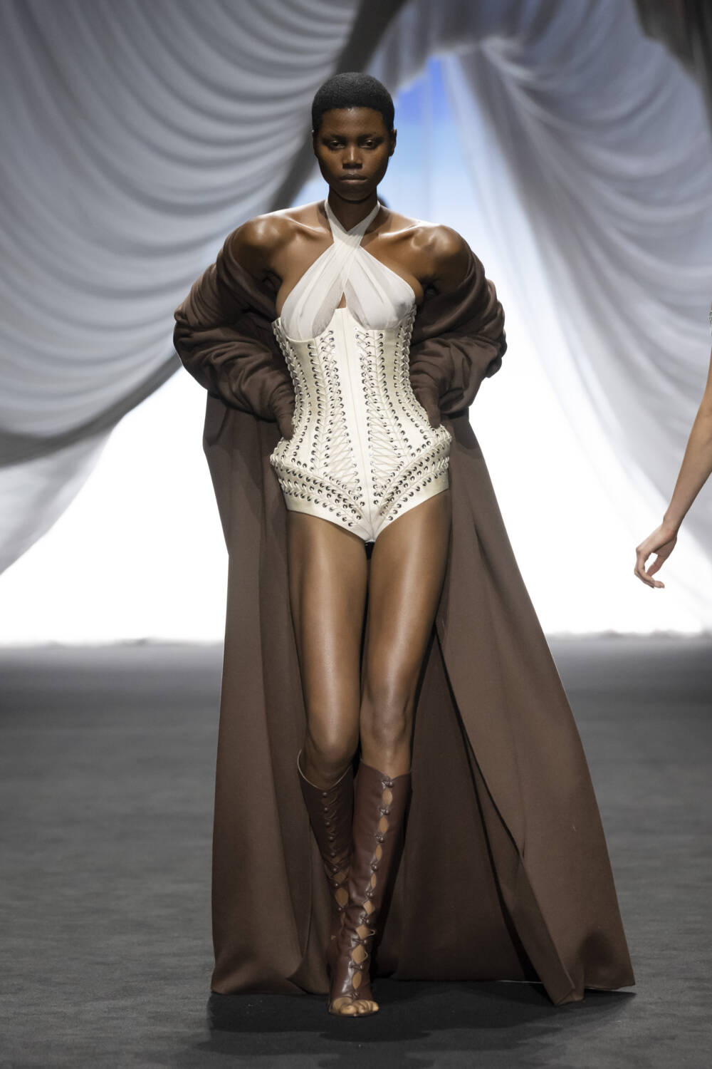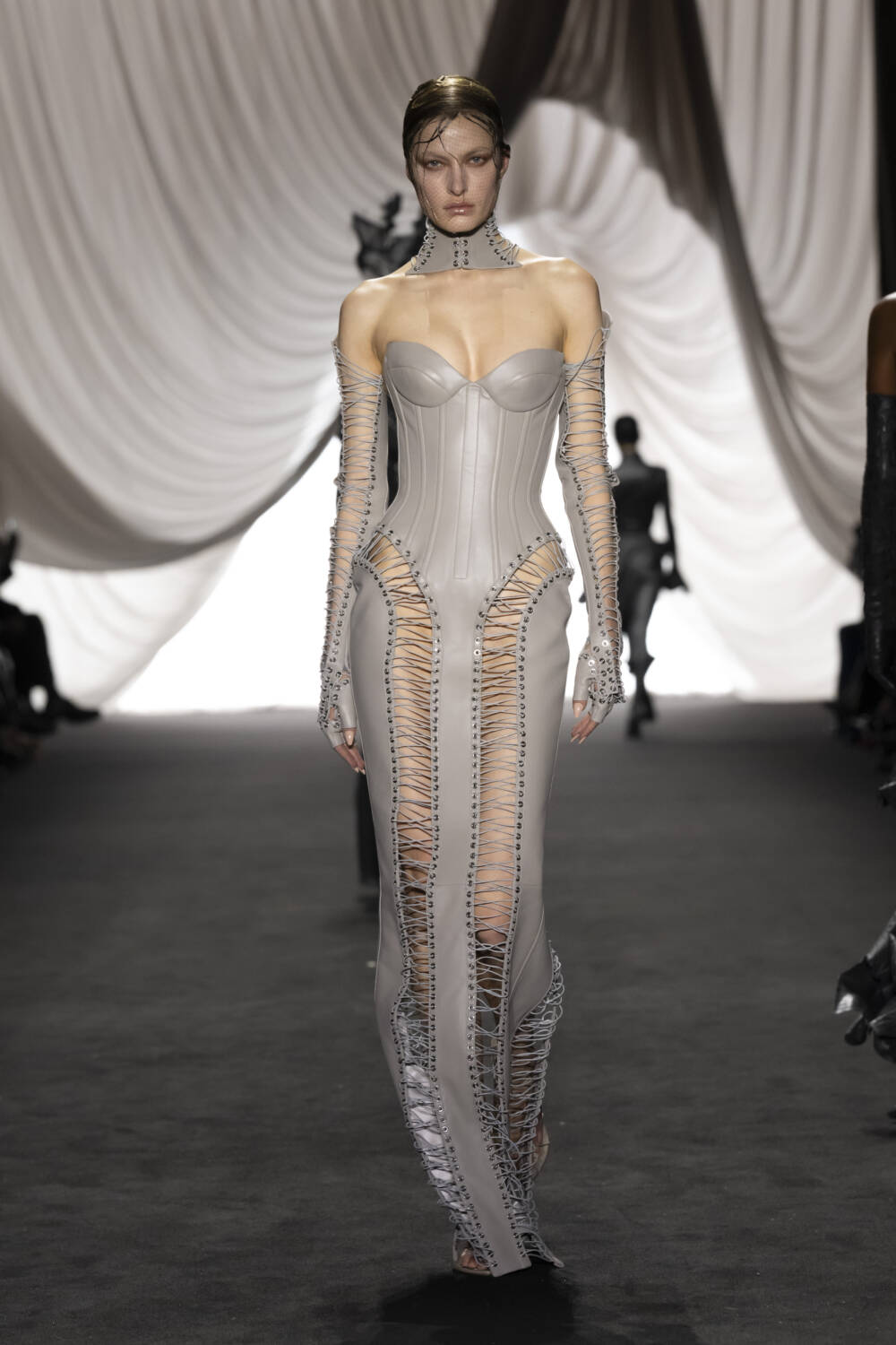 Throughout, the Belgian designer honoured Gaultier’s signature eroticism and theatricality, but filtered it through his own lens of stripped-down sex appeal. Corsetry, a shared obsession of both designers, took centre stage, and each look took on its own character, from Mélusine’s verdigris satin duchesse bodice with tarnished metal-beaded netting to Jeanne’s lambskin column gown, bound by 75 meters of nappa leather lacing.