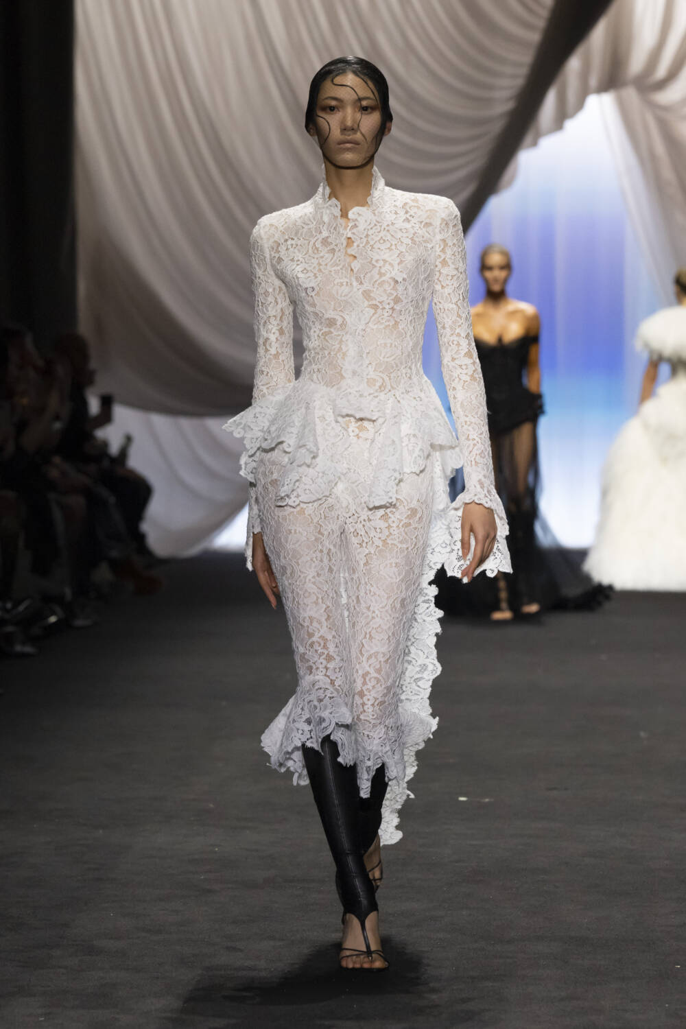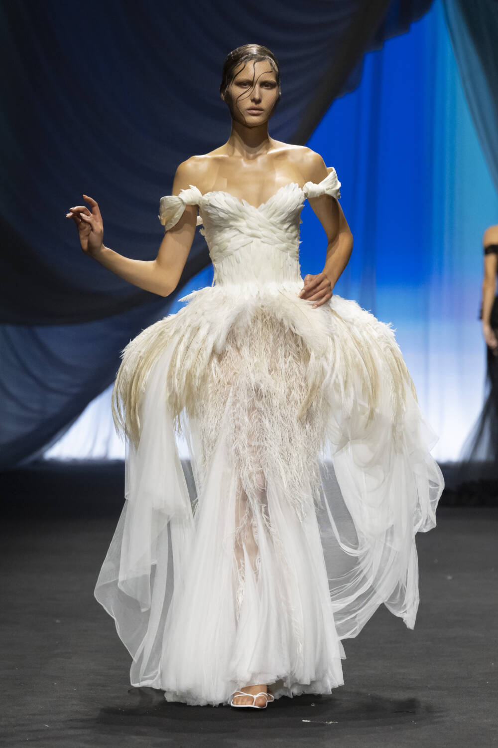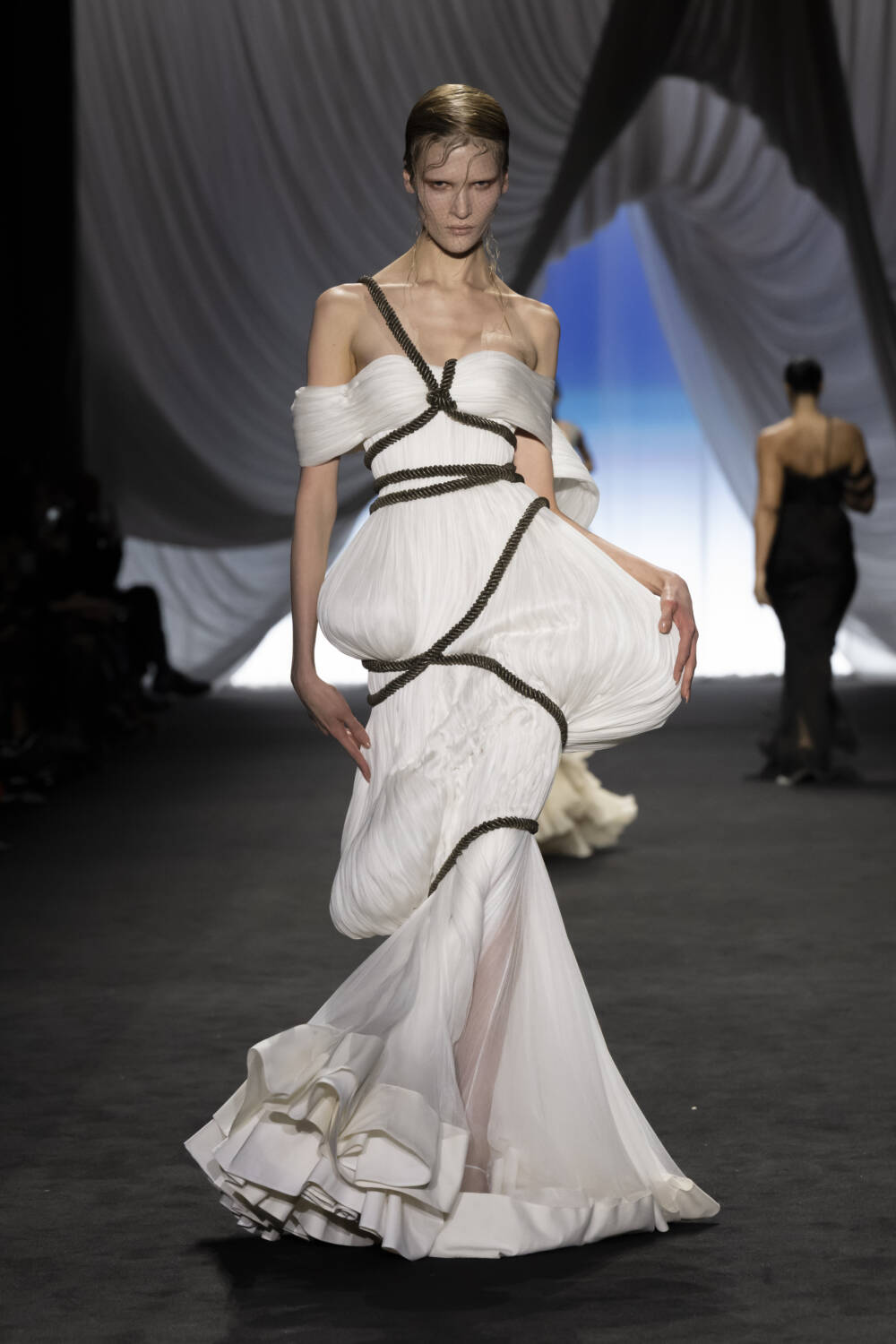 The collection was a masterclass in contrasts too: fluid mousseline sat against rigid tailoring, while raw textures collided with meticulous embellishments. The Captain’s Swarovski-strewn silk mousseline mermaid skirt glistened like wet skin, while The Virgo’s crystal-mesh net shimmered like a siren’s snare. Ariel, in direct reference to The Little Mermaid, donned a bundle-draped ivory dress bound by 12 metres of rigging rope spun with weathered metal sequins. Then La Mariée, the final bride, floated down the catwalk in a goose and ostrich feather-embroidered corset and organza train.