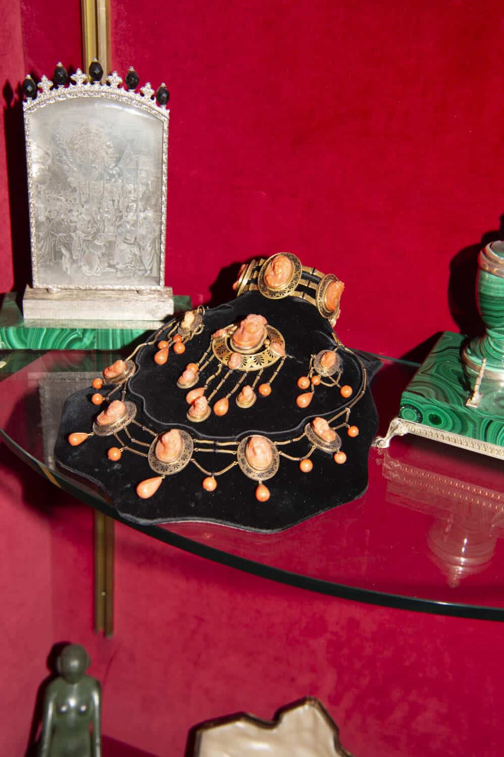 The Alfredo Ravasco collection, made between 1930 and 1950, which is on display and open to the public, is one such example. A presentation ring given by the Austrian Emperor Franz Joseph as a special prize to students and luminaries and a cameo bracelet given by Napoleon to his biographer during his exile on the island of Saint Helena are others. Elsewhere, an Egyptian Revival platinum set in its original box and chains full of charms made in Naples in the 18th century to ward off evil spirits also hold a special place in the safe.