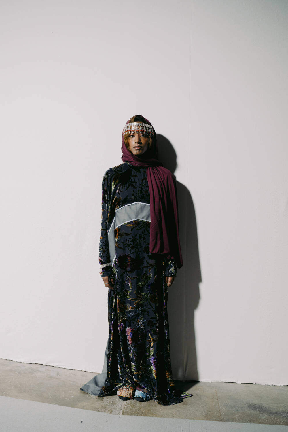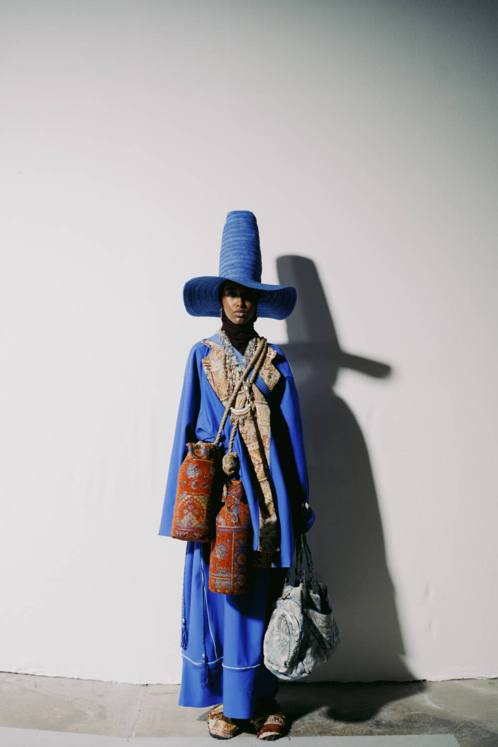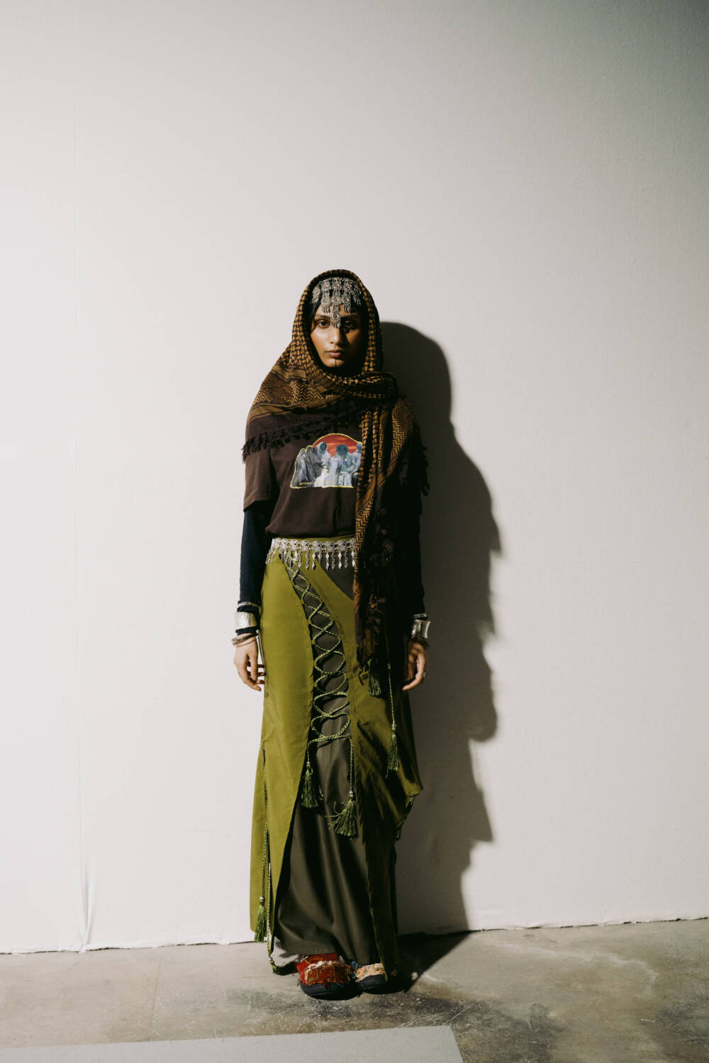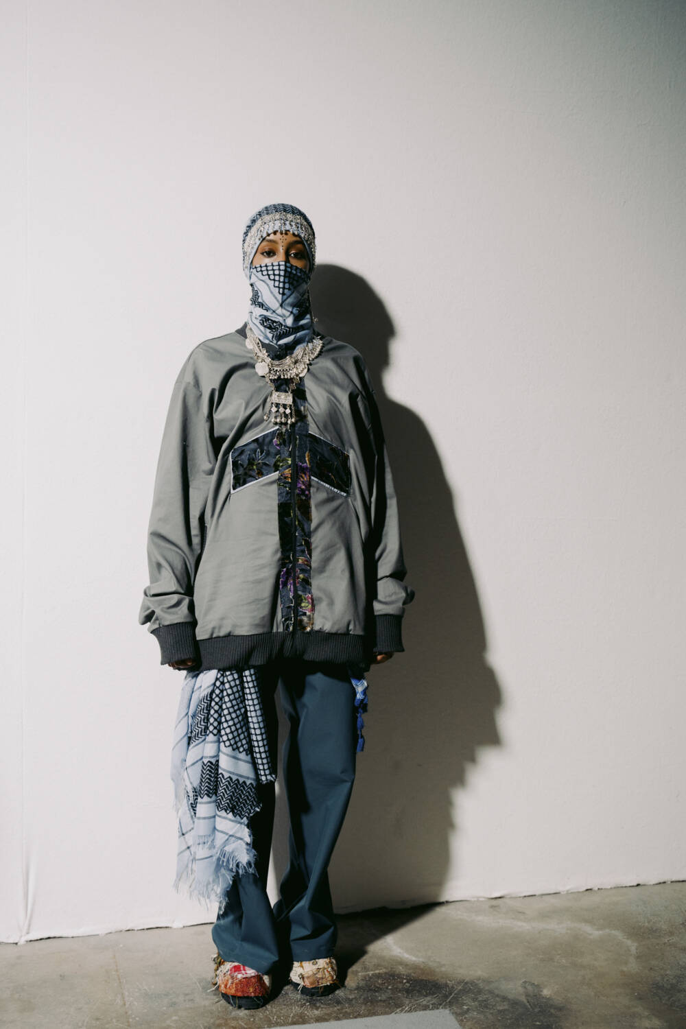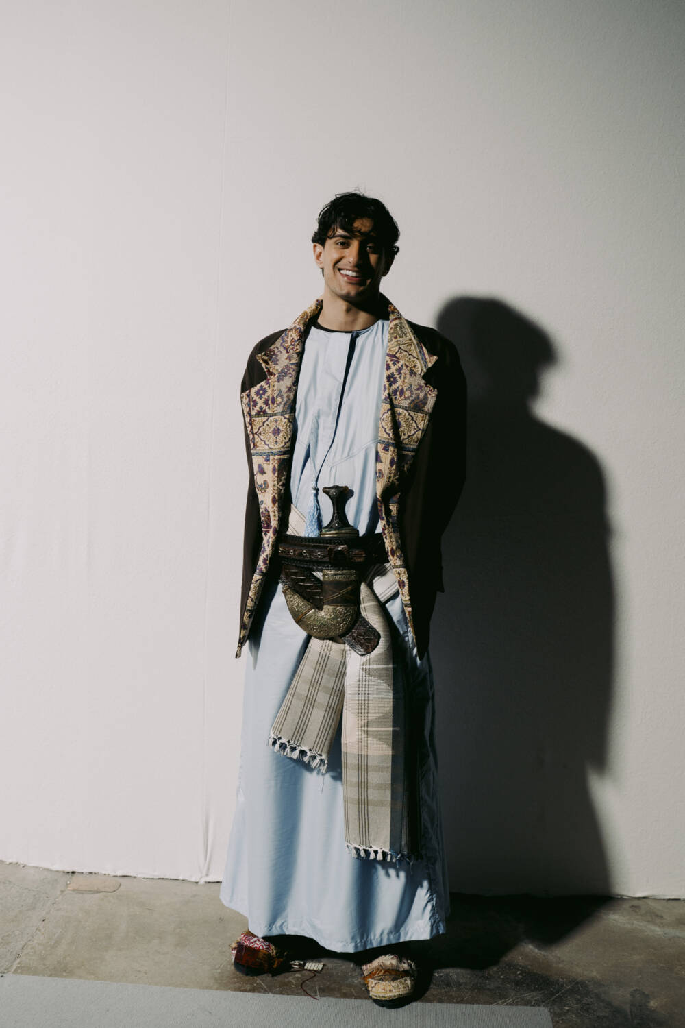 Walking down the slanted slope of the BFC Newgen space for Kazna Asker’s presentation yesterday meant being greeted with welcome sights and resonant sounds. The Tottenham-based designer, who roots her practice in themes of migration and a contemporary expression of traditional Yemeni dress, made the inspired decision to transport guests to a mock souk in the heart of Yafa.