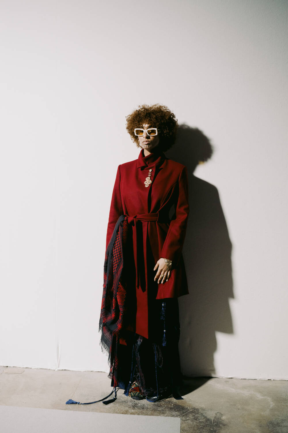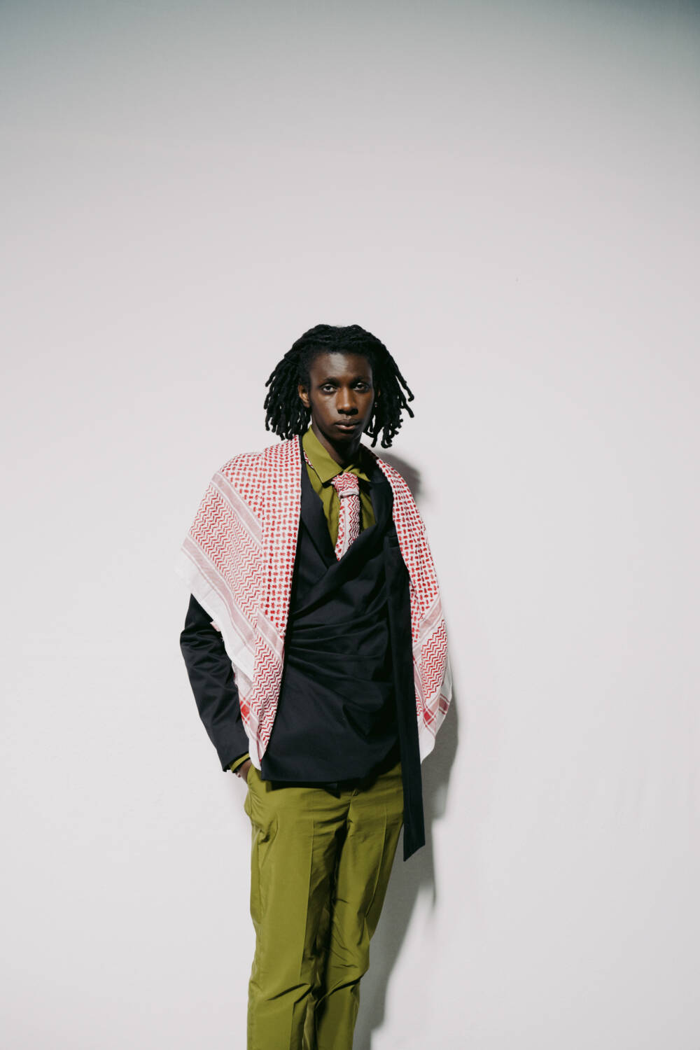 In true Asker style, the garments were heavily moulded around classic Middle Eastern dress, but with a sportswear twist. The Abaya, a fluid dress, was updated using contemporary draping techniques, whilst the menswear saw Asker blend cloaks and thobes with loose-fitting track jackets. Pieces were crafted using traditional upholstery textiles with sharp injections of cobalt blue and rich red. It was a warm embrace of the cross-cultural experience; a love letter written with fabric, stitched together with heart.