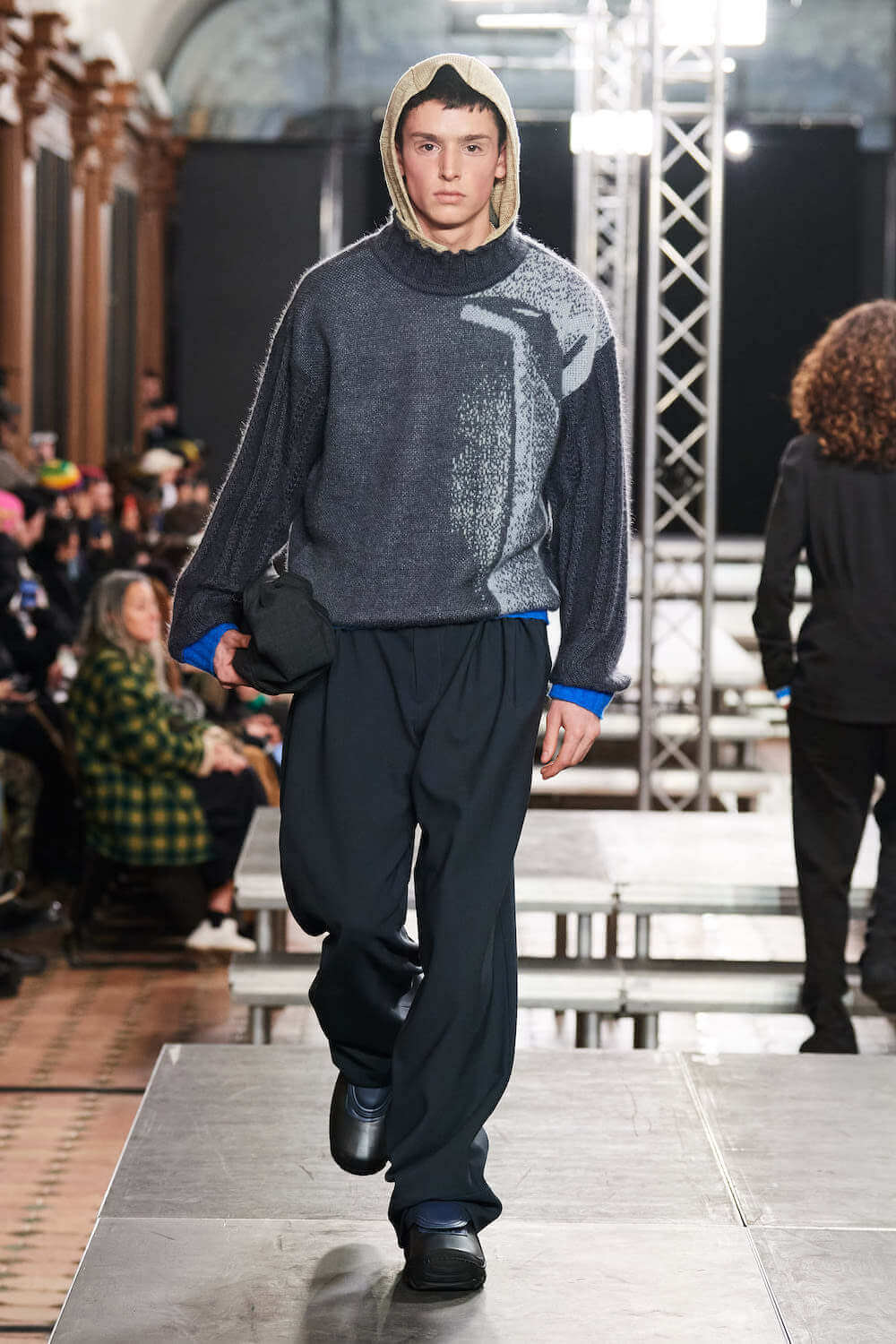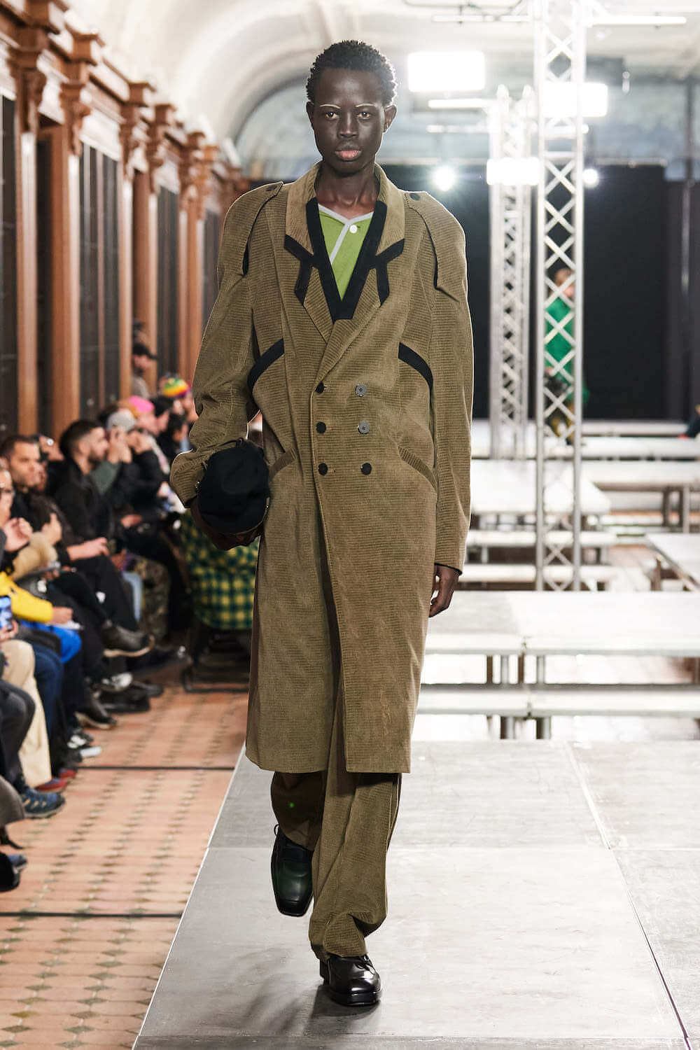 Kiko Kostadinov strived to make something new this season. Something that could simultaneously be turbulent, unsettled and vying for release, whilst also thriving inside the restrictive citadel of “menswear”. Chiselling away at its edges, Kostadinov applied a revisionist slant to four forgotten figures of the avant-garde Italian womenswear design canon. The unsung influences of French-born designer Anne-Marie Beretta (who designed Max Mara’s distinctive 101801 camel coat), Milanese titan (by the late Mariuccia Mandelli), the American costume designer Irene Lentz and the Roman couturier sisters Sorelle Fontana, mingled with gestures from the graduate collection of Laura and Deanna Fanning – Kostadinov’s closest collaborators – who design the brand’s womenswear line.