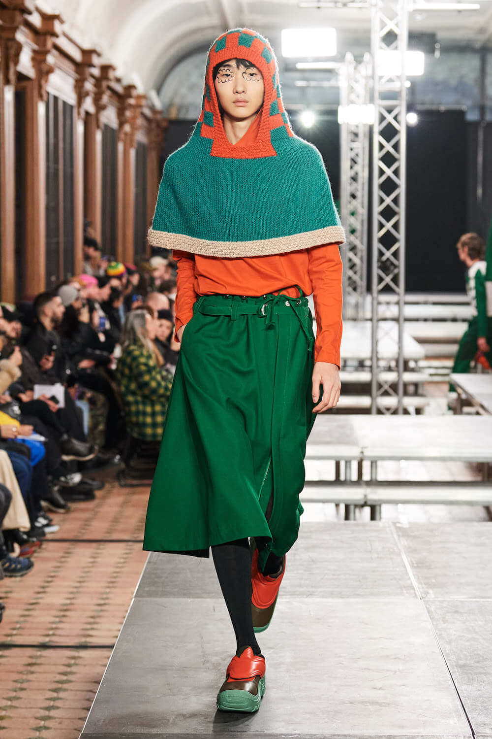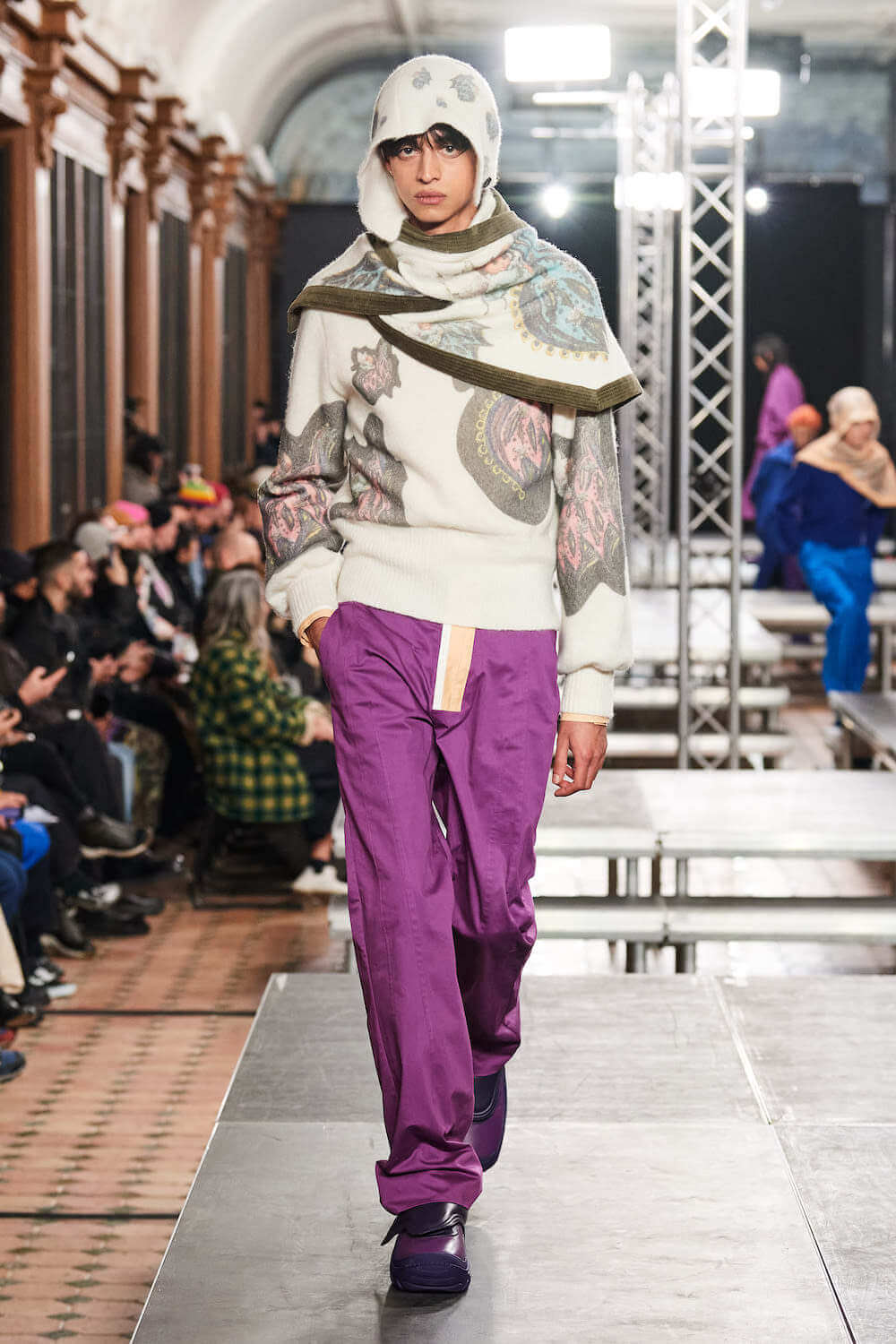Fragments of figurative canine forms and abstract colour fields by London-based Estonian painter Mariann Metsis were applied as digital prints to intarsia knitwear and sculptural hardware, implemented in the same way Krizia incorporated animalia into her own collections. Elsewhere, the recurring blanket scarf and hooded garments echoed the opus of Beretta.