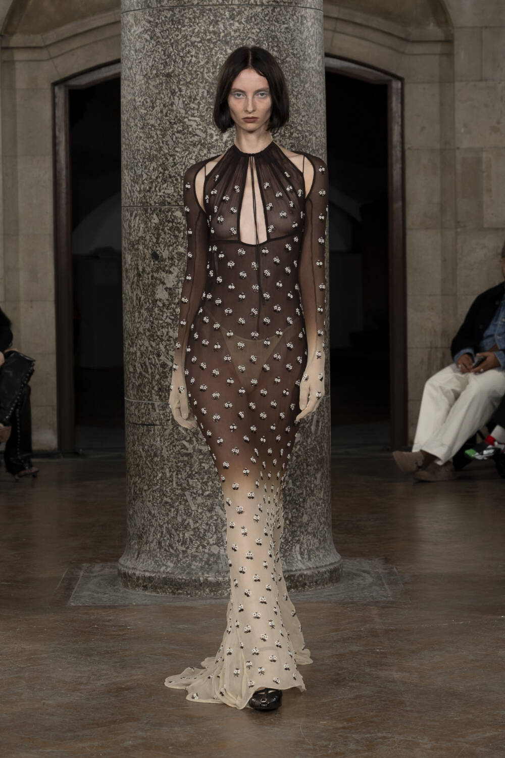 Co-creative directors Charlotte Knowles and Alexandre Arsenault looked to design greats like Madame Grès and Azzedine Alaïa to better understand their sartorial codes. The homework paid off in spades, translating into gorgeously gathered silk jumpsuits and gowns, sculptural outerwear and grungy biker leather sets that all fit snug as a bug. The cherry on top of a delicious sundae, chic intergalactic hats came courtesy of legendary milliner Stephen Jones who admired his handiwork from the FROW.