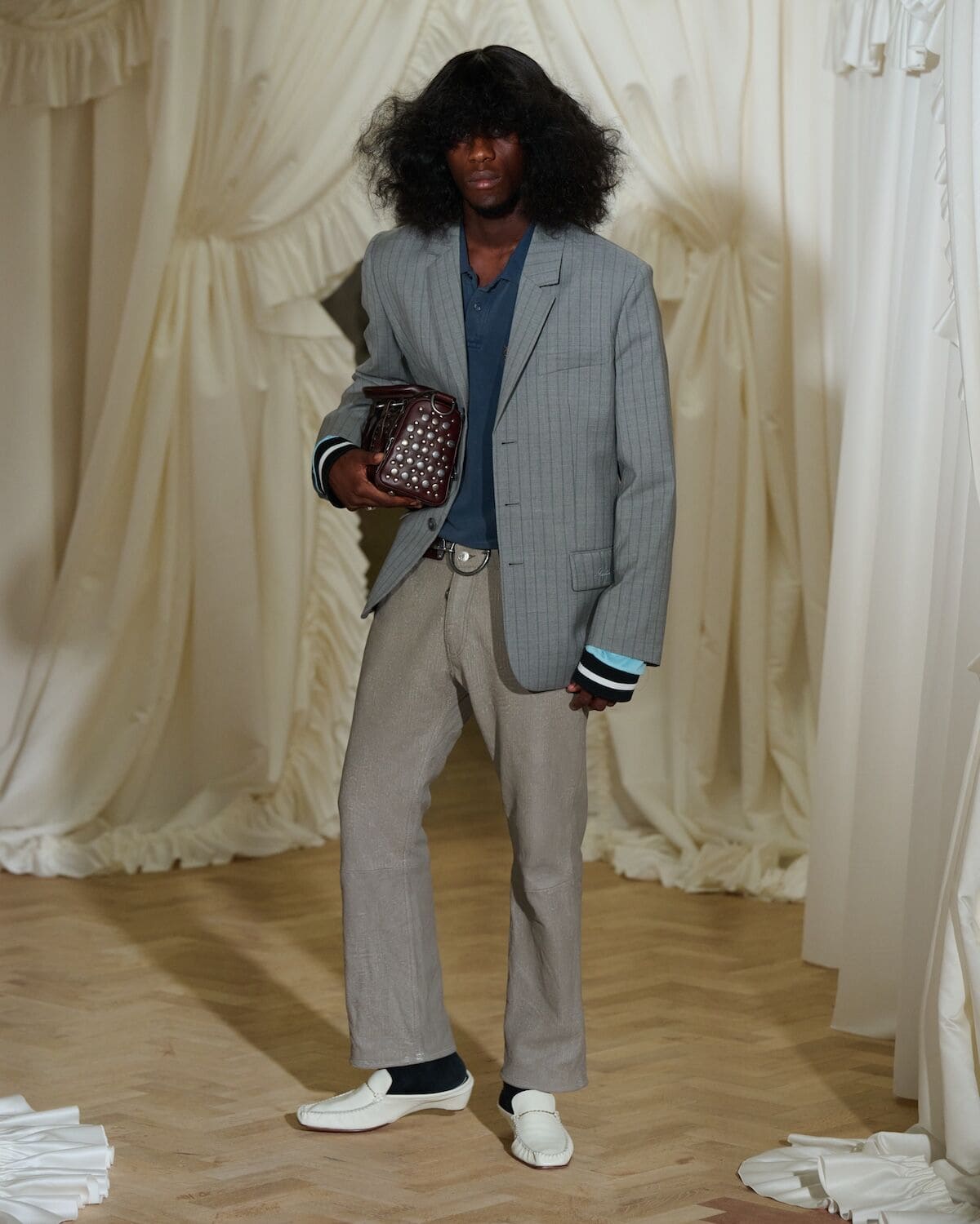 She had turned the floor above into her own version of a couture salon, draping the banal space in silky white curtains. The overhead office lighting and shutter blinds brought the transportive space back down to reality; Rose has always found ways to exaggerate the mundane into something rather spectacular. The same could be said for the clothes on display. Rose, one of the first to take menswear to oversized realms, proposed a new shrunken silhouette. Parkas, Harrington and leather jackets were suctioned close to the body – “everything feels too tight, slightly awkward but somehow still sexy,” says Rose.