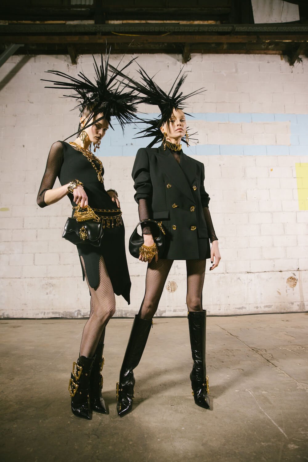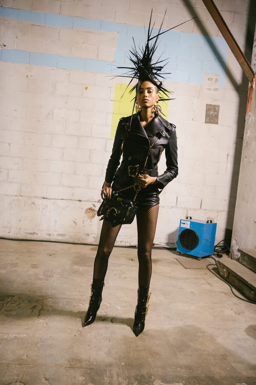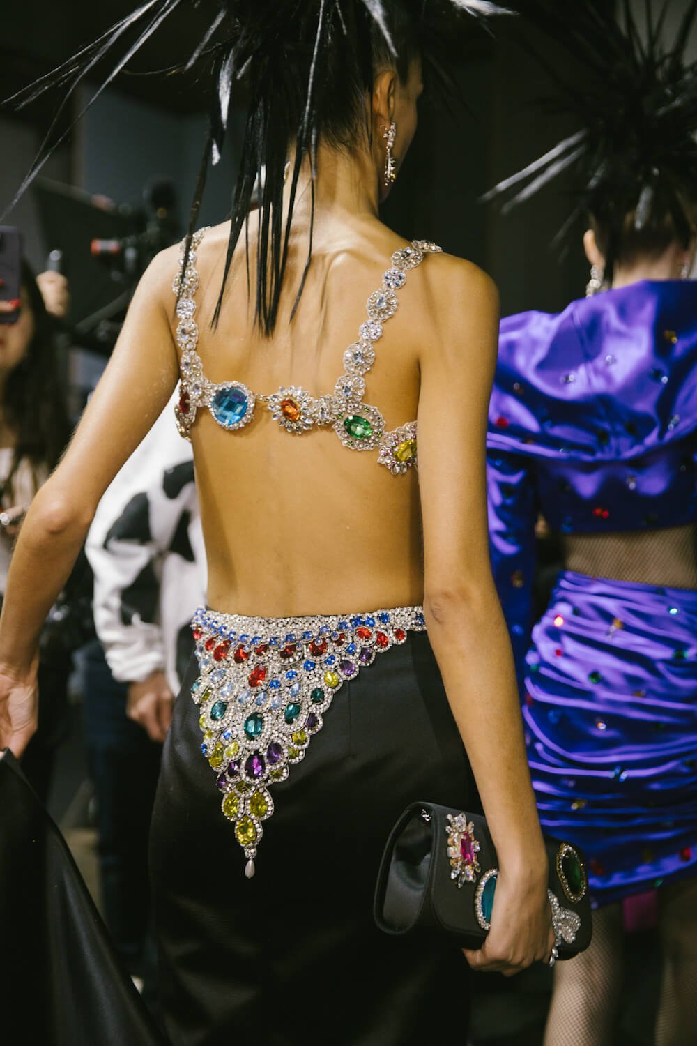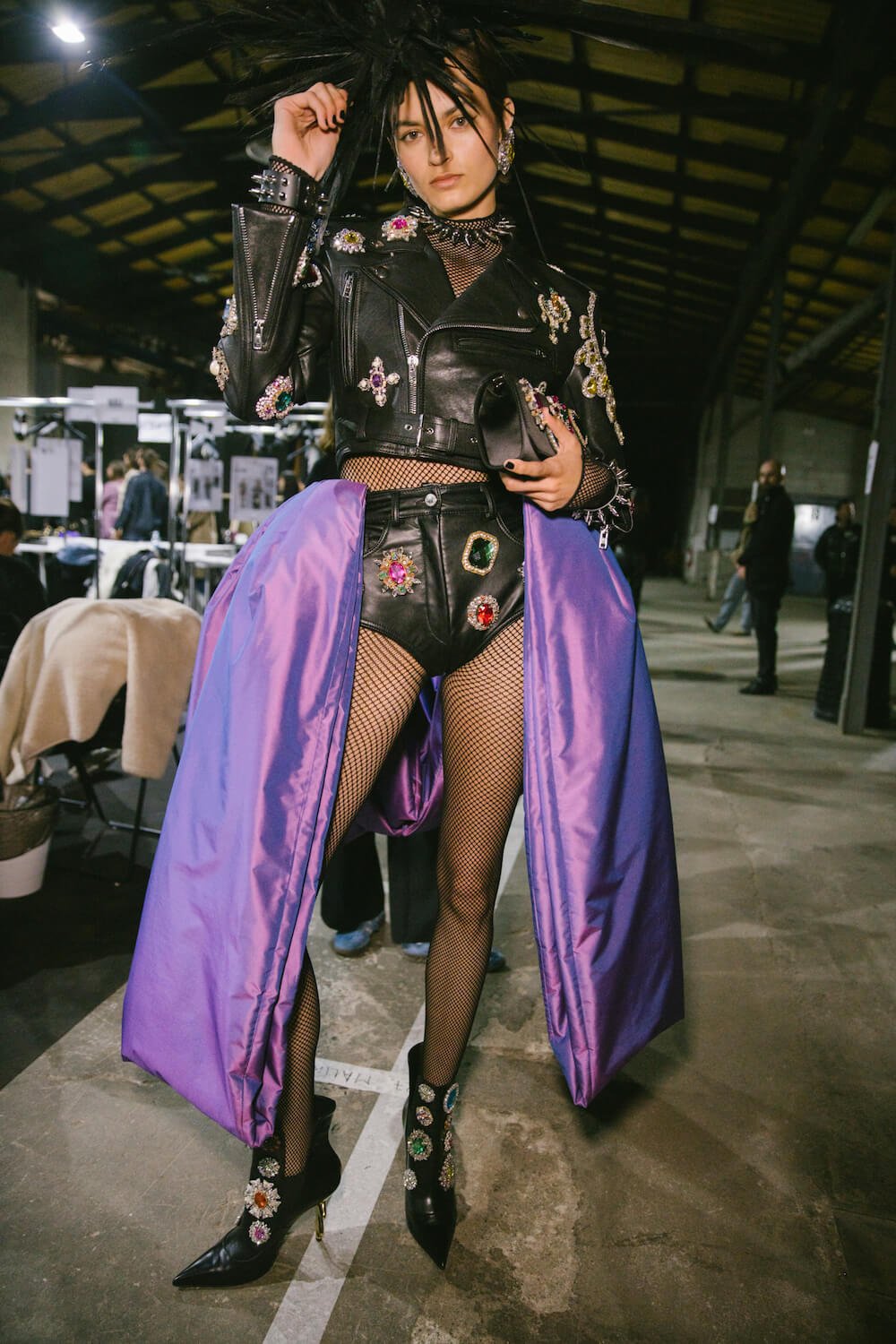 In Moschino’s world, decadence and destruction live in harmony. Shimmering gold red carpet dresses came torn like fishnet tights and purple trains spilt from biker inspired leather twin sets. You could say the overall look was as if a punk was off to work at a big city job. Or if she was attending a swanky soirée with plans to tear the whole place to the ground. It made for glamorous dressing with serious bite.