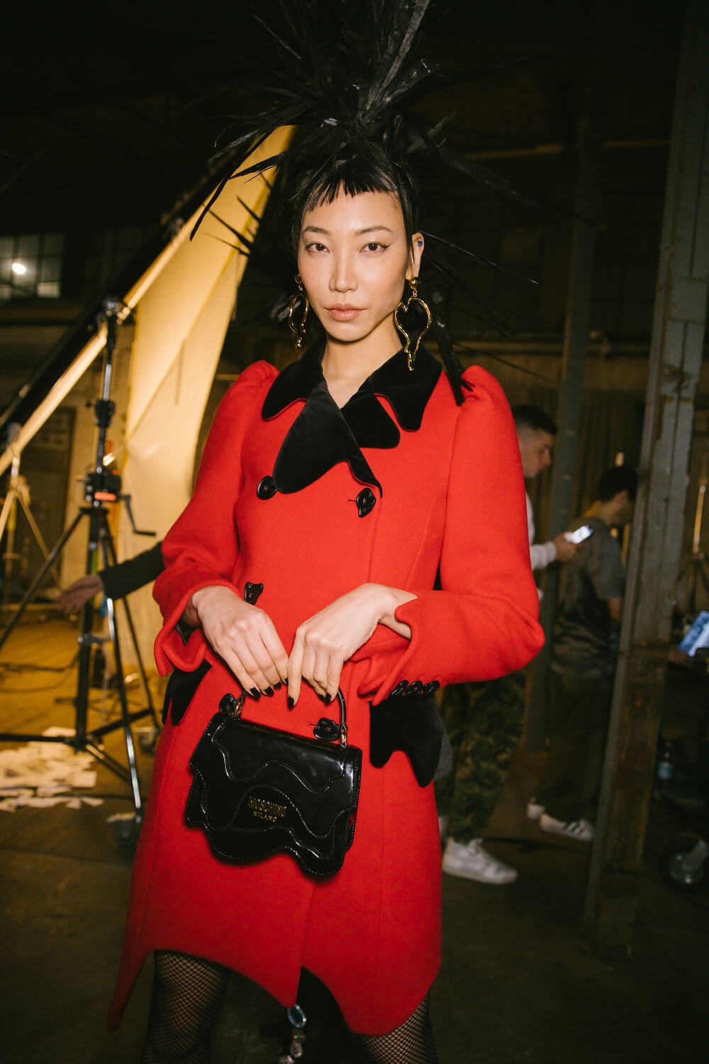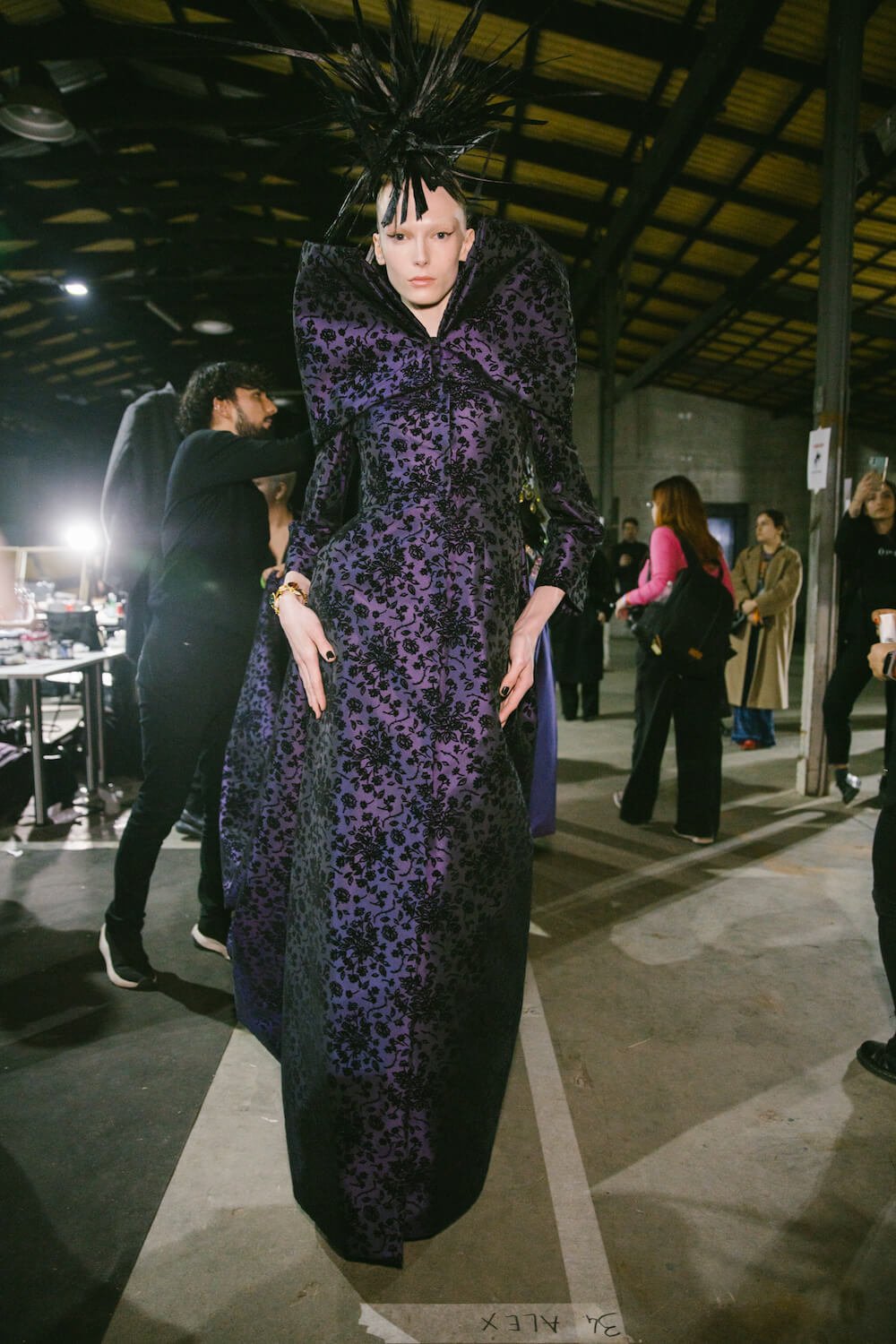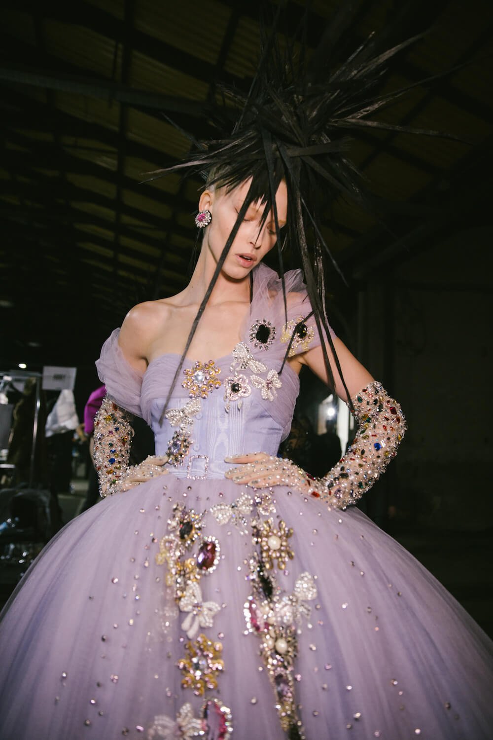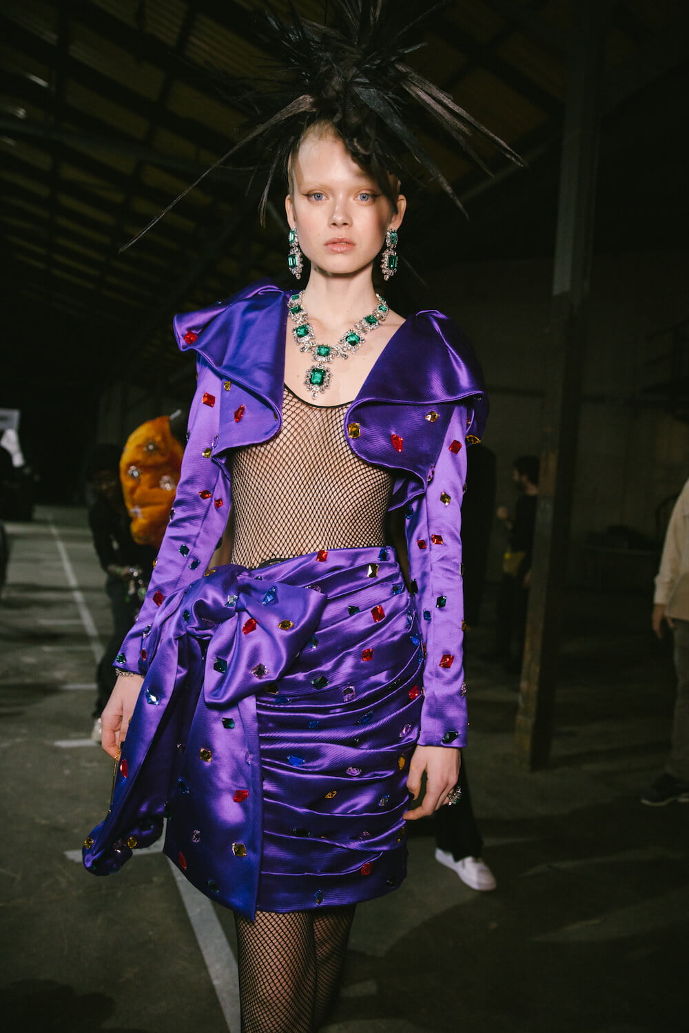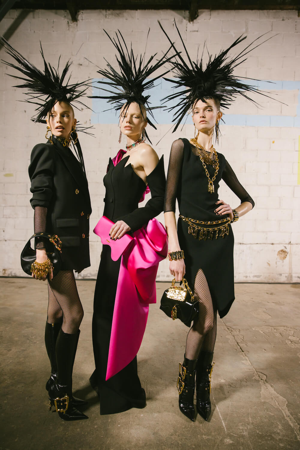In Moschino’s world, decadence and destruction live in harmony. Shimmering gold red carpet dresses came torn like fishnet tights and purple trains spilt from biker inspired leather twin sets. You could say the overall look was as if a punk was off to work at a big city job. Or if she was attending a swanky soirée with plans to tear the whole place to the ground. It made for glamorous dressing with serious bite.