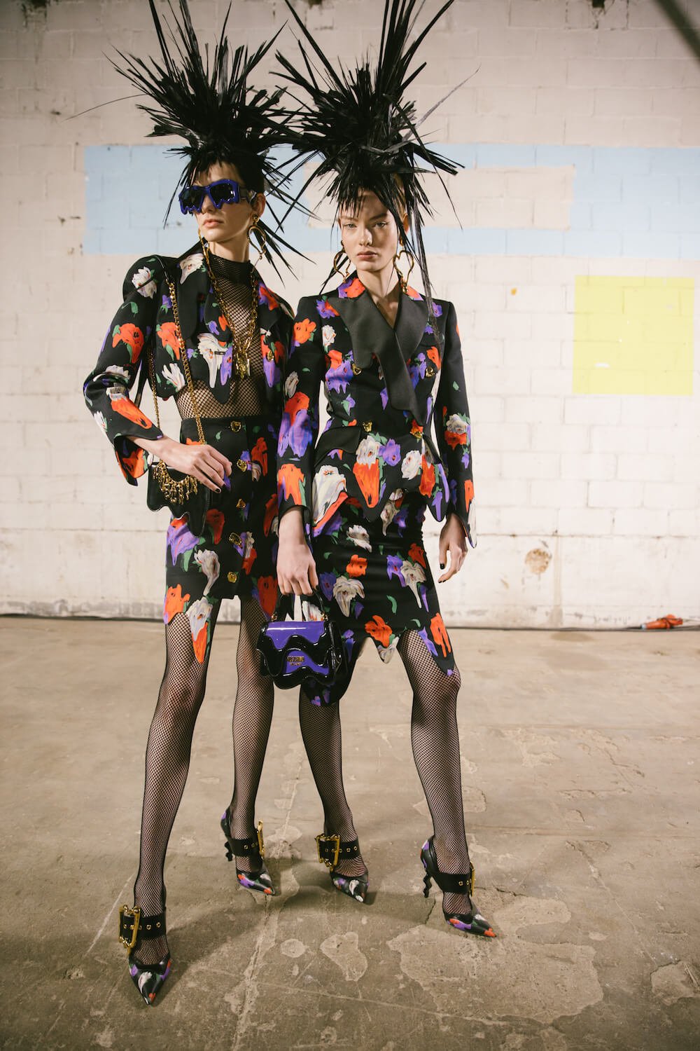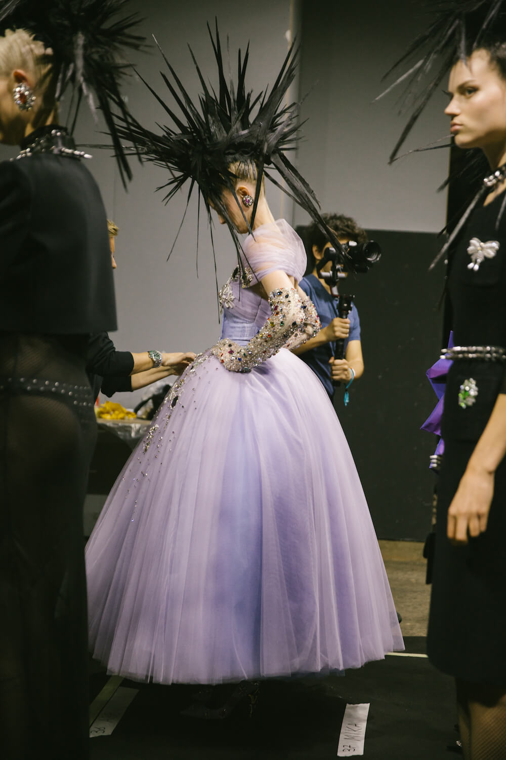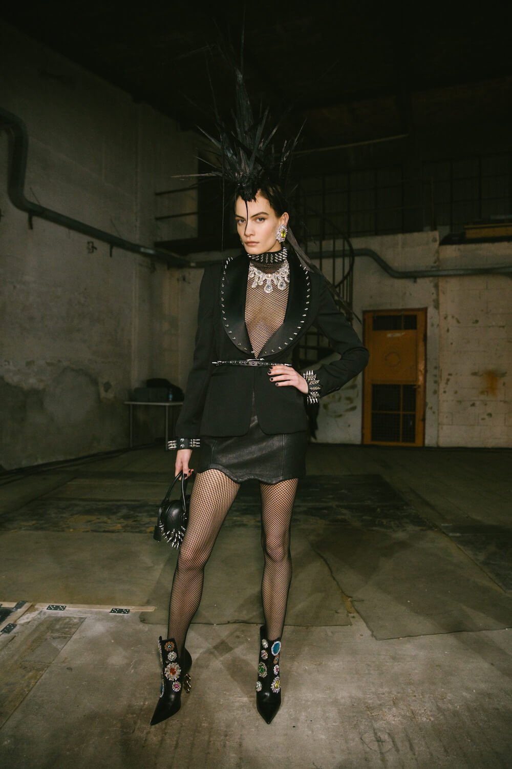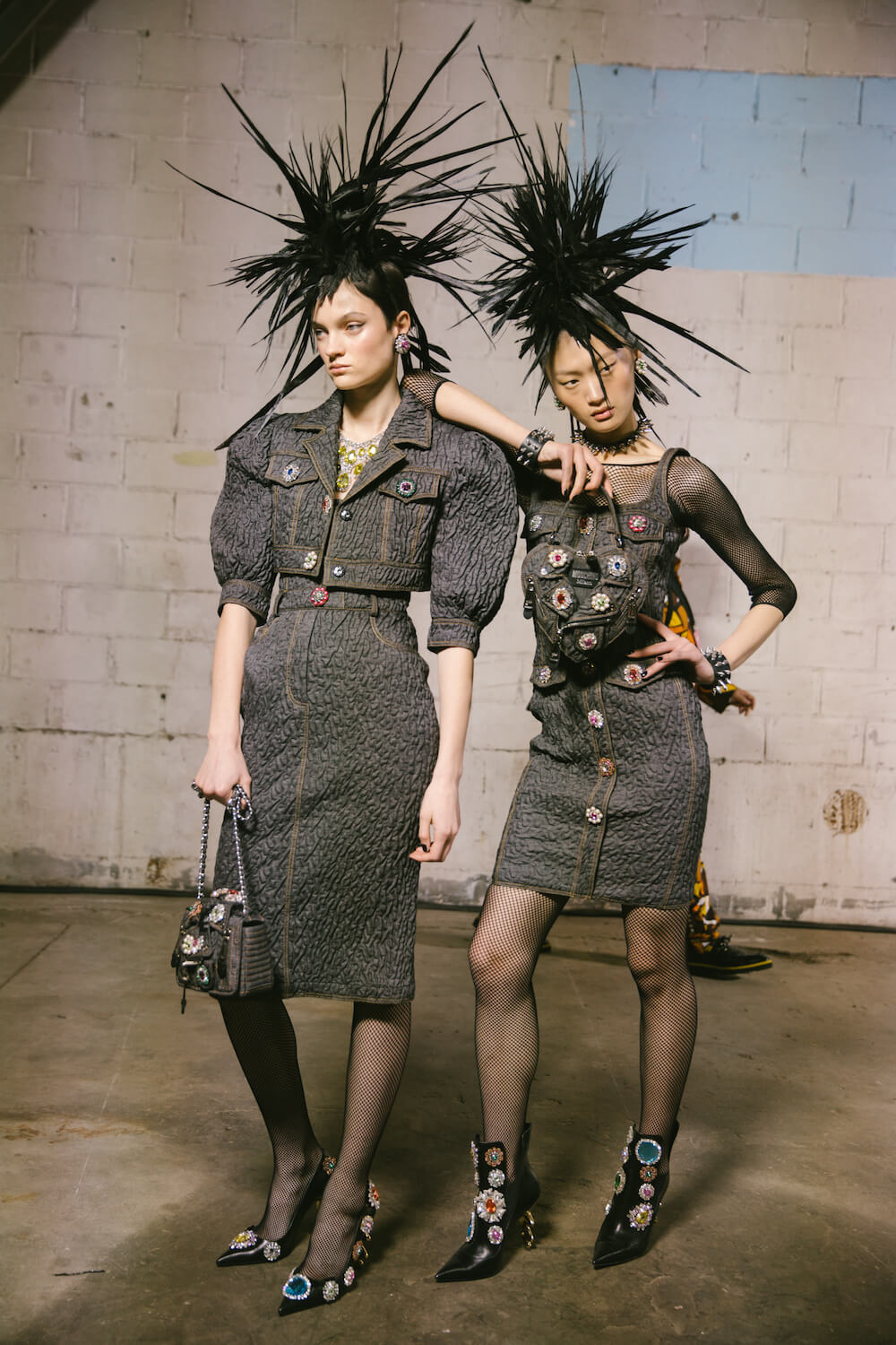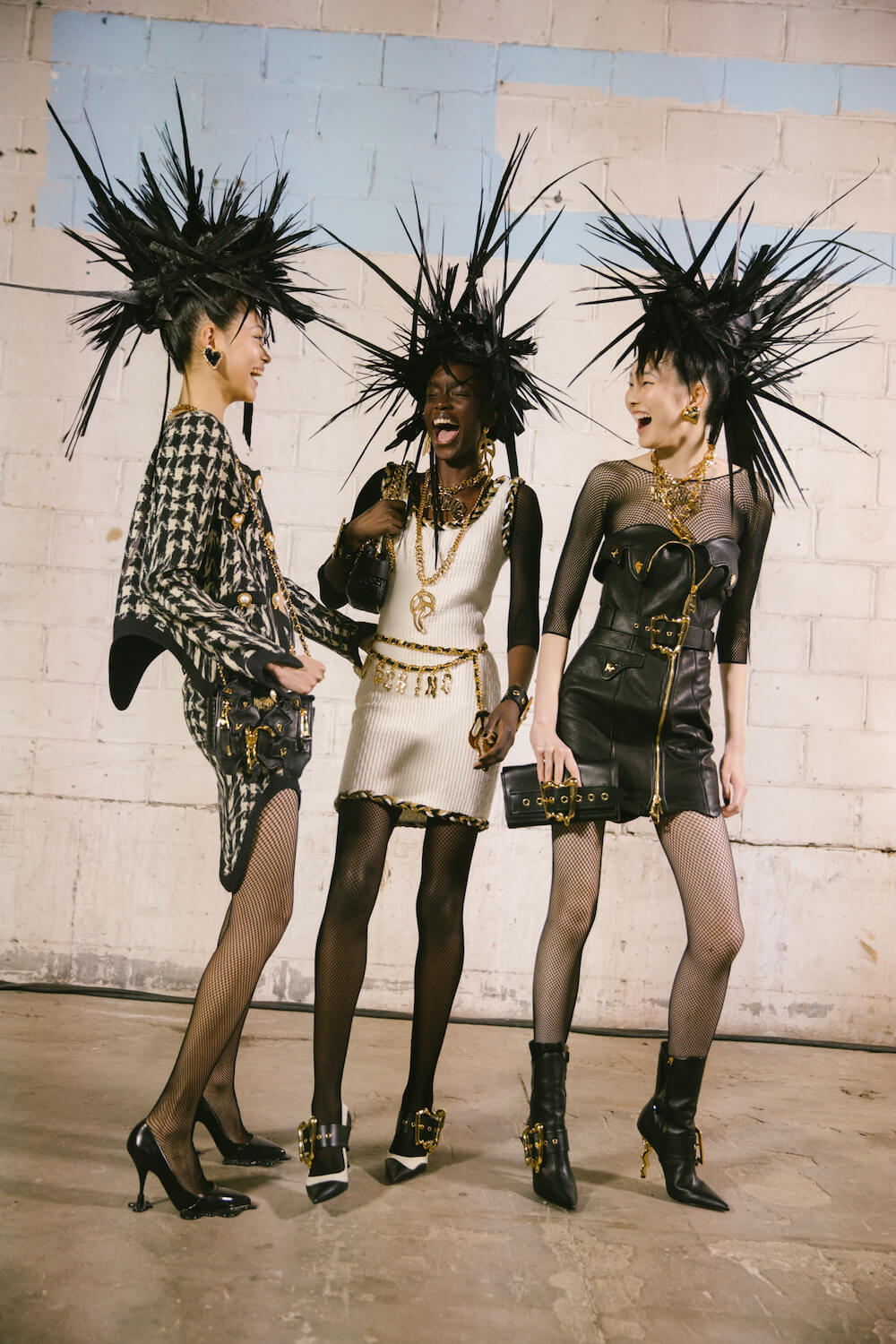 Jeremy Scott is an anarchist in his own right. He has long stuck a firm middle finger up to snooty, fashion purists with his thematic collections which are at once clever, witty and irreverent. His latest Moschino outing saw the designer clash aristo-punk spirit with surrealism, inspired by the work of Salvador Dalí. His models channeled Siouxsie Sioux with their sky-high, oiled-up mohawks and jagged up-dos. Their wardrobe of choice mainly consisted of classic Franco Moschino skirt-suits which looked like they’d been shot through an acid trip, fashioned from warped houndstooth and melting florals. Supersized spikes and XXL jewels lined sharp tailoring, velvet evening gowns and violet prom dresses that came frosted with diamonds.