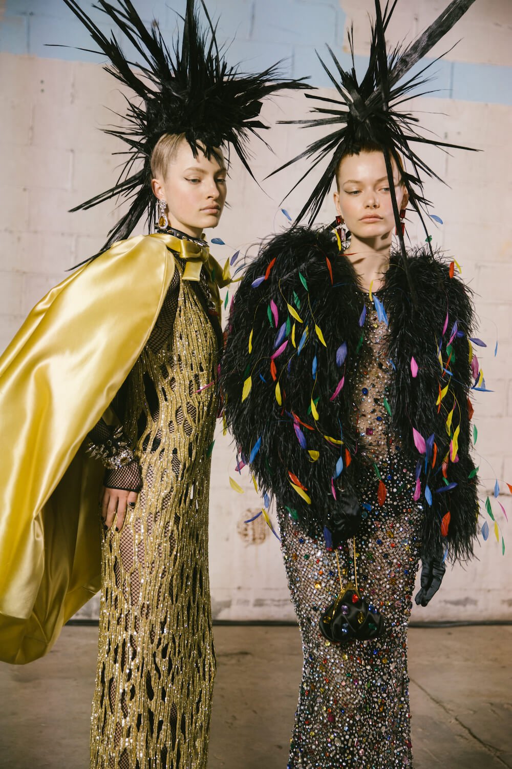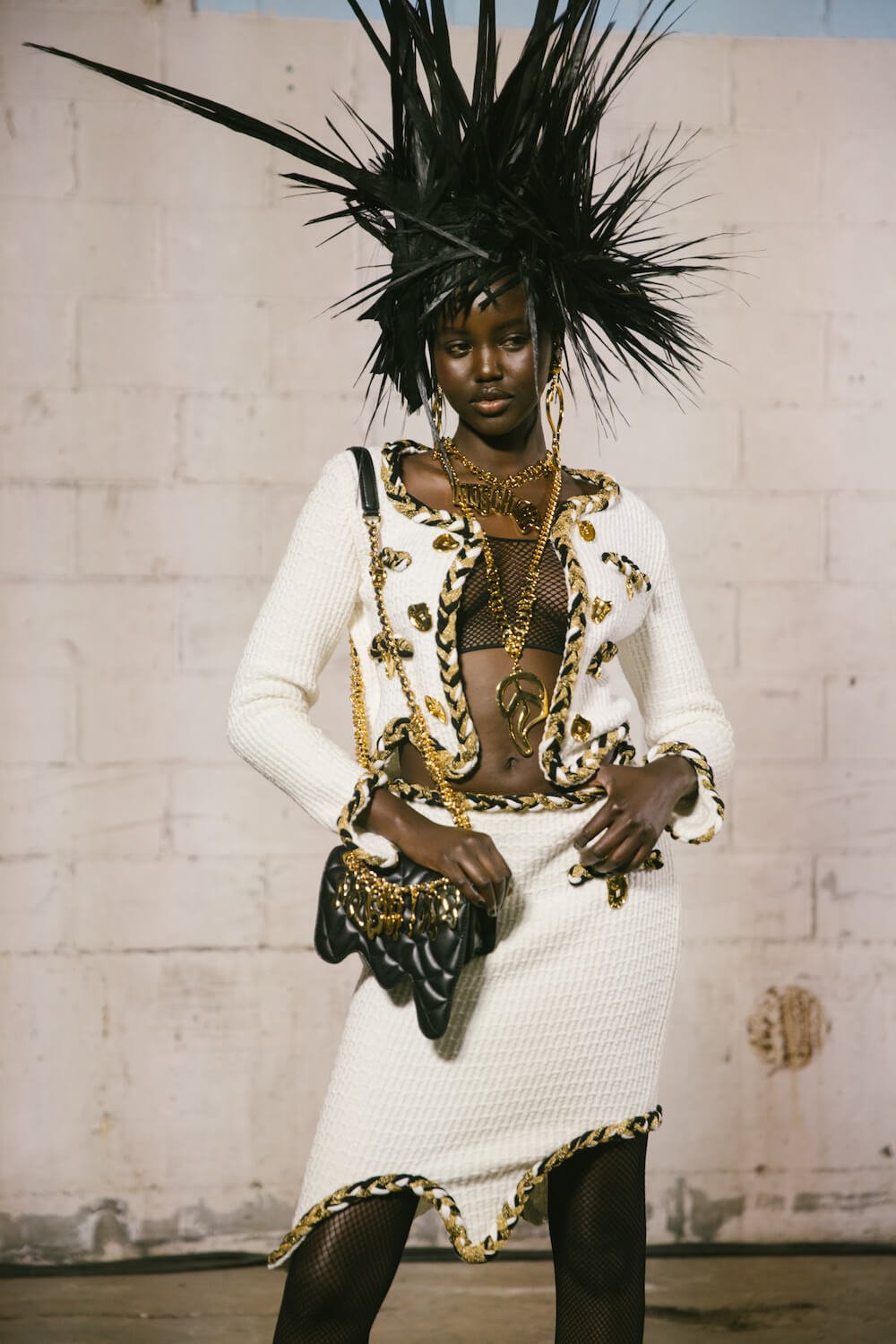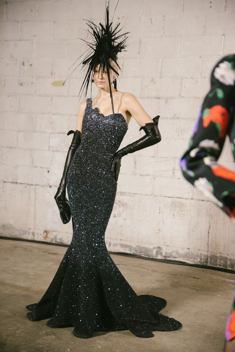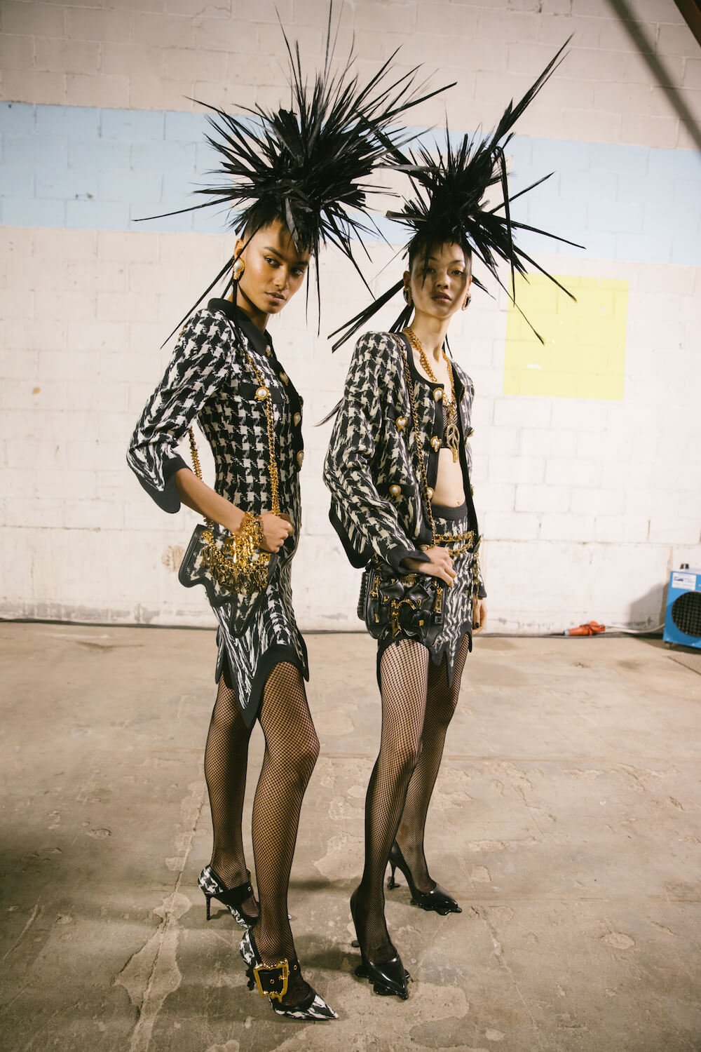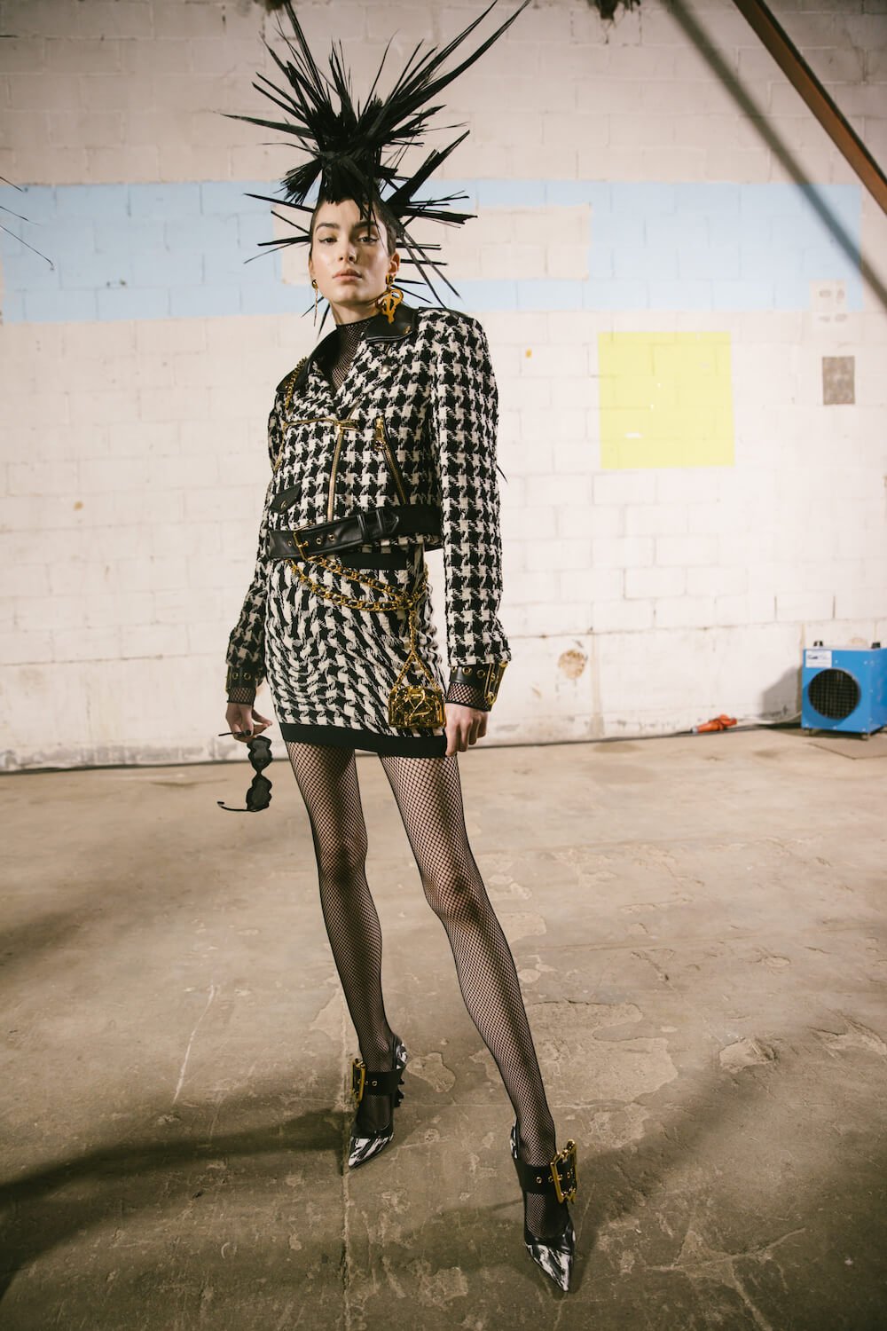 Jeremy Scott is an anarchist in his own right. He has long stuck a firm middle finger up to snooty, fashion purists with his thematic collections which are at once clever, witty and irreverent. His latest Moschino outing saw the designer clash aristo-punk spirit with surrealism, inspired by the work of Salvador Dalí. His models channeled Siouxsie Sioux with their sky-high, oiled-up mohawks and jagged up-dos. Their wardrobe of choice mainly consisted of classic Franco Moschino skirt-suits which looked like they’d been shot through an acid trip, fashioned from warped houndstooth and melting florals. Supersized spikes and XXL jewels lined sharp tailoring, velvet evening gowns and violet prom dresses that came frosted with diamonds.