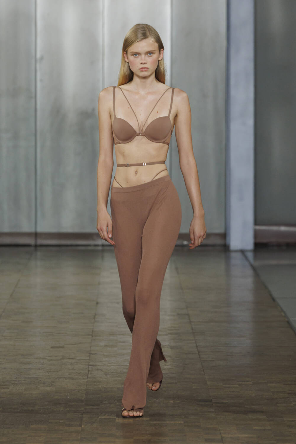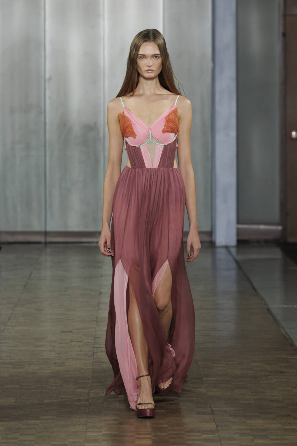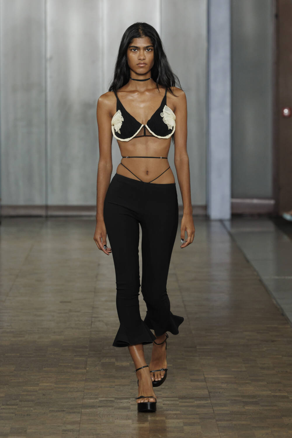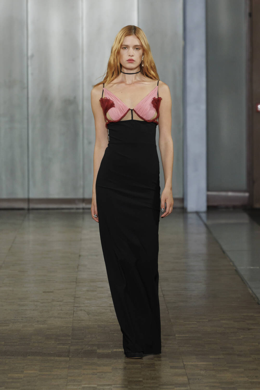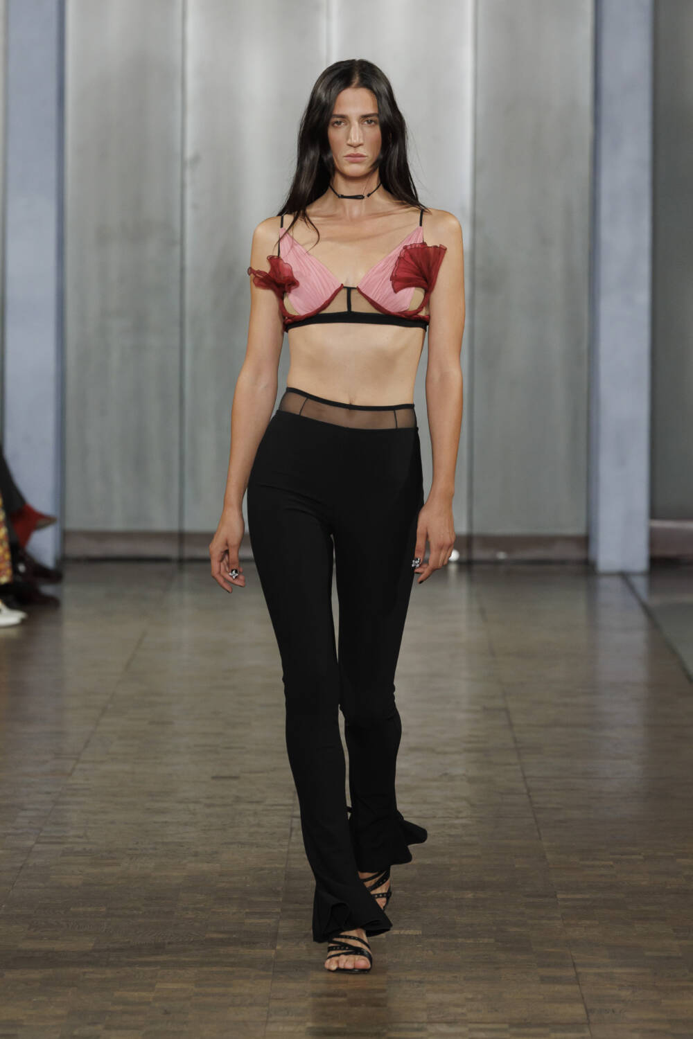 Sexy sheer bralets poked out from tailored jackets while technicolour jellyfish-like dresses floated effortlessly by, while CK’s recognisable hardware appeared on fastenings. Elsewhere, tufts of tulle were twisted into delicate roses to embroider corsets and bras.