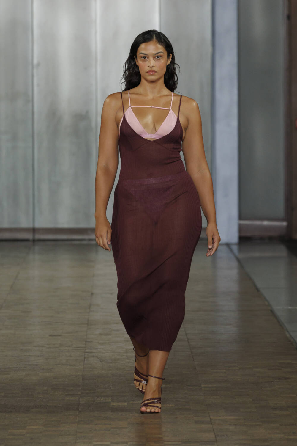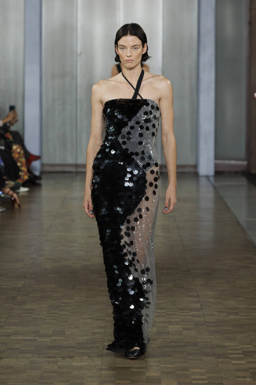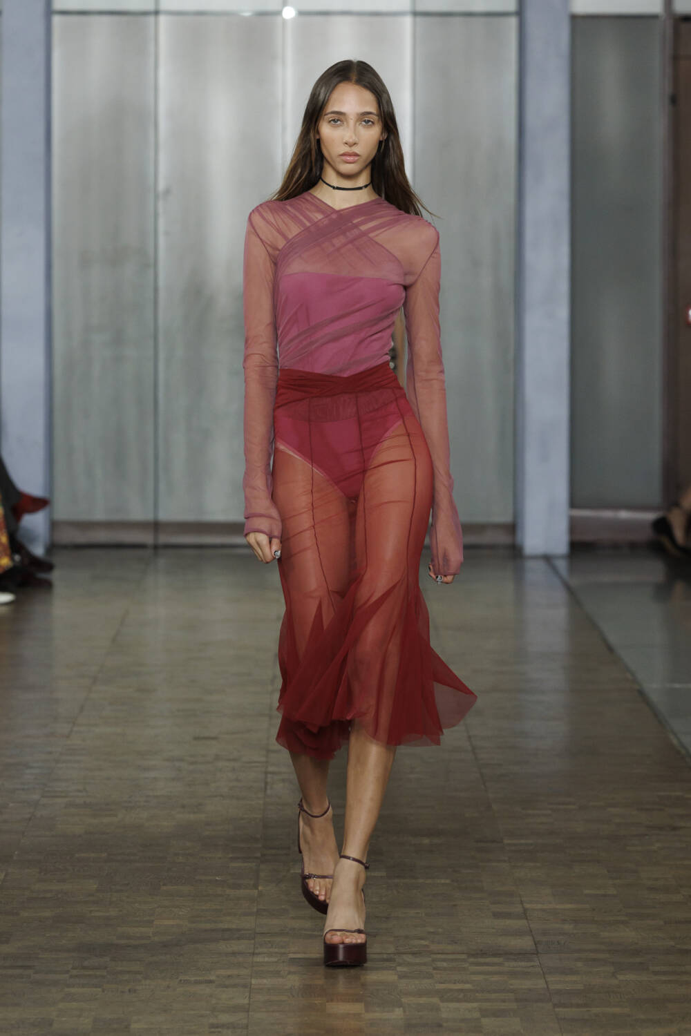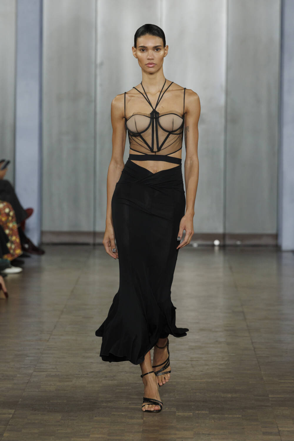 Arriving at the St Pancras Renaissance Hotel for Nensi Dojaka, guests were greeted with a gift on their seats – a mini pamphlet featuring Dune’s Rebecca Ferguson alongside models Mona Tougaard and Jill Kortleve photographed by Harley Weir. A sartorial aperitif of what to expect from the Albanian designer’s latest collection. By now, you’ll be familiar with Dojaka’s sensual offering – meticulous mesh sculpted around the body – but this time around, a twist, thanks to a collaboration with Calvin Klein.