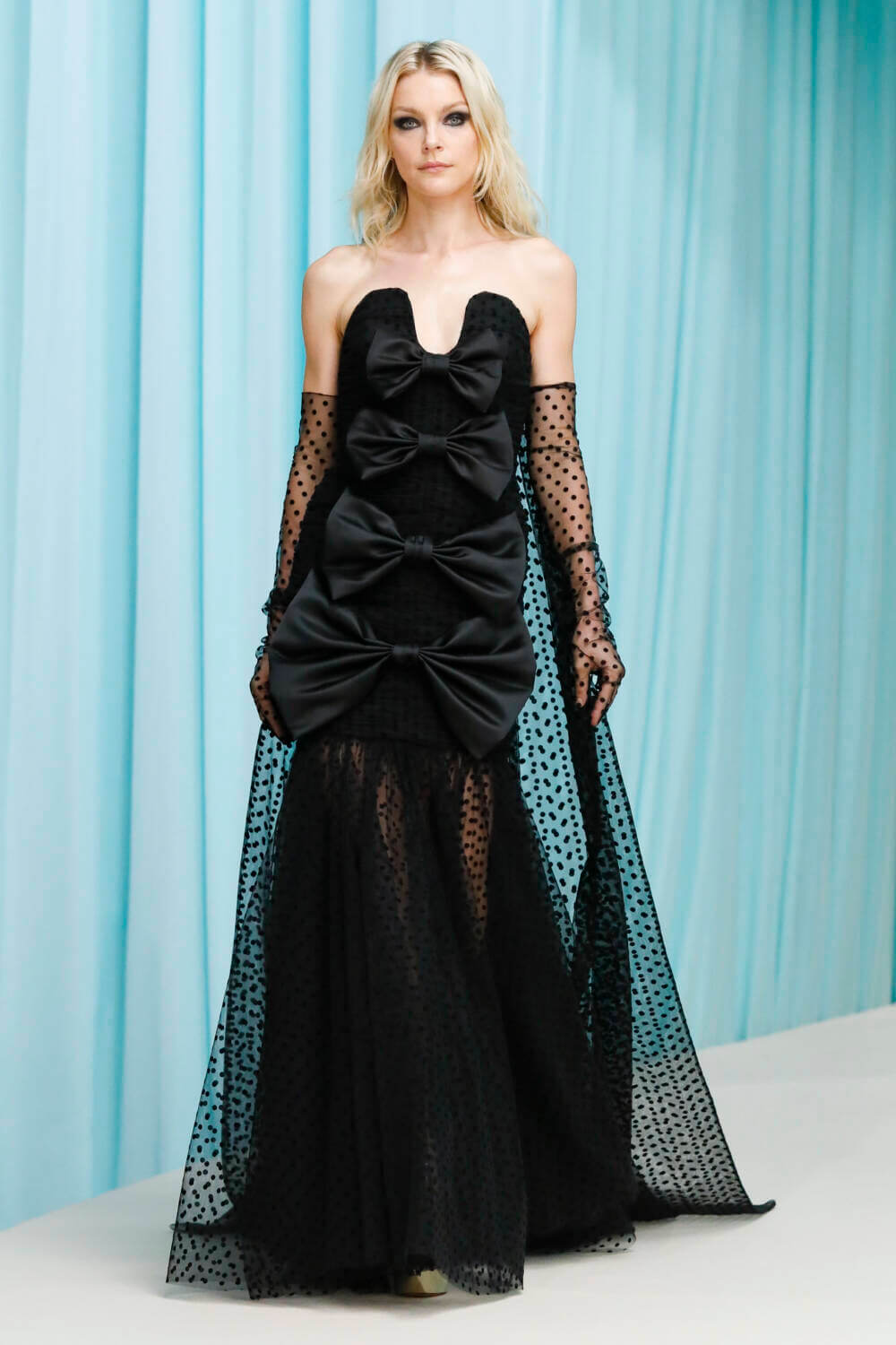 Contemporary cut-out necklines and sheer triangle bras ran in tandem with vintage-esc suiting and sumptuous velvet finishes. Oversized bows and sheer polka-dot accessories set a tone of kitsch extravagance and looks flirted with fishnet tights and elbow-grazing evening gloves to add elements of confidence and glamour. A spattering of animal print and leather reassured onlookers that the Nina Ricci woman is not to be trifled with. A collaboration with industry polymath Charlotte Tilbury meant beauty looks were strong yet sultry and wrapped with a feminine charm.