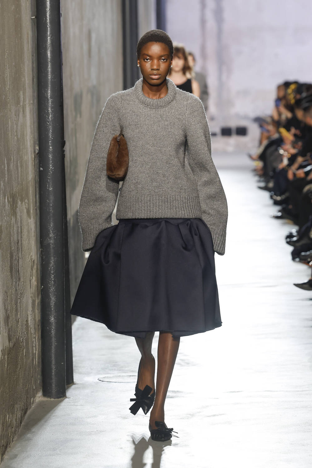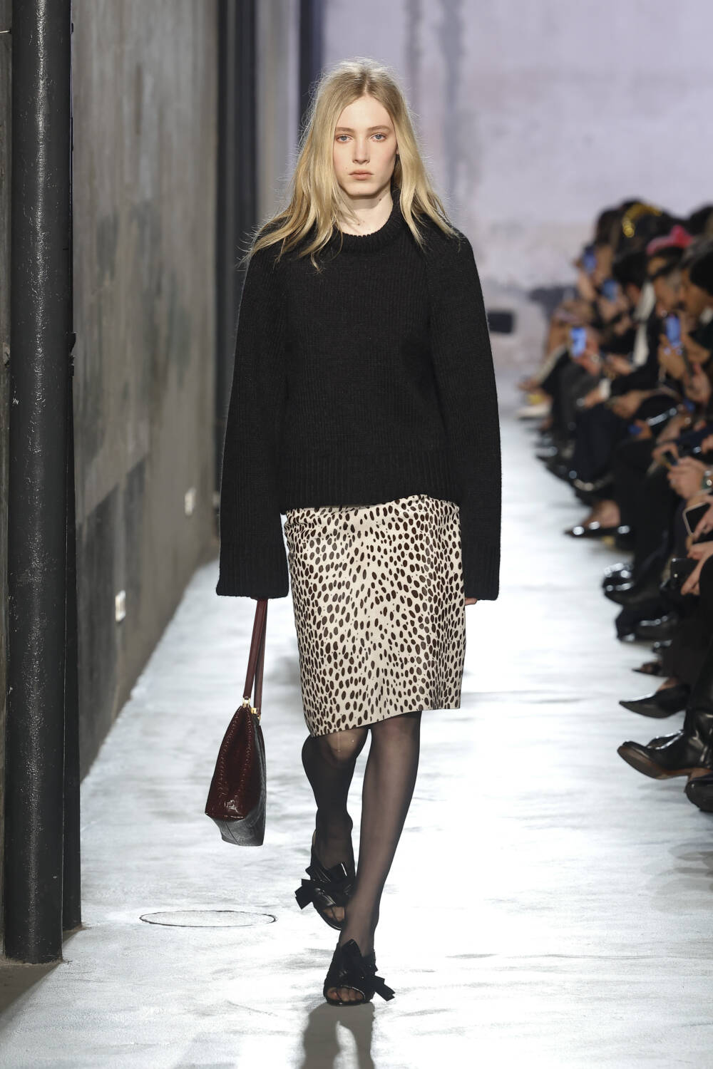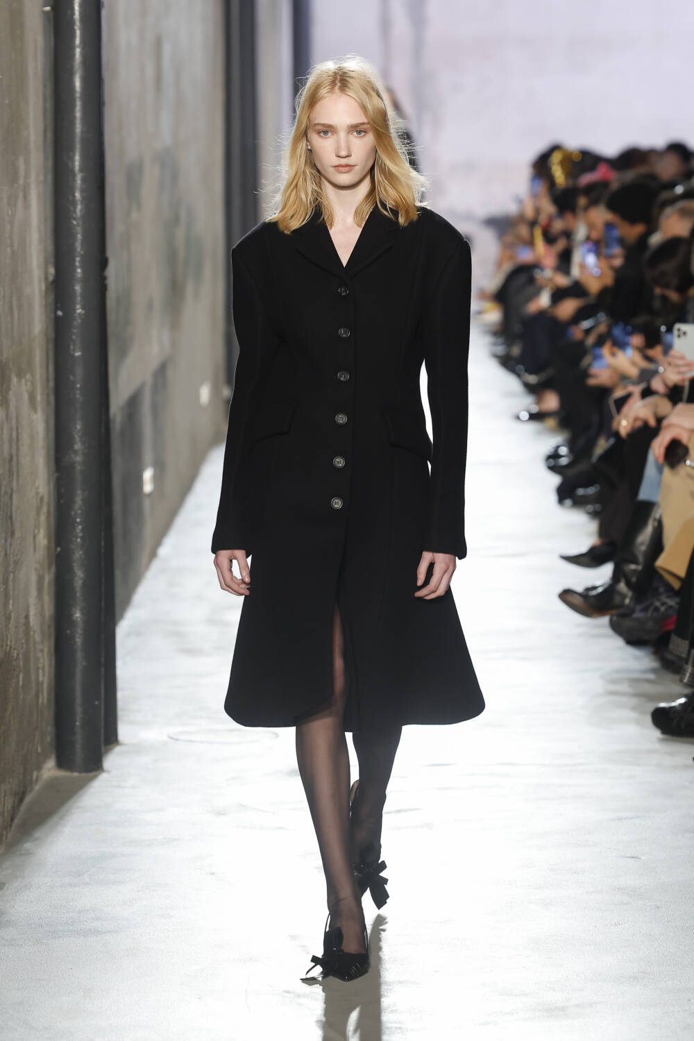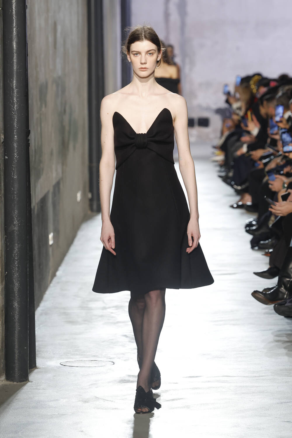 The stage was set in hushed tones, a minimalistic space where the only dialogue materialised through the clothes themselves. The first looks hinted at control – coats buttoned to the top, their sleek collars a quiet nod to Sofia Coppola’s Lost in Translation – pristine, poised, almost reluctant. V-necklines peeked out over sheer black tights, while Dalmatian prints and A-line skirts recalled the prim, pretty-but-not-precious schoolgirl aesthetic of The Virgin Suicides. Then, a flicker of mischief – bows, perky and perched on open and closed-toe heels – foreshadowed what was yet to come.