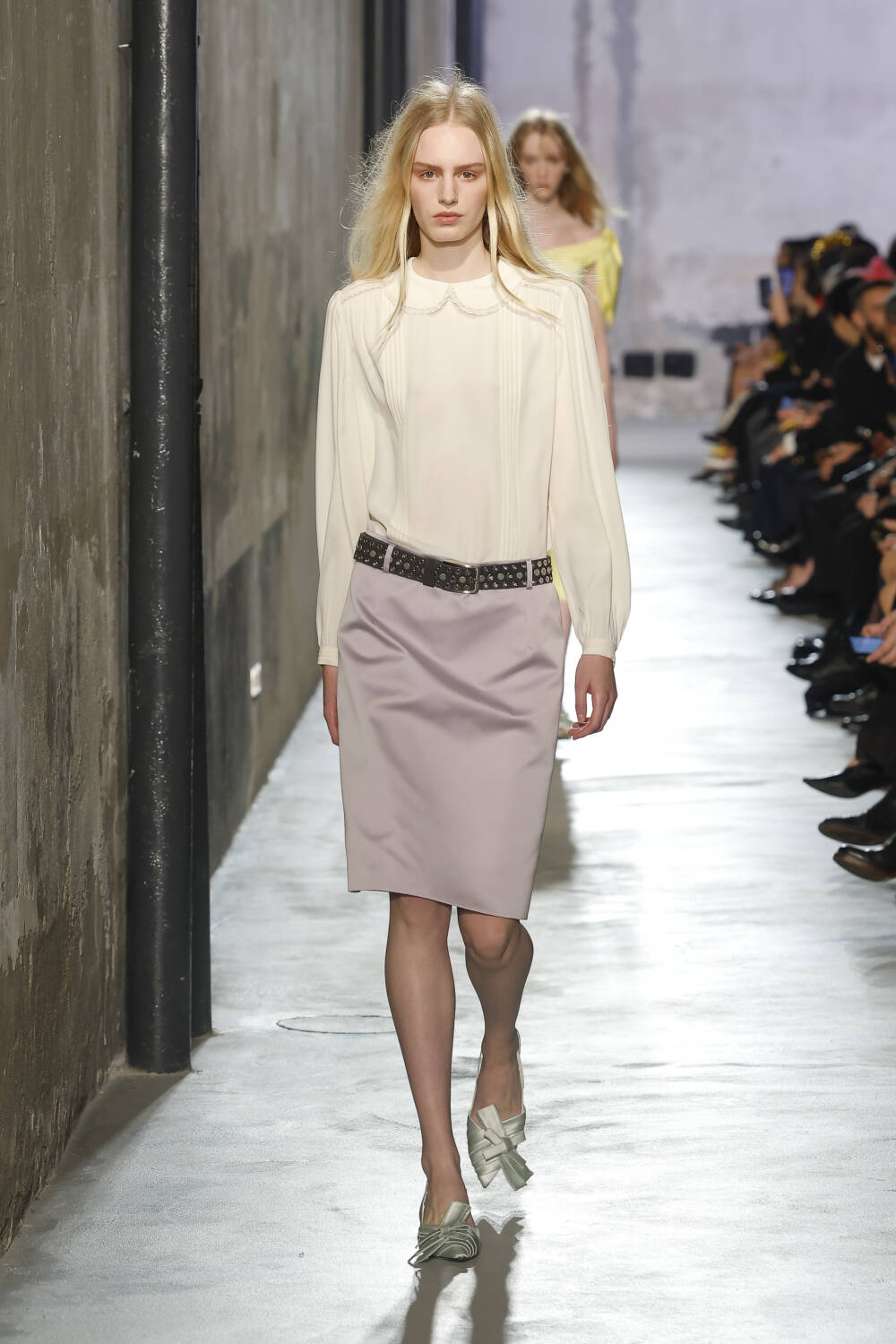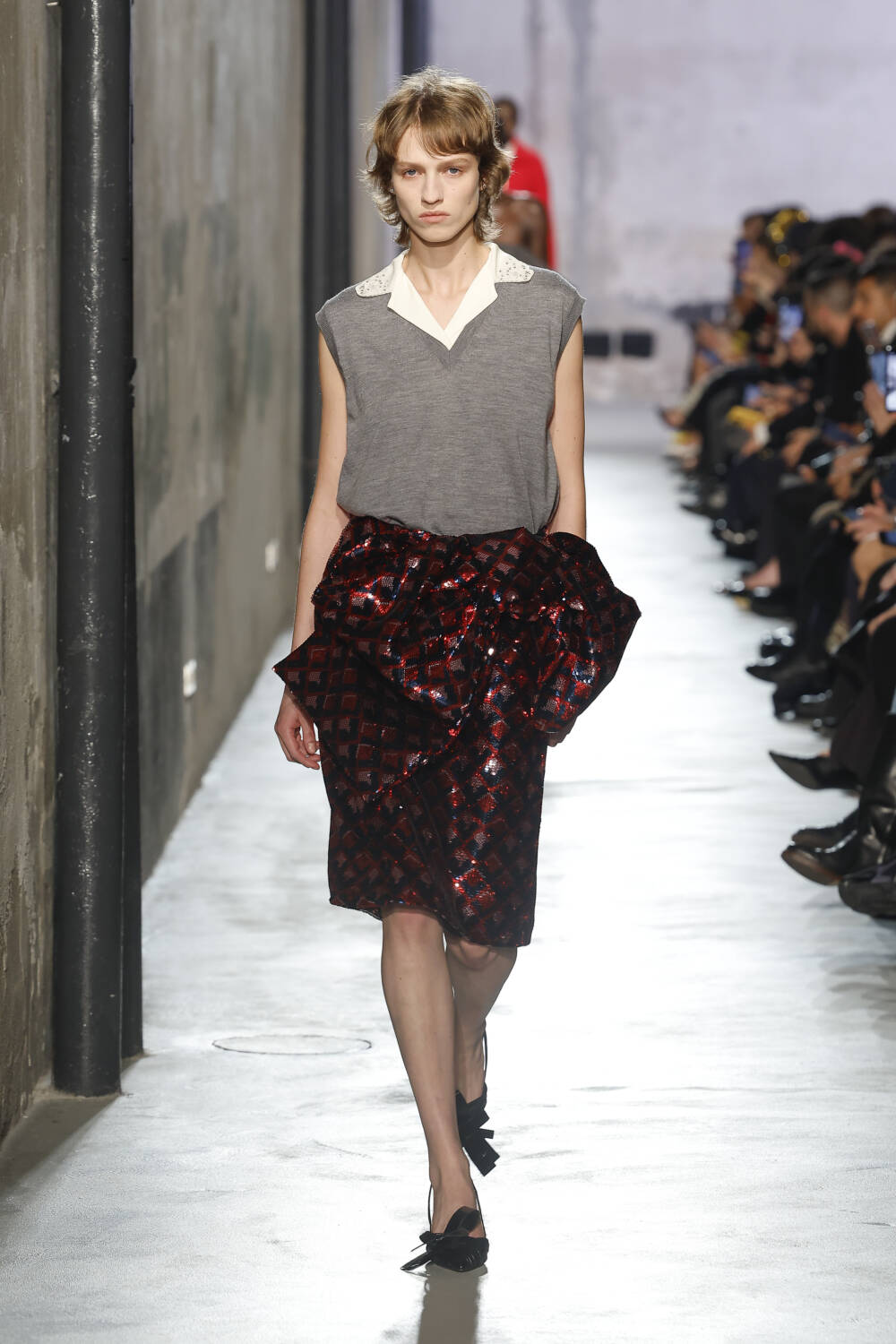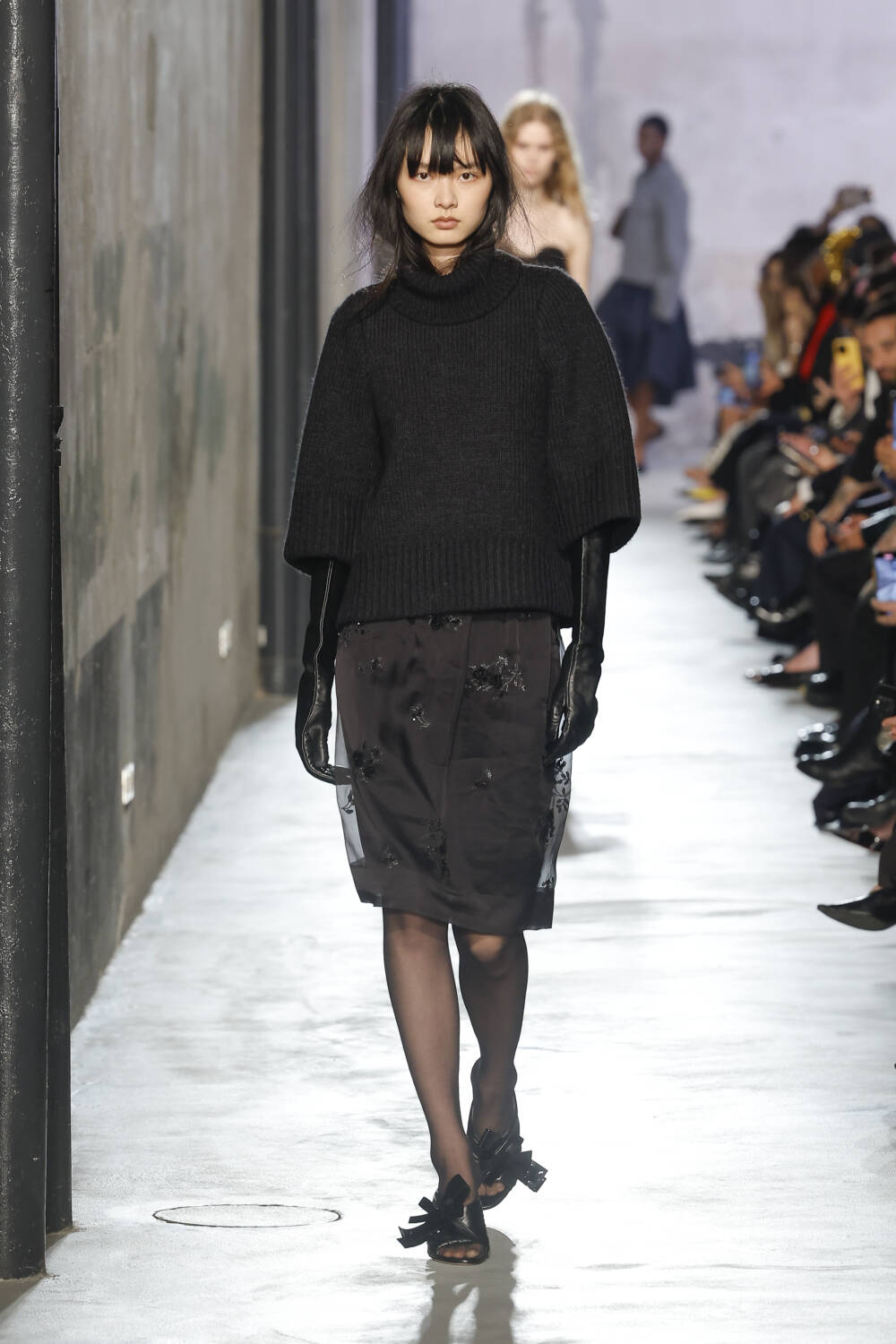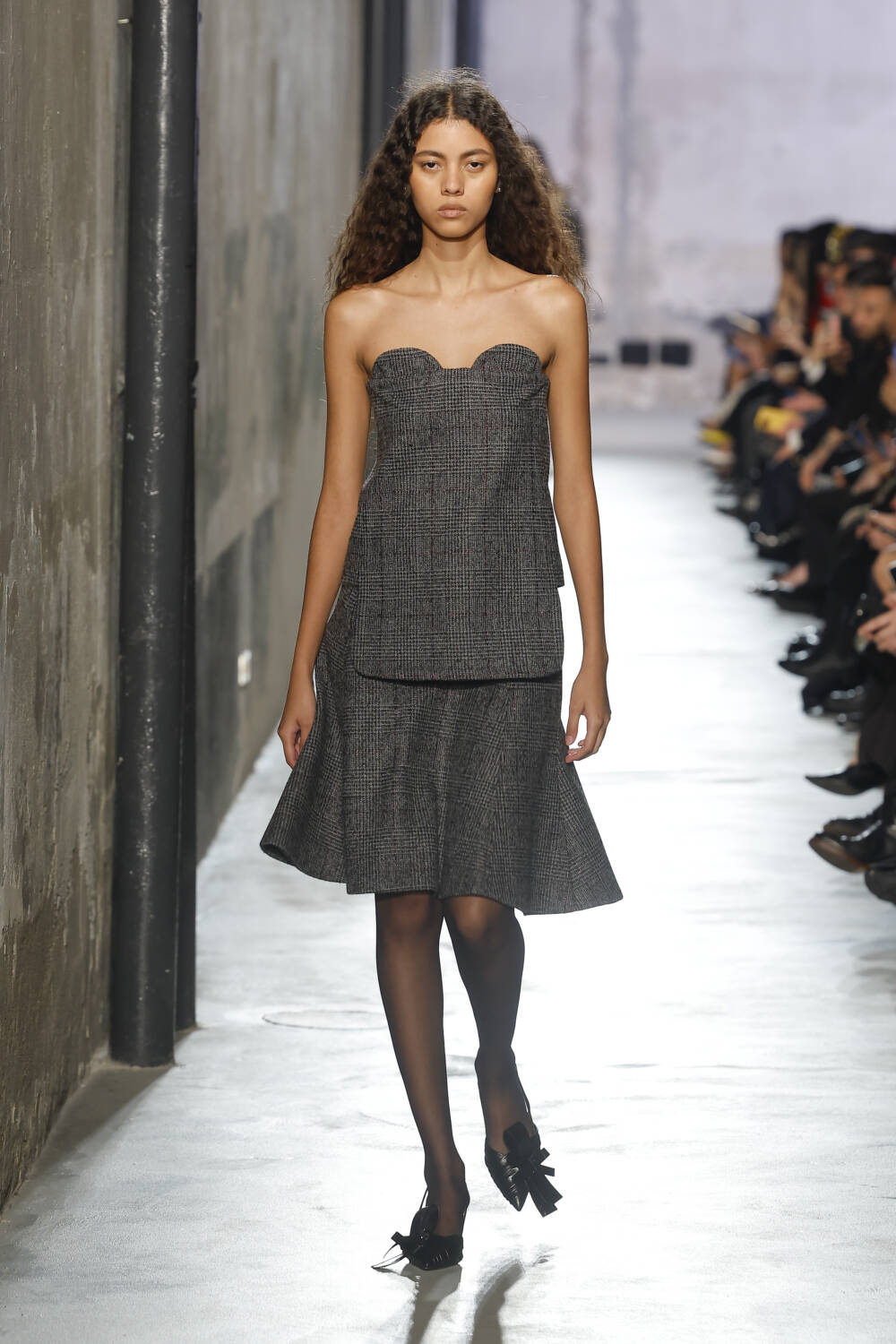 The stage was set in hushed tones, a minimalistic space where the only dialogue materialised through the clothes themselves. The first looks hinted at control – coats buttoned to the top, their sleek collars a quiet nod to Sofia Coppola’s Lost in Translation – pristine, poised, almost reluctant. V-necklines peeked out over sheer black tights, while Dalmatian prints and A-line skirts recalled the prim, pretty-but-not-precious schoolgirl aesthetic of The Virgin Suicides. Then, a flicker of mischief – bows, perky and perched on open and closed-toe heels – foreshadowed what was yet to come.