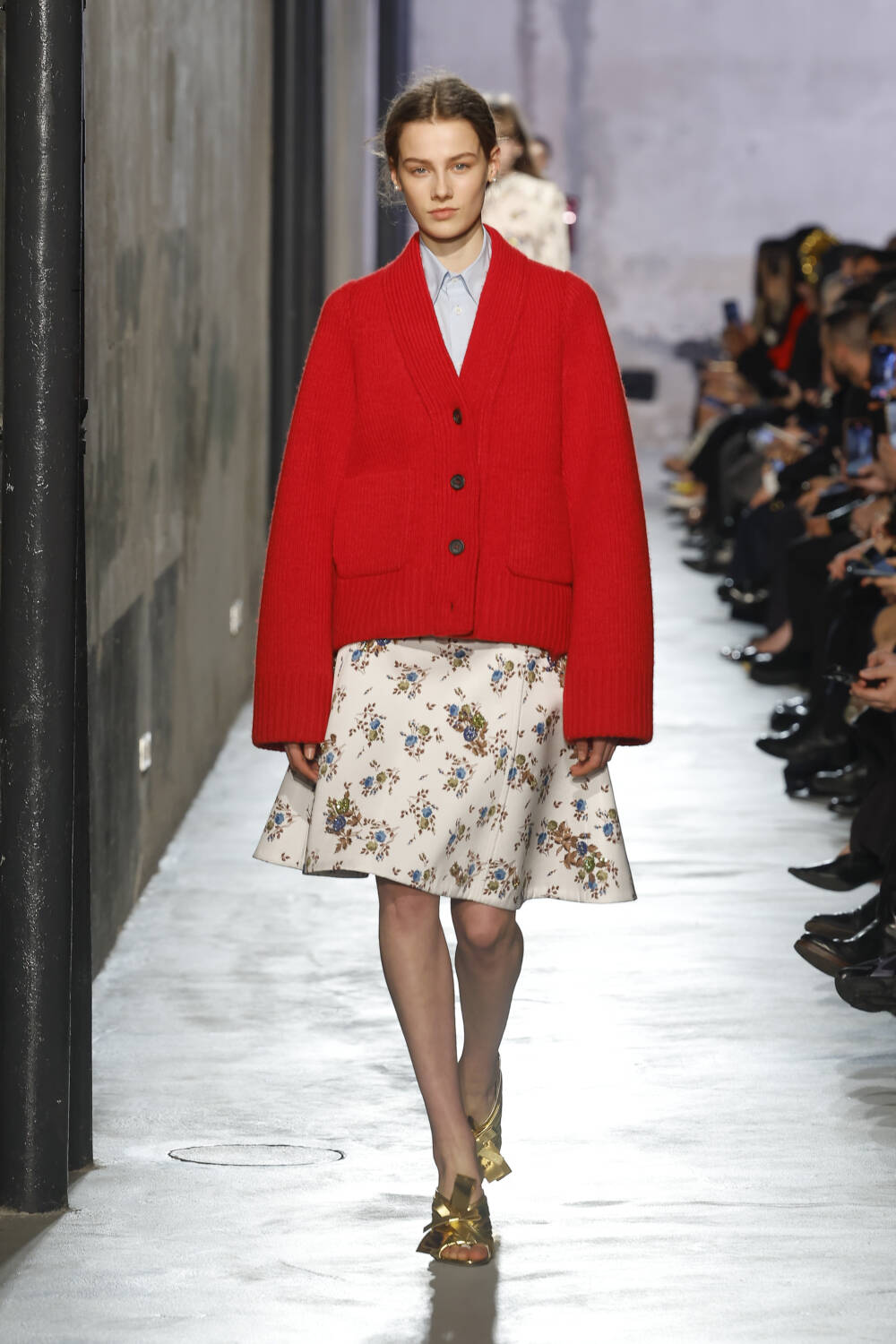 As the music intensified sweetheart necklines swooped in, followed by bon-ton cropped jackets in black, grey, deep red, burnt amber and brown that sharpened curved silhouettes. Then pale pinks crept in, before muted greens and yellows added quiet decadence. Micro-florals (lingerie-style) erupted across voluminous coats, like a romantic smokescreen for the drama underneath. Bows multiplied – cinching necklines, fastening shoulders, cascading down Victorian shirt dresses with flickers of Marie Antoinette-type indulgence.