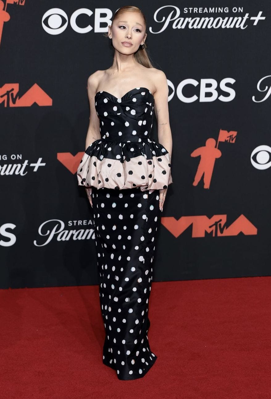 Nominated for seven different VMAs tonight, Ariana Grande channeled her Wicked character Glinda in a custom black and white polka Fendi strapless column gown, inspired by dress worn by Silvia Venturini in the 1980s.