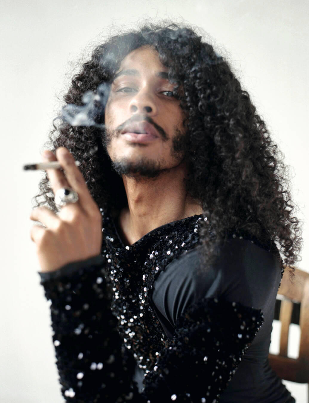 Growing up in an Afro-centric household, the model and stylist Maahleek has always been submerged in a melting pot of culture. He refers to himself on social media as an “Indigenous alien” and a “Multi-faceted sissy”, with his distinct style pulling from Japanese, Afrofuturist and Americana codes. Maahleek met Lopez at a rooftop party in Brooklyn in 2021. “It’s always good when you meet people who actually aren’t trying to put up a front, [who] actually genuinely support and see you,” he says. “He calls me ‘sis’, so I guess we’re sisters now. He checks up on me and whatnot; it’s a sisterhood.”