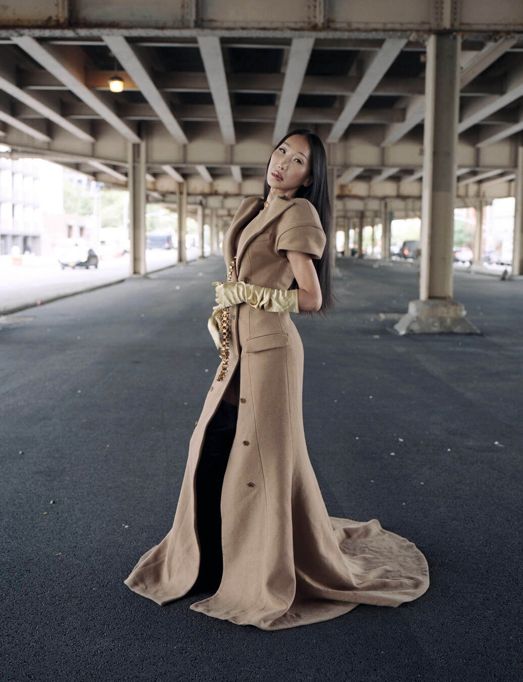On a stormy day in early spring, an unassuming studio in Brooklyn momentarily became the place for a cast of New York fashion characters to patter and peacock; friends and chosen family in synchronicity. Fiffany looked like a club kid in a slinky cut-out dress, Austin and Maahleek simulated glamazons in glittering evening gowns and Alexis was like a Matrix-obsessed streetwear aficionado. Sporting sumptuous faux-fur coats and beefy, hooded evening gowns, they landed full force, with a touch of tenderness – and every garment was Luar.