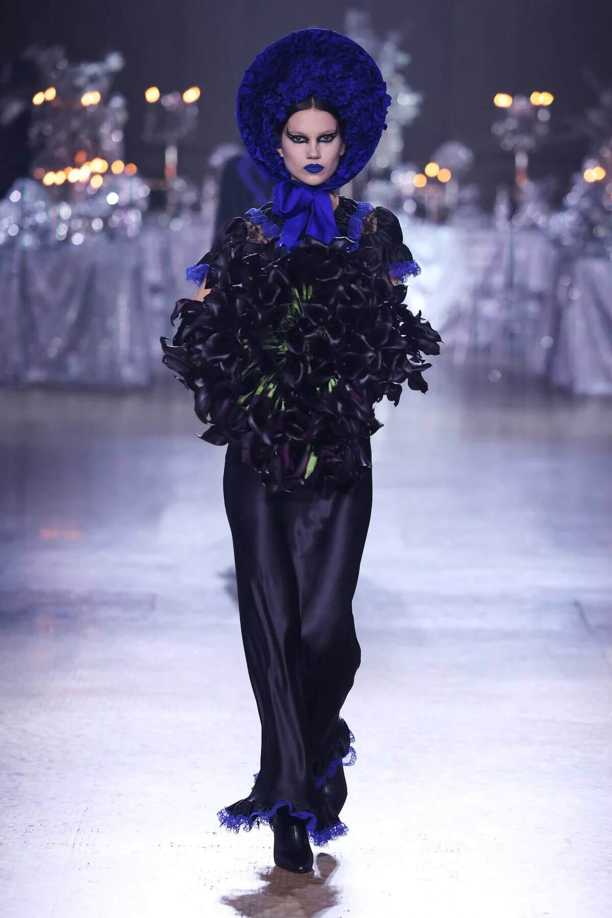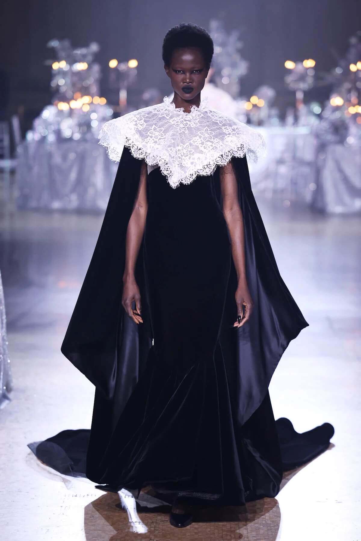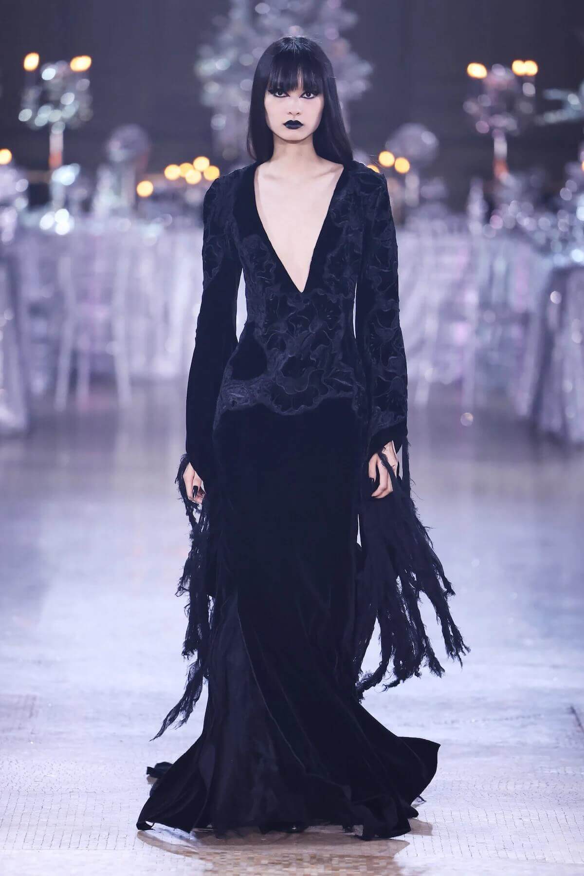 Set to music by Tori Amos, the show began with a series of black dresses that appeared to be plucked straight out of Morticia Addams’ closet. Featuring dramatic sleeves that trailed behind as the models walked, there was plenty of lace trim, velvet, and veils as well. It was the stuff of dreams for any goth-loving bride, which the brand seemed to acknowledge by sending several models down the runway with black calla lily bouquets paired with elaborate bonnets.