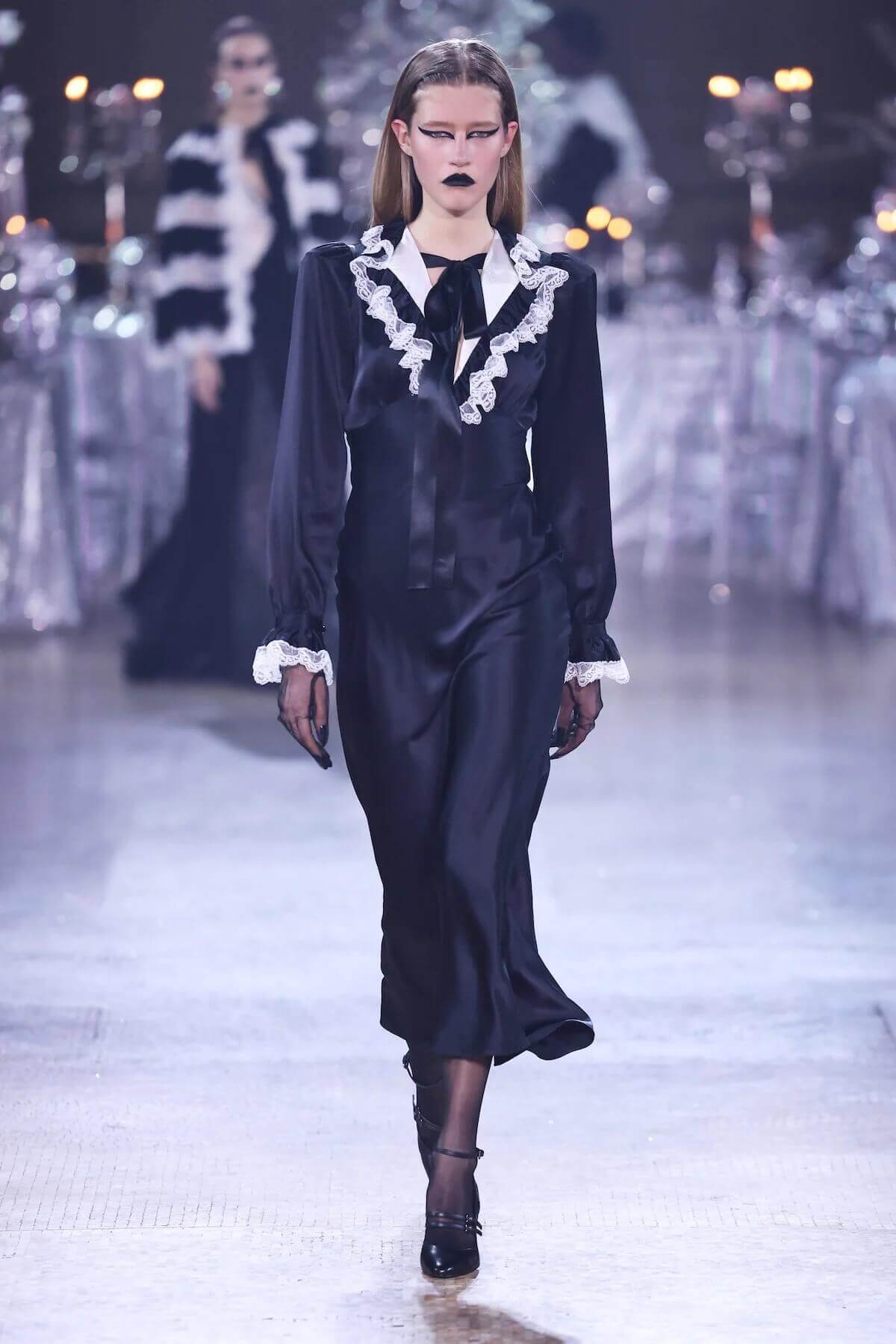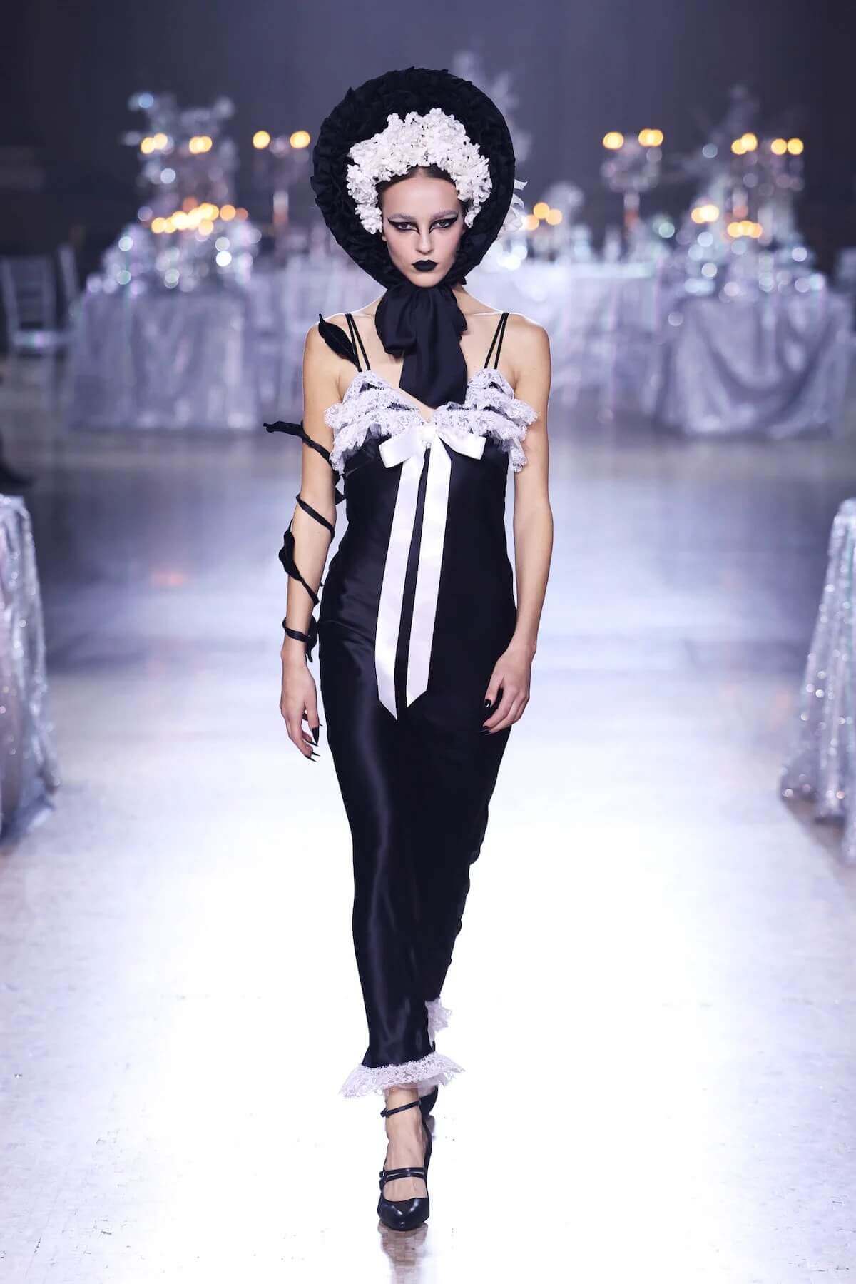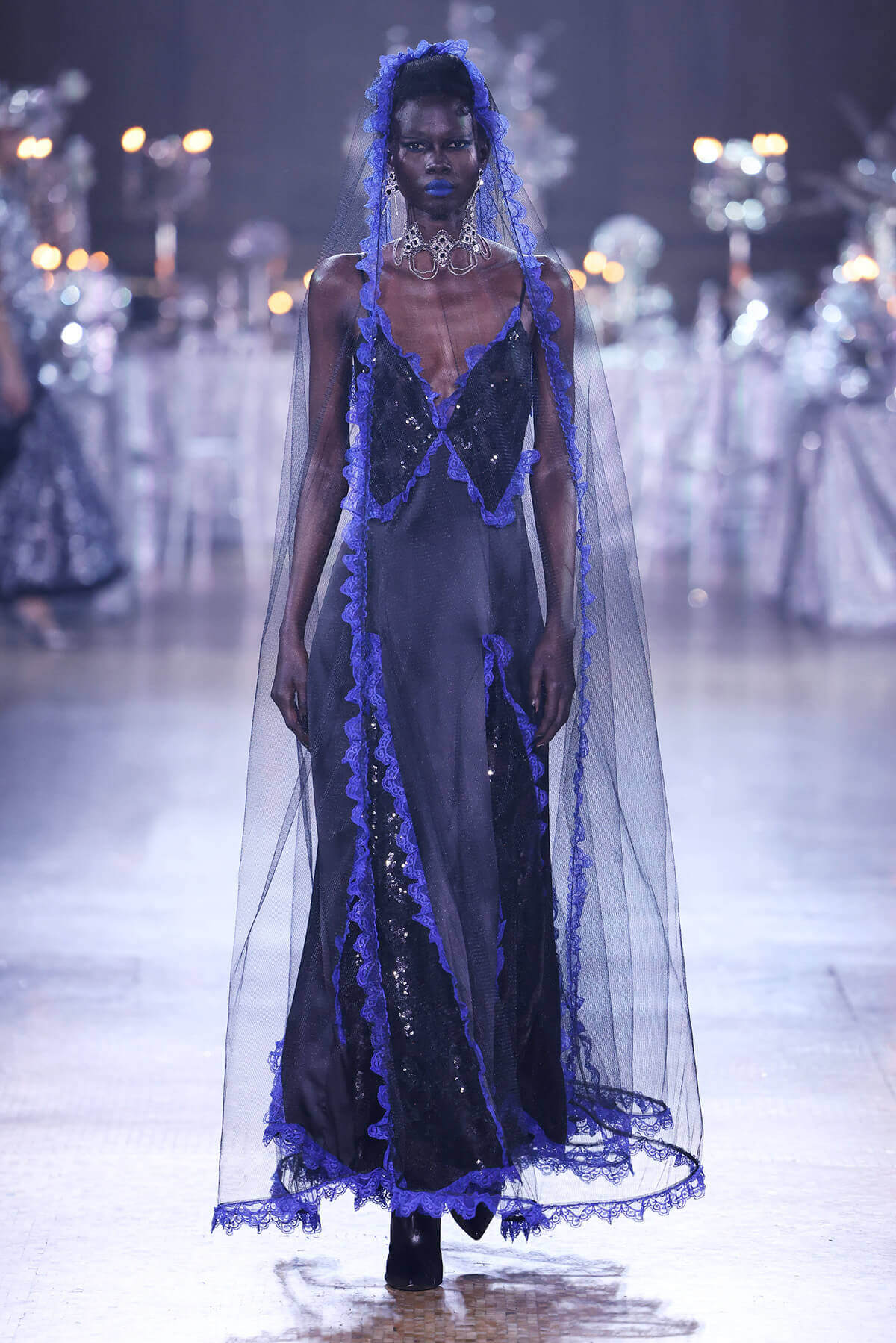 To match the moody setting, the makeup was equally as dark and glamorous with thick, sharp cat eyes that extended into mask-like lines across the brows and cheekbones. Paired with black lipstick, expect to see these looks to be immediately recreated by TikTok makeup creators. Also worth noting: the sharp nails that accompanied a few looks — it appeared to be extensions made of silver metal and black lace, as if the dress had morphed itself into matching claws.