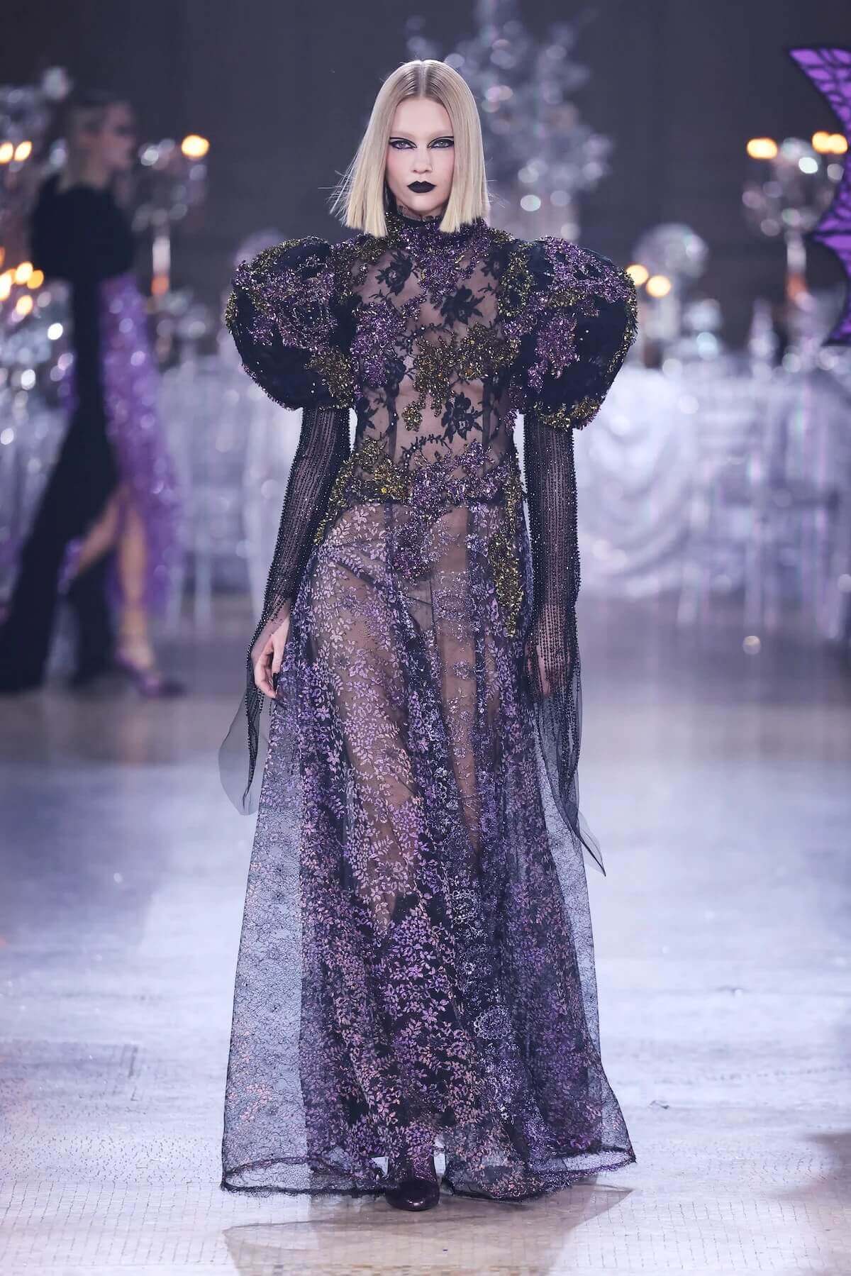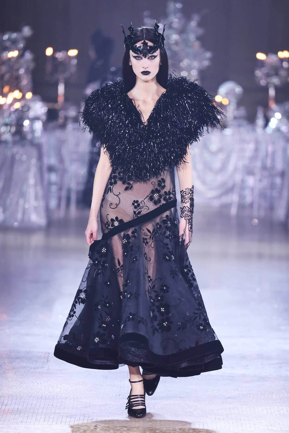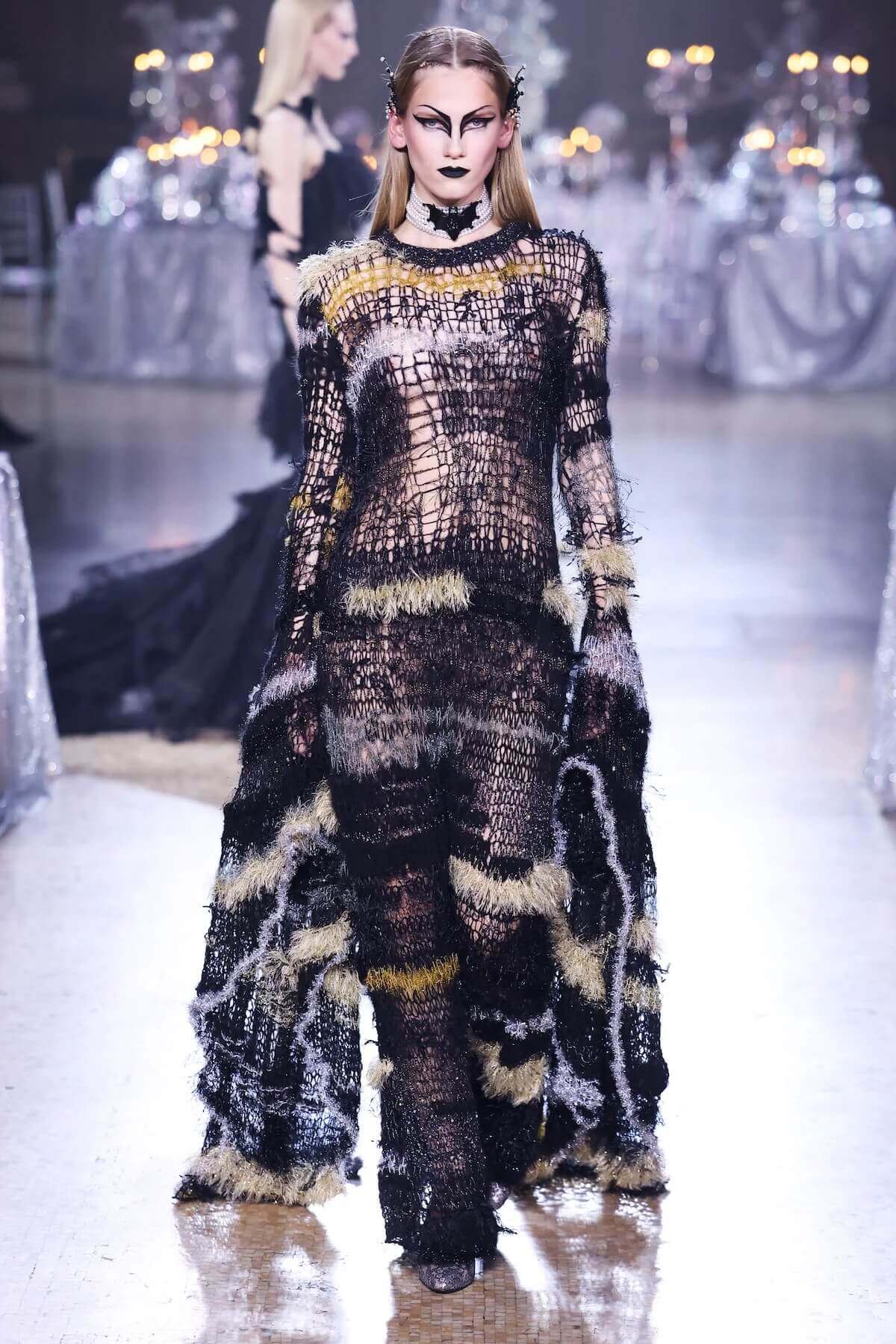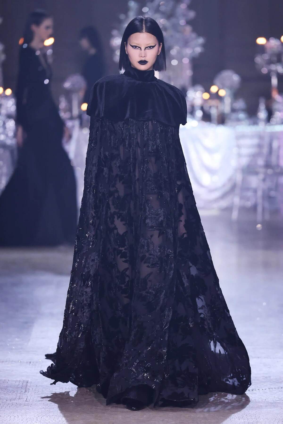 To match the moody setting, the makeup was equally as dark and glamorous with thick, sharp cat eyes that extended into mask-like lines across the brows and cheekbones. Paired with black lipstick, expect to see these looks to be immediately recreated by TikTok makeup creators. Also worth noting: the sharp nails that accompanied a few looks — it appeared to be extensions made of silver metal and black lace, as if the dress had morphed itself into matching claws.