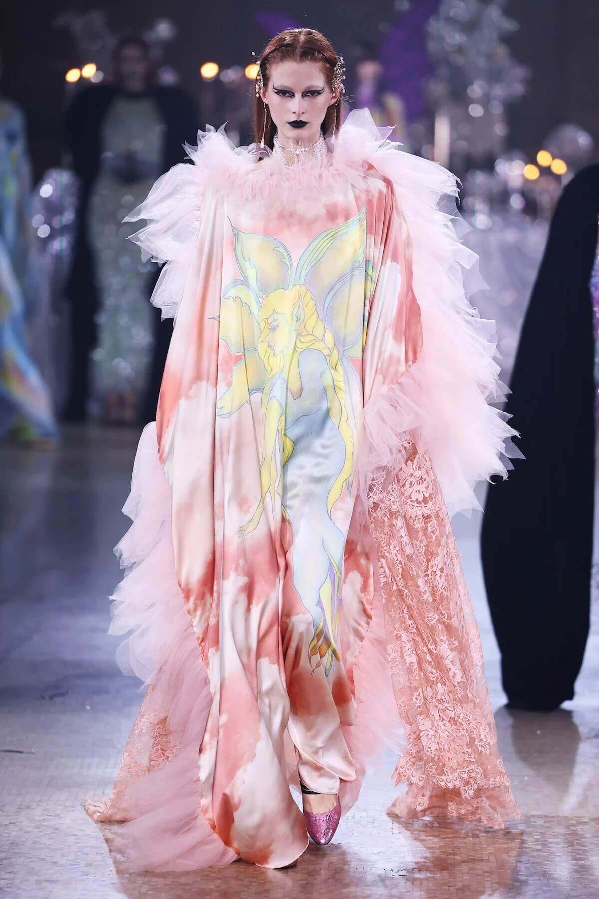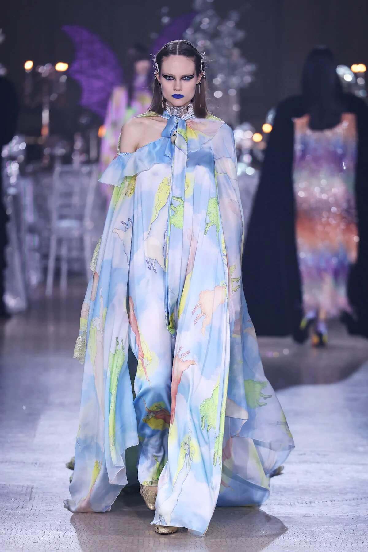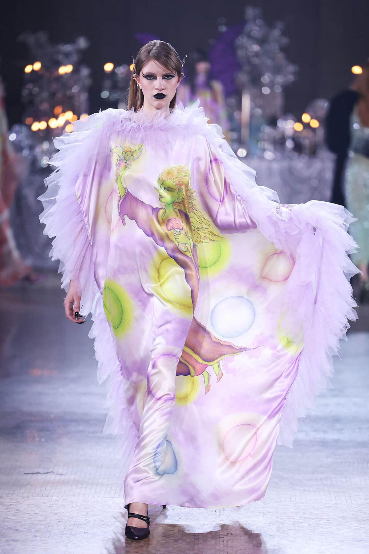 From there it was straight to the Land of the Fae, with ear cuffs that were made to resemble pointy ears, jagged crowns, and even a pair of lacy purple wings. In case you needed more of an overt reference, those looks were followed shortly by a series of silk maxis that featured illustrations of fairies, which were drawn by their mother. But perhaps nothing was more definitive than the next to last look — a massive tulle creation made for Queen Mab as she rules over her land complete with silver wings and a matching crown.