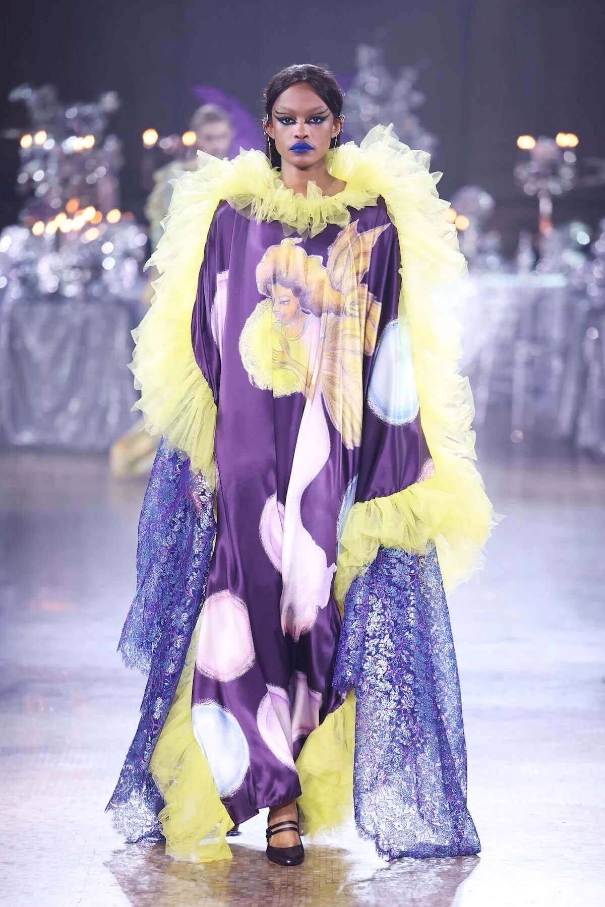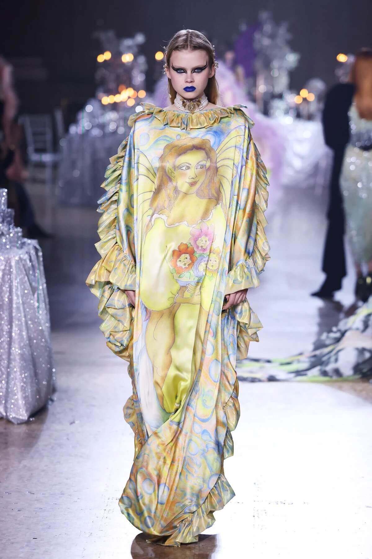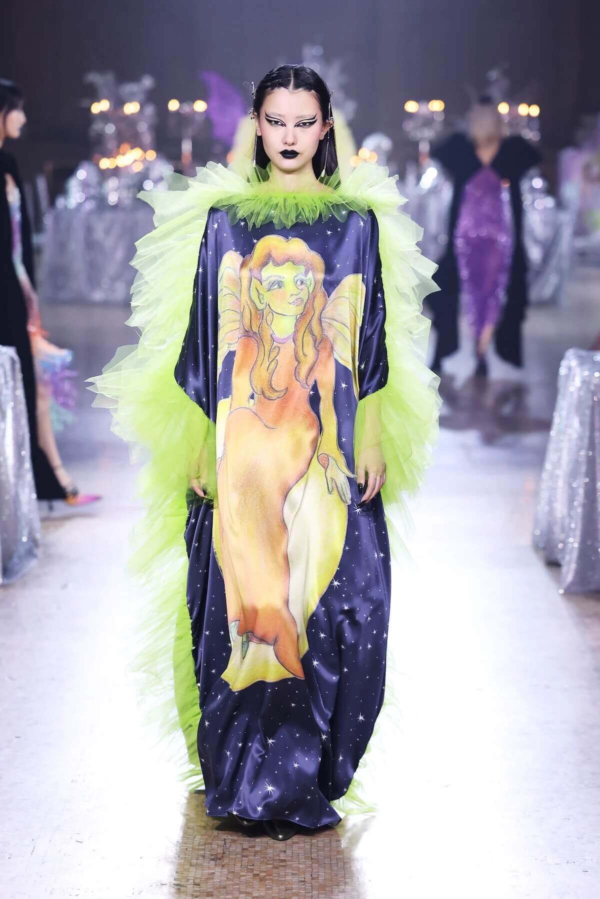 From there it was straight to the Land of the Fae, with ear cuffs that were made to resemble pointy ears, jagged crowns, and even a pair of lacy purple wings. In case you needed more of an overt reference, those looks were followed shortly by a series of silk maxis that featured illustrations of fairies, which were drawn by their mother. But perhaps nothing was more definitive than the next to last look — a massive tulle creation made for Queen Mab as she rules over her land complete with silver wings and a matching crown.