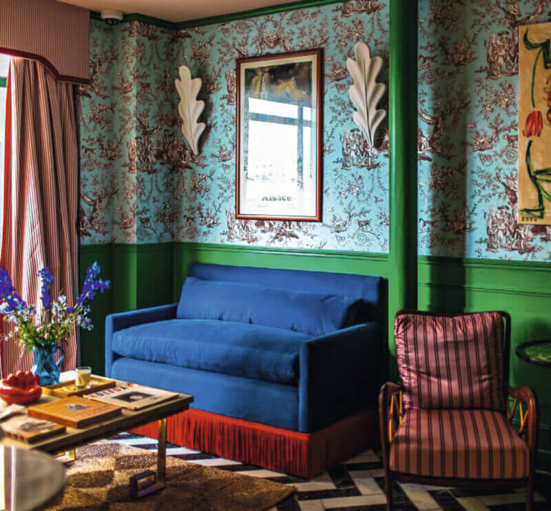 There’s not one white wall in Hotel Les Deux Gares: those are electric green, while the lamps are pink and the couches are royal blue. The interior was designed by the English artist and designer Luke Edward Hall, who has melded quirky British design with Parisian élan to create a vibrant space that still nods to the past. It’s not your typical Parisian stay, but it is refreshing in its youthful energy and bold colours.