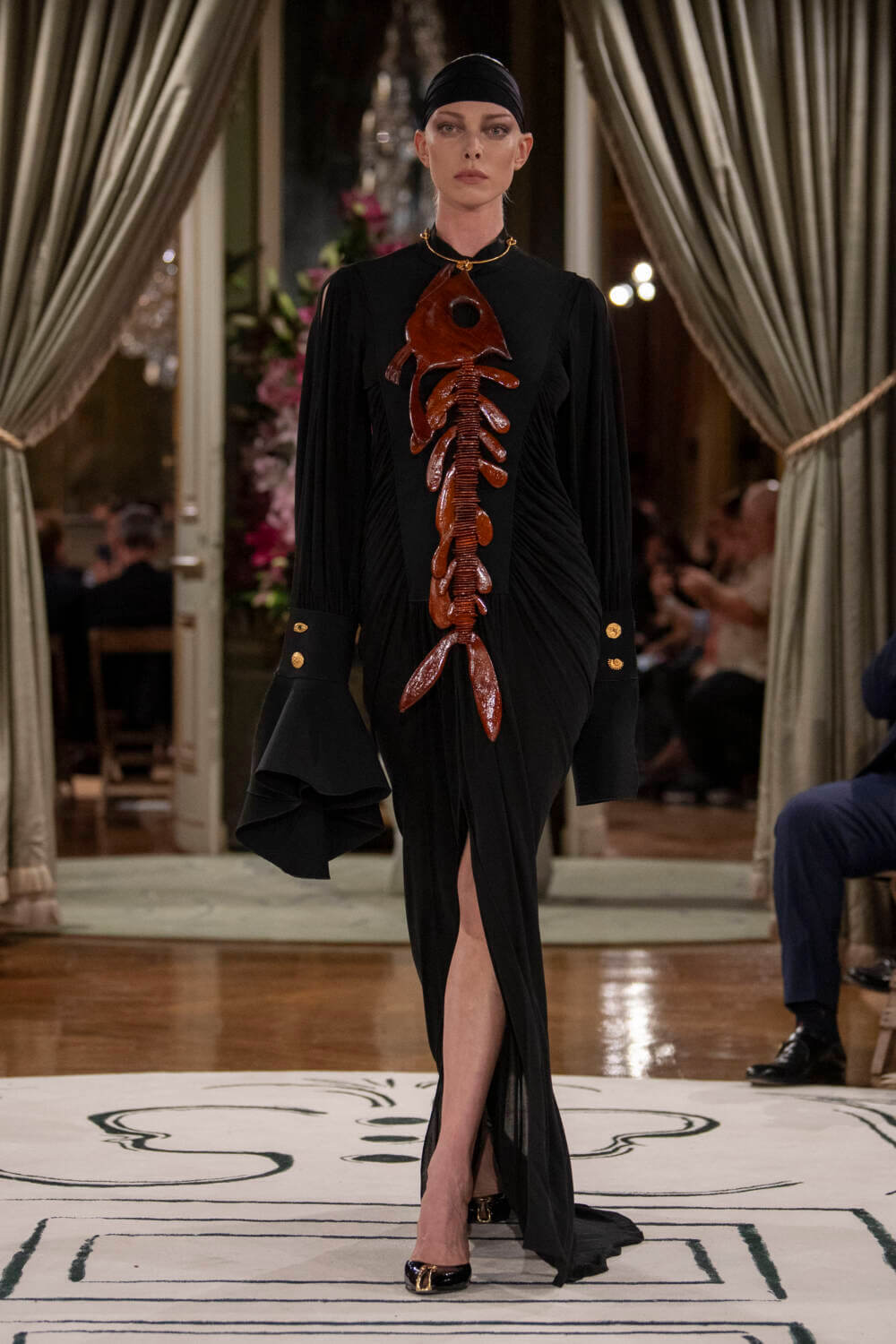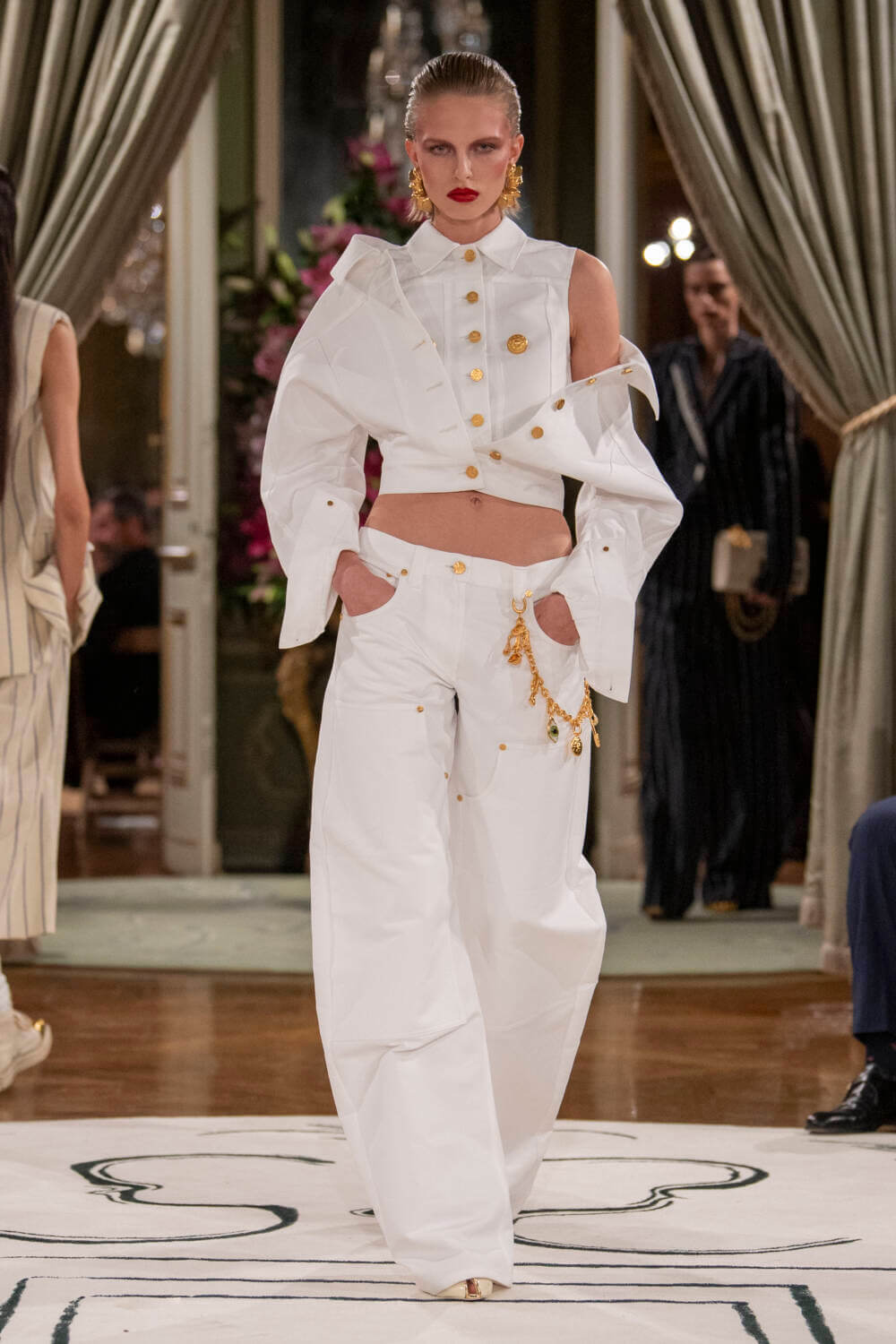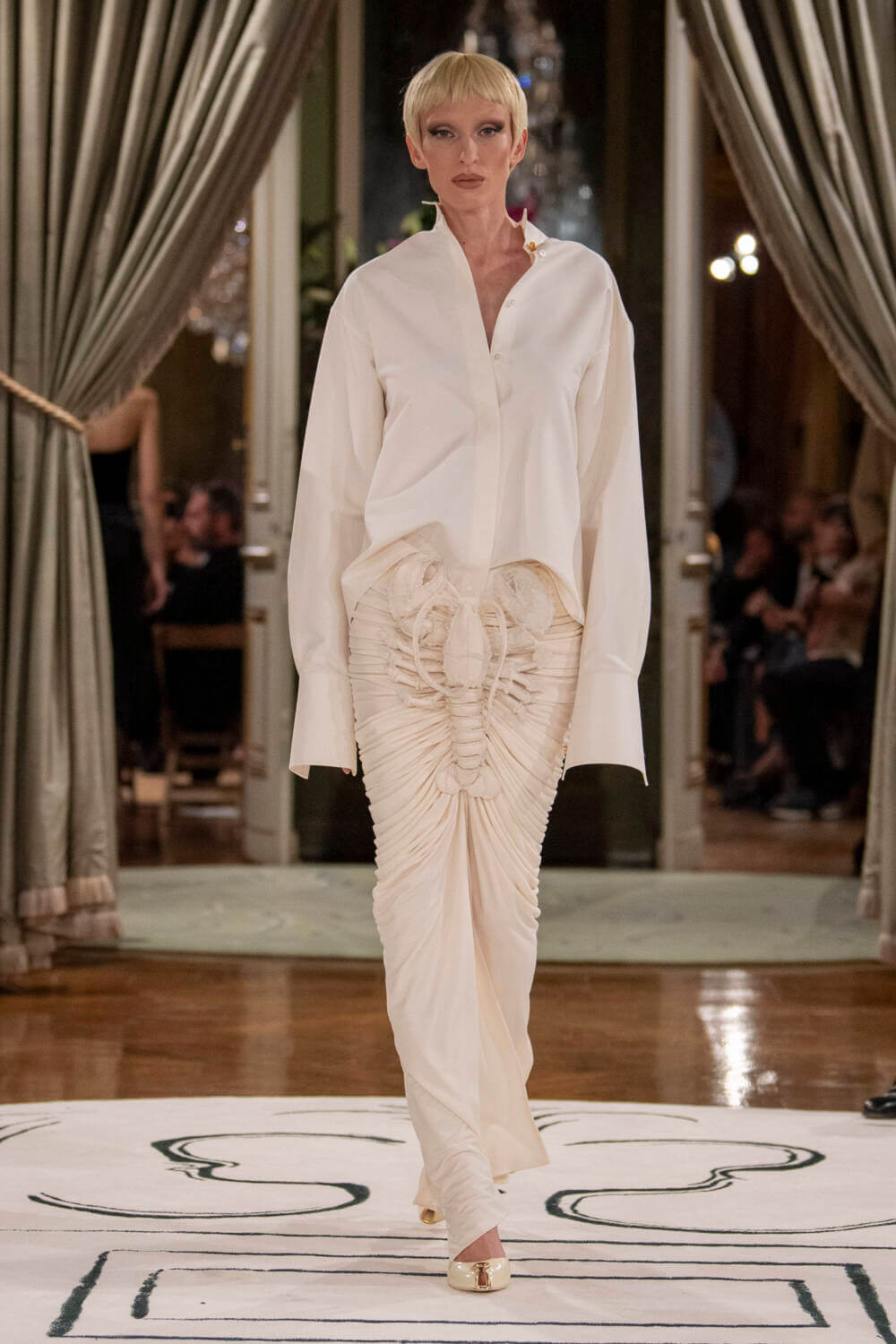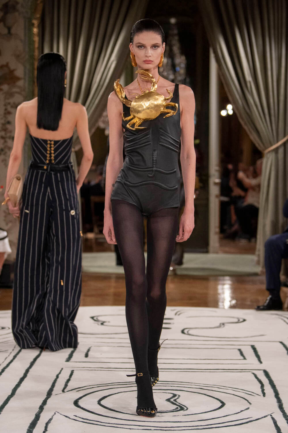 With a wink and a nudge, he presented sharp tailored jackets with measuring tape trailing the plunging neckline – an old Elsa Schiaparelli trick – worn alongside raw Japanese denim cargos paired with ladylike tweed jackets, and liquid-y black satin evening wear. Until now, the American designer has always been conscious not to rely too much on Schiaparelli insignias, instead frosting his collections with Elsa easter eggs. Here, he let himself dive head-first into the archive, dressing up a floor-length skirt with a lobster at the crotch, also envisioning jumbo crabs as gold necklaces and littering suit jackets with cigarettes, lipsticks and even spilt crimson nail polish. He anchored looks with clutch bags shaped like puckered-up lips and sneakers with trompe l’oeil, gold-plated toes – prepped and primed to bring Schiaparelli to the street.