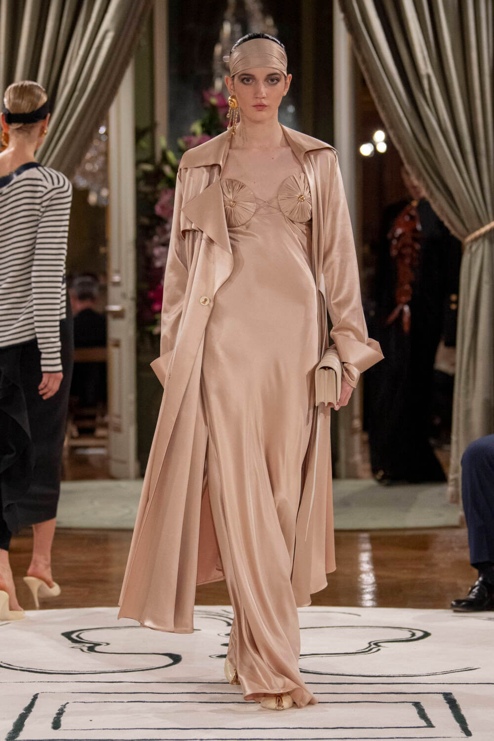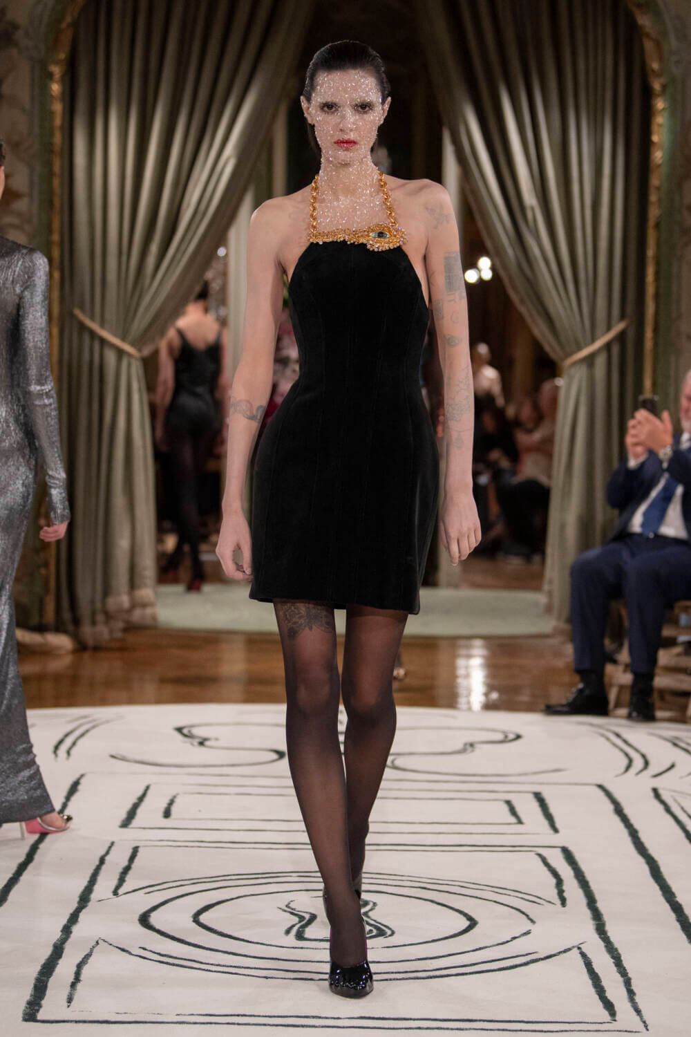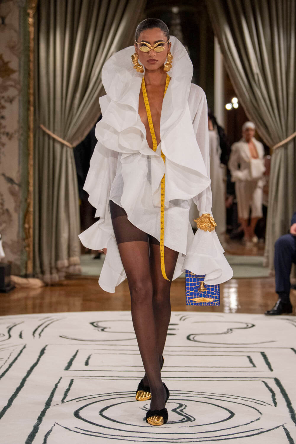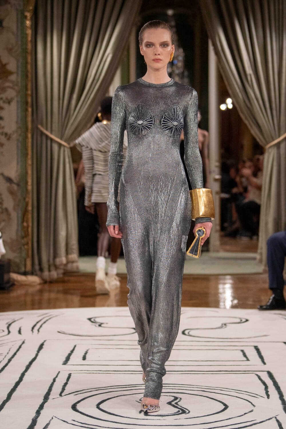 With a wink and a nudge, he presented sharp tailored jackets with measuring tape trailing the plunging neckline – an old Elsa Schiaparelli trick – worn alongside raw Japanese denim cargos paired with ladylike tweed jackets, and liquid-y black satin evening wear. Until now, the American designer has always been conscious not to rely too much on Schiaparelli insignias, instead frosting his collections with Elsa easter eggs. Here, he let himself dive head-first into the archive, dressing up a floor-length skirt with a lobster at the crotch, also envisioning jumbo crabs as gold necklaces and littering suit jackets with cigarettes, lipsticks and even spilt crimson nail polish. He anchored looks with clutch bags shaped like puckered-up lips and sneakers with trompe l’oeil, gold-plated toes – prepped and primed to bring Schiaparelli to the street.