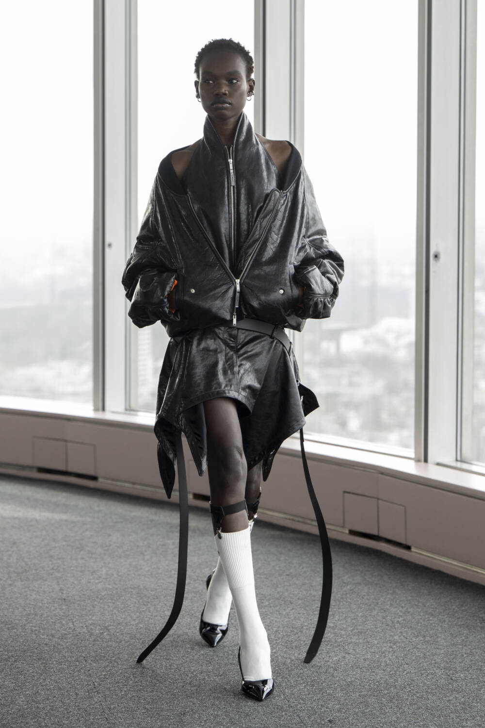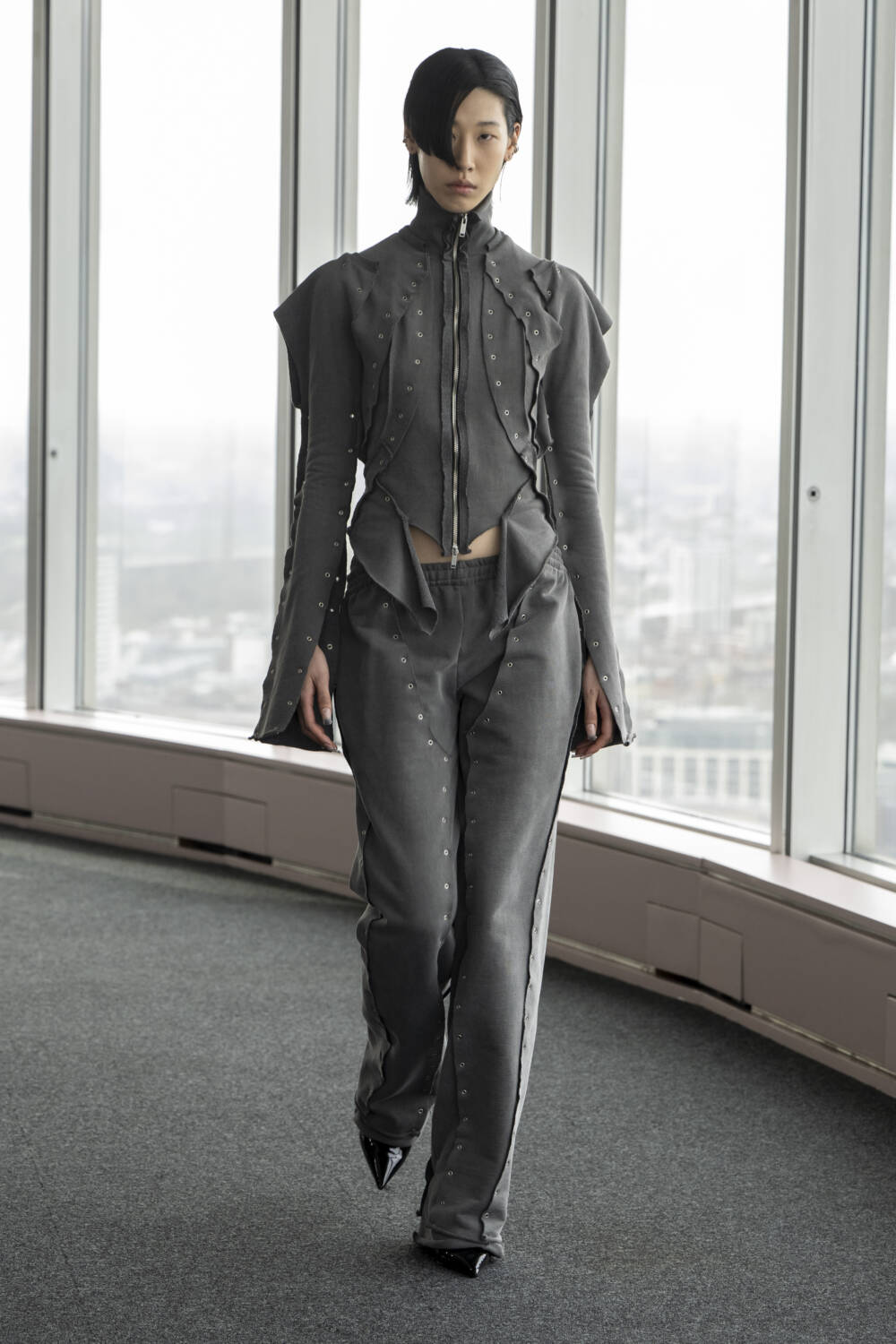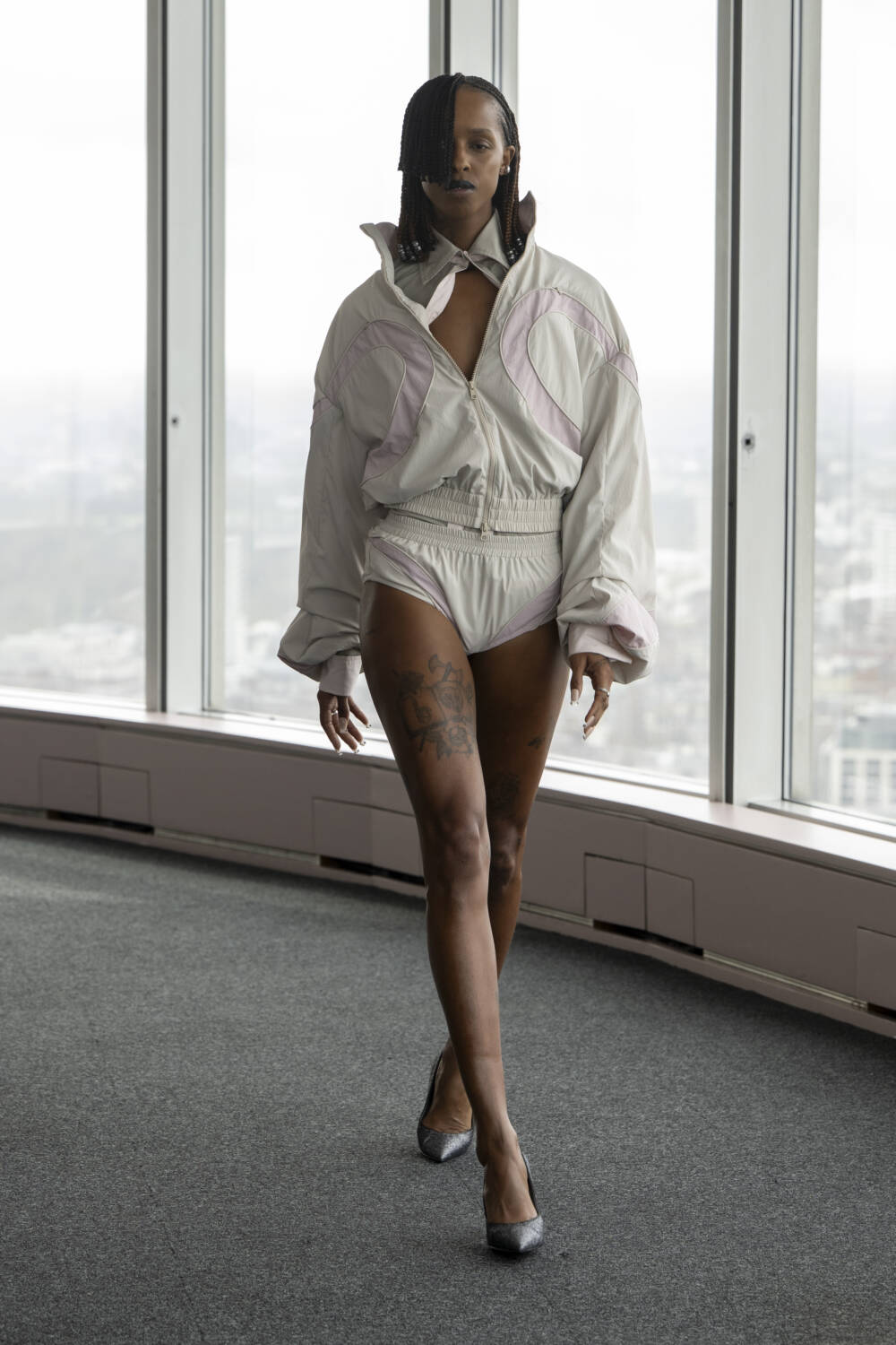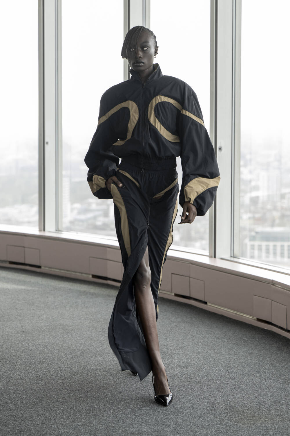 SRVC’s decided to take to the skies yesterday, opting for the dizzying heights of the 34th floor of London’s BT Tower for its AW25 catwalk – the first brand ever to do so. A considered choice to showcase the Ricky Wesley Harriott-helmed brand’s goal of communicating through clothes, what unfolded within the glass rotunda show space was an incisive investigation of how fashion can help you defend yourself against the relenting demands of everyday life.