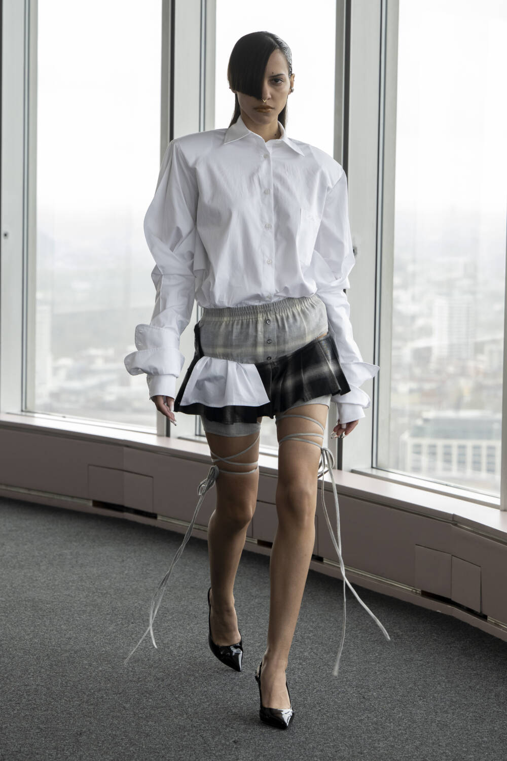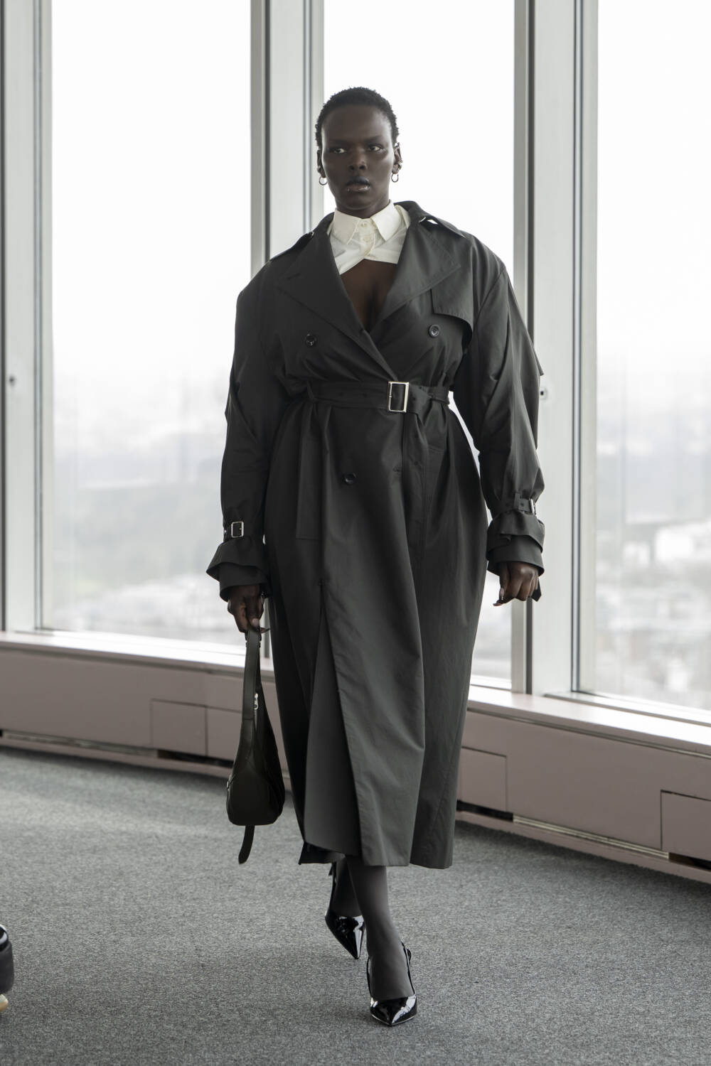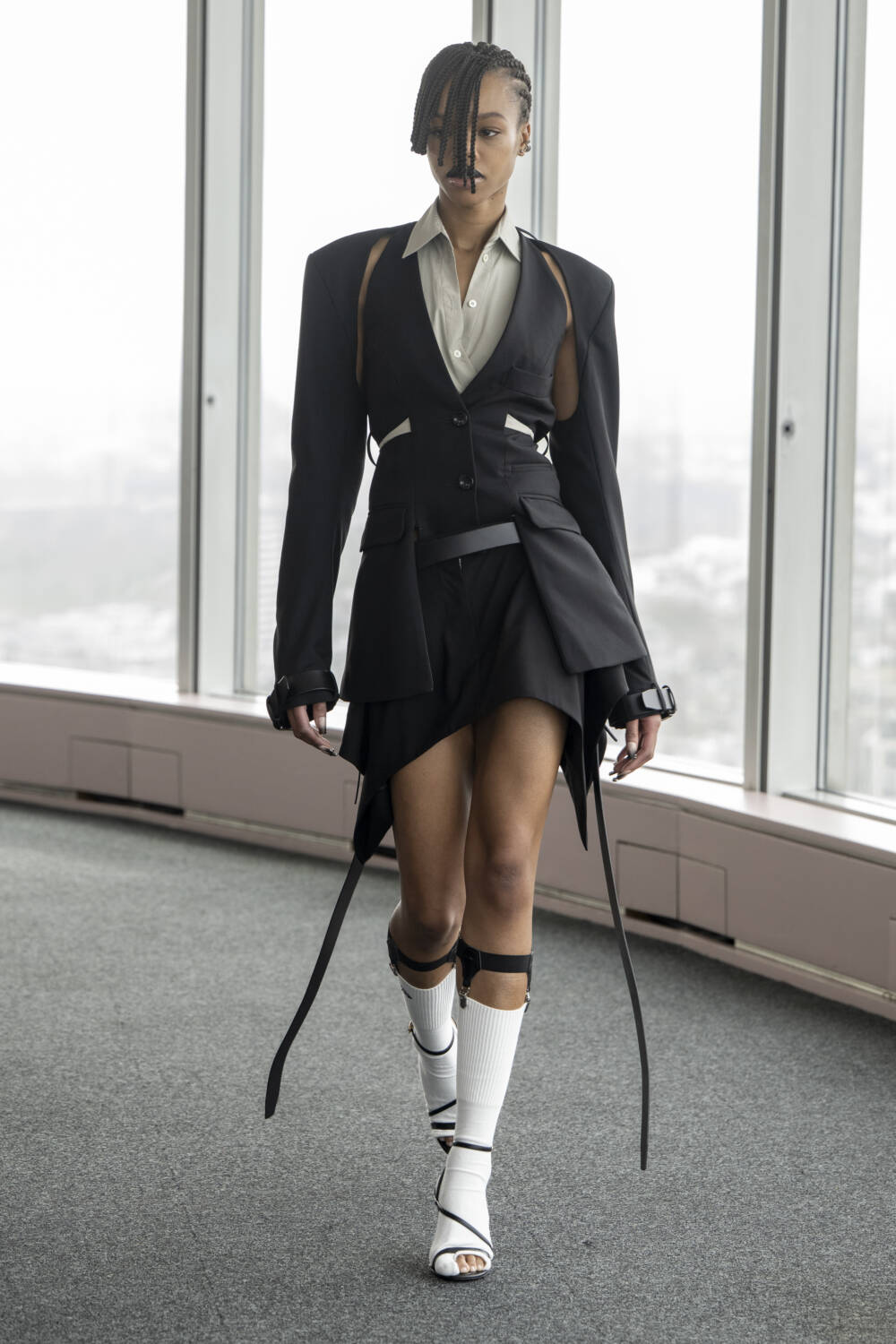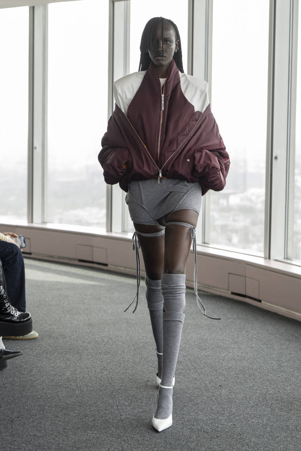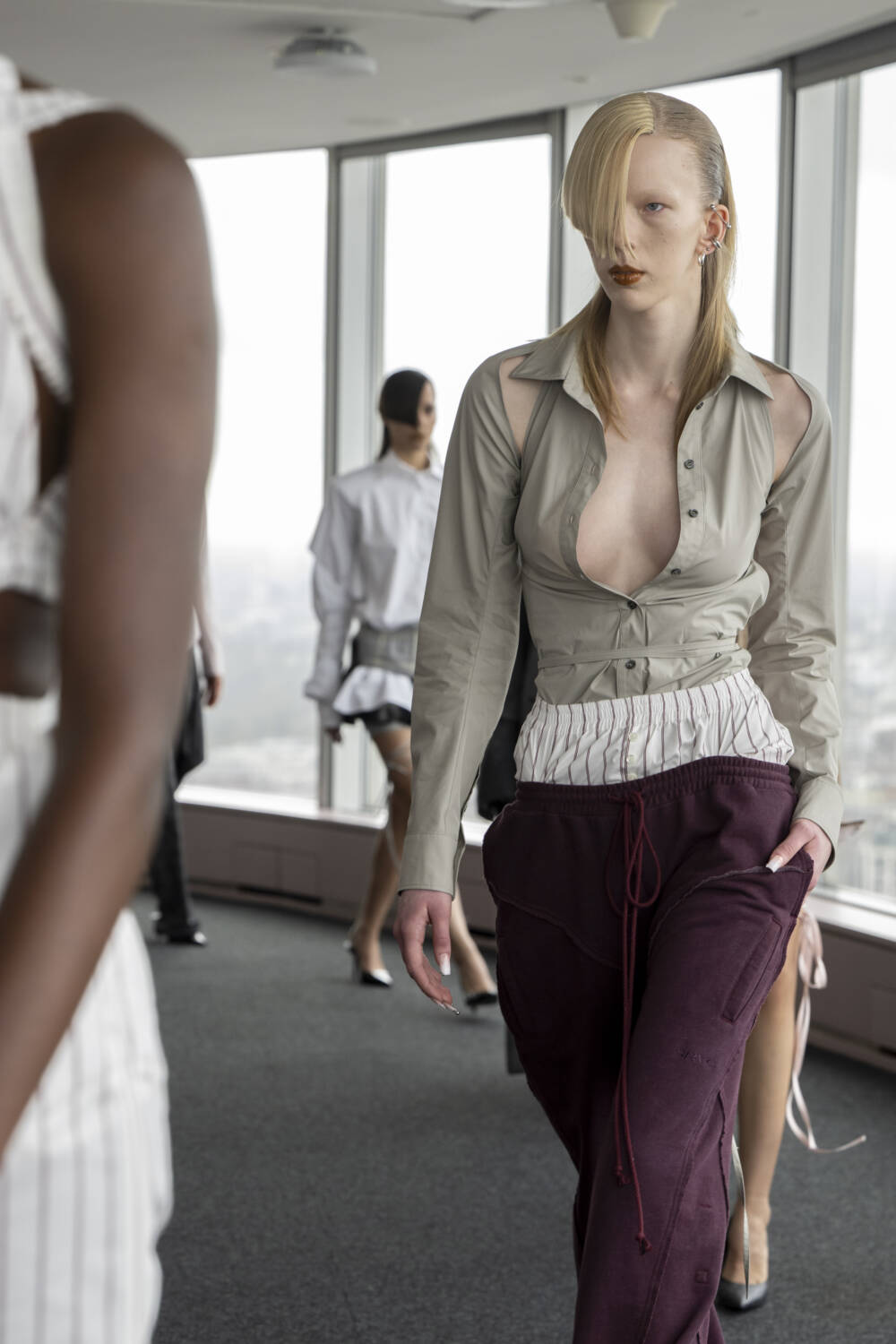 SRVC’s decided to take to the skies yesterday, opting for the dizzying heights of the 34th floor of London’s BT Tower for its AW25 catwalk – the first brand ever to do so. A considered choice to showcase the Ricky Wesley Harriott-helmed brand’s goal of communicating through clothes, what unfolded within the glass rotunda show space was an incisive investigation of how fashion can help you defend yourself against the relenting demands of everyday life.