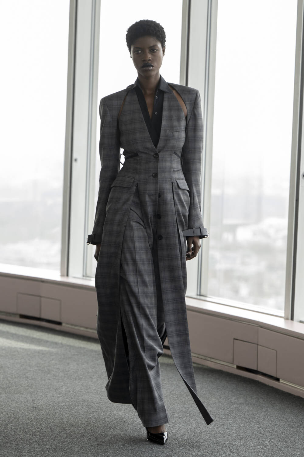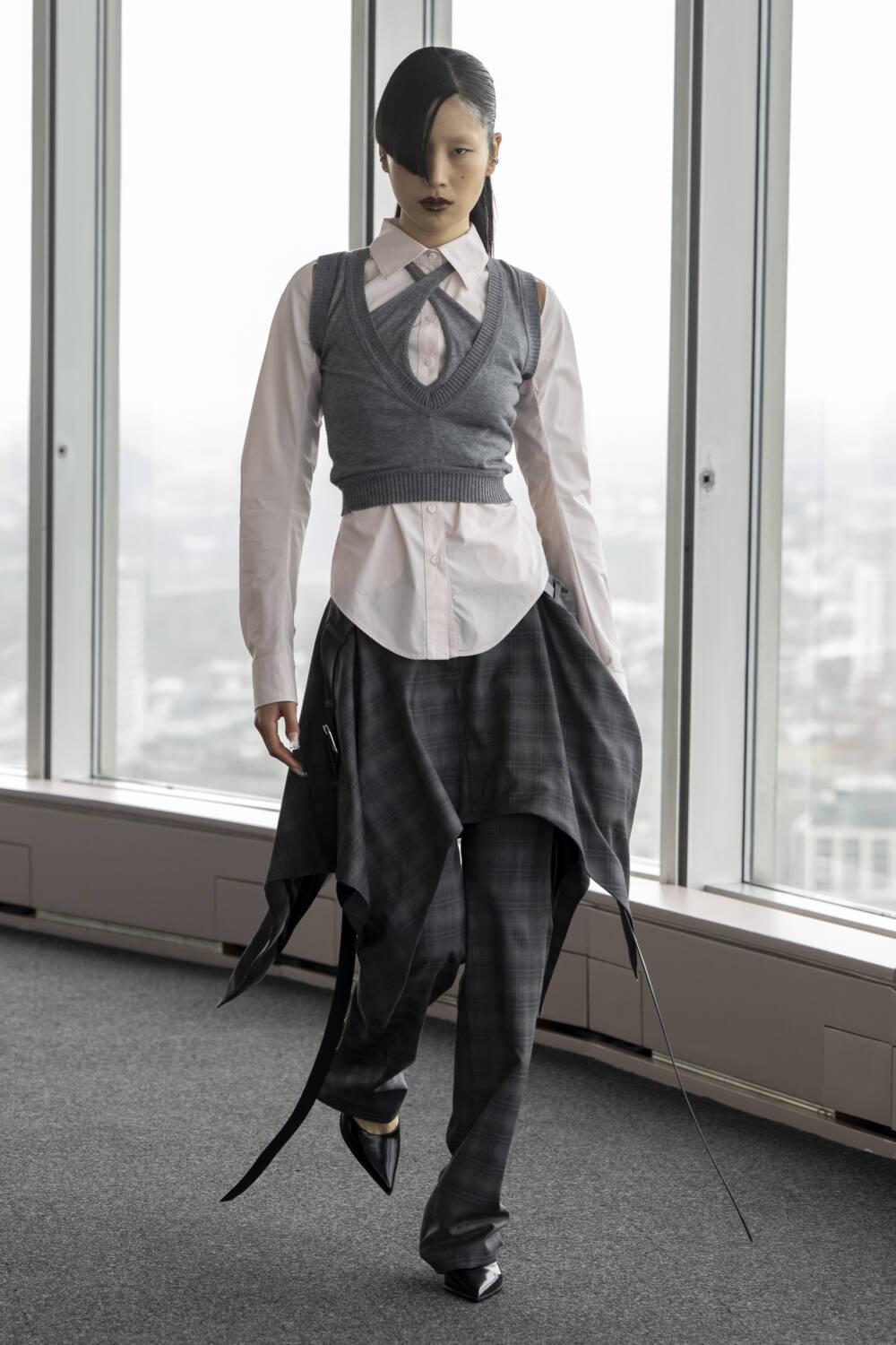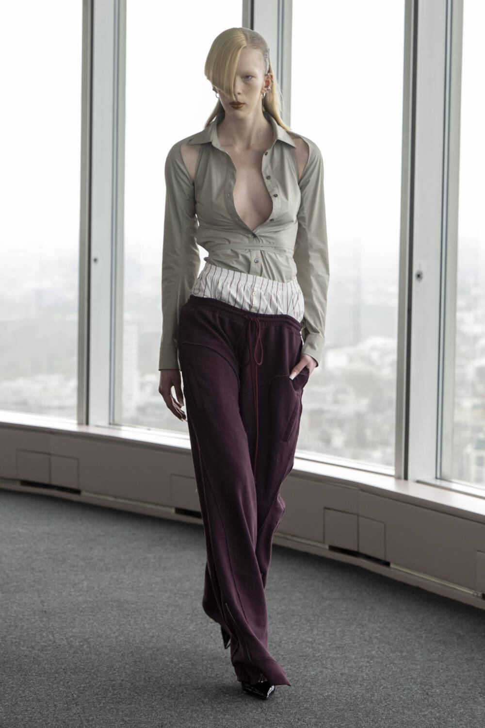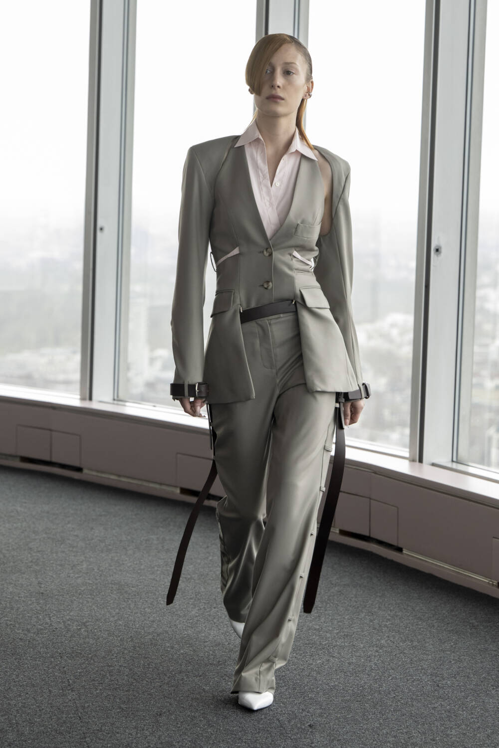 SRVC’s decided to take to the skies yesterday, opting for the dizzying heights of the 34th floor of London’s BT Tower for its AW25 catwalk – the first brand ever to do so. A considered choice to showcase the Ricky Wesley Harriott-helmed brand’s goal of communicating through clothes, what unfolded within the glass rotunda show space was an incisive investigation of how fashion can help you defend yourself against the relenting demands of everyday life.