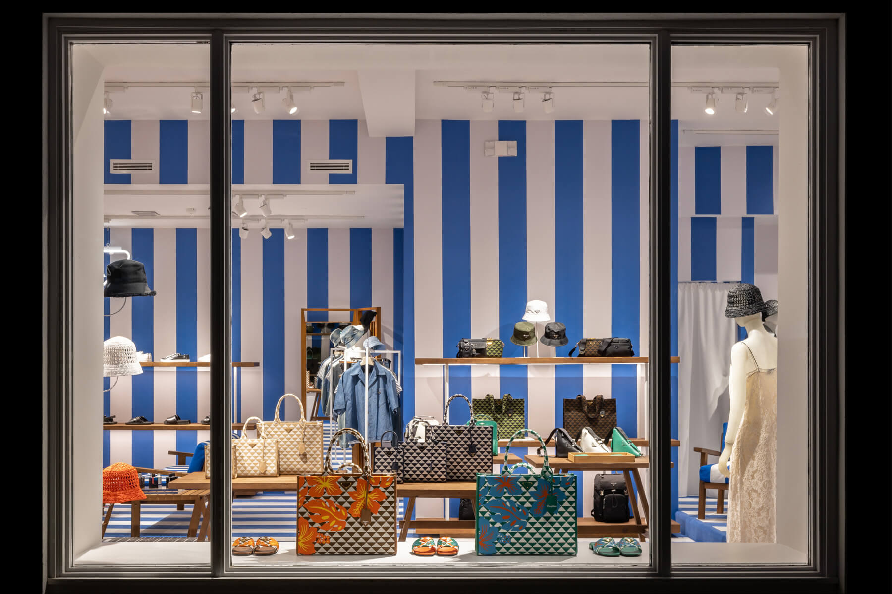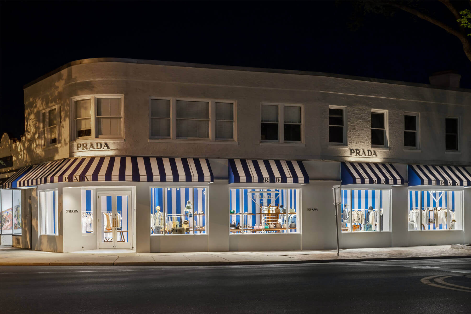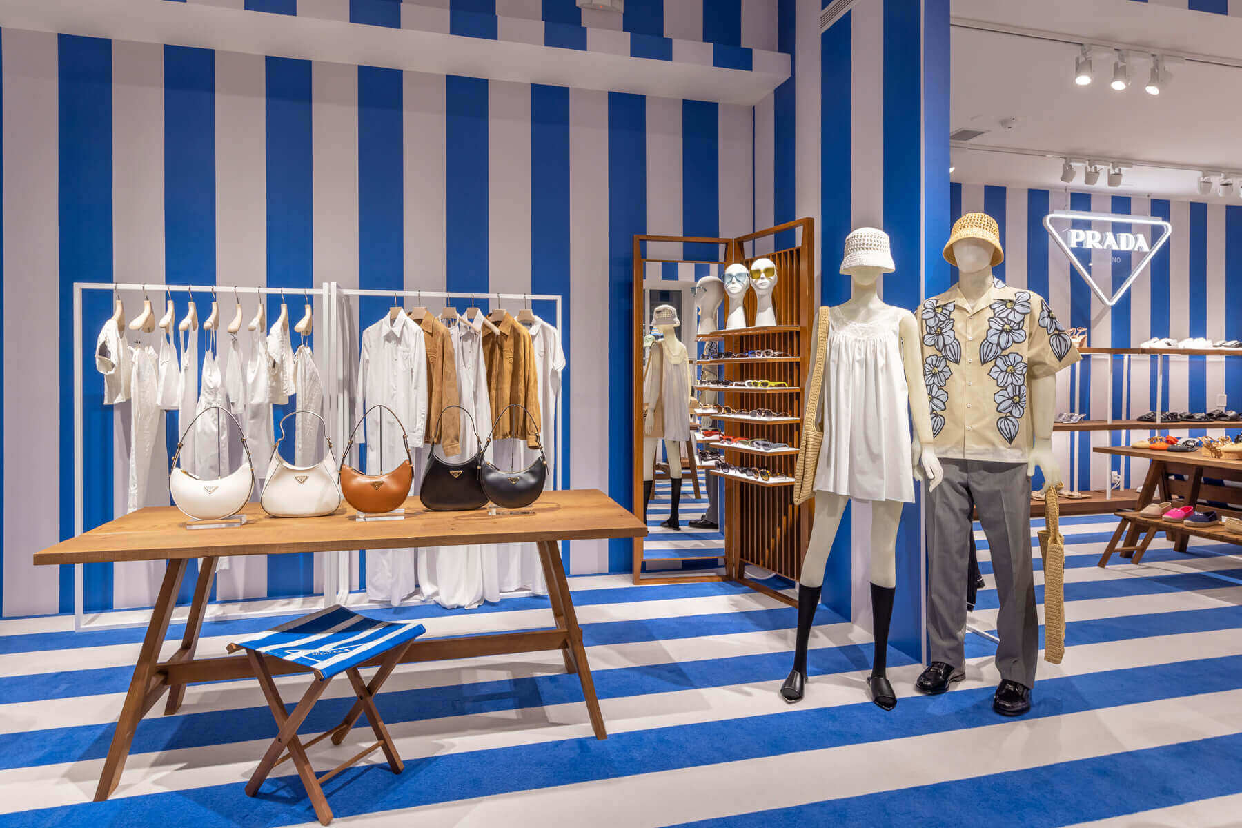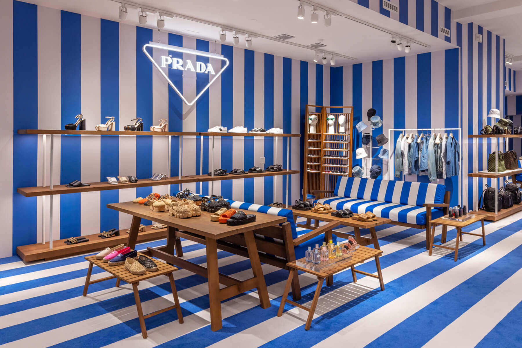Prada has opened their store again for the summer, swapping last year’s green and white striped theme with blue and white this year. Located at 2 Newton Lane in East Hampton, be sure to check out their exclusive Hamptons themed pieces.