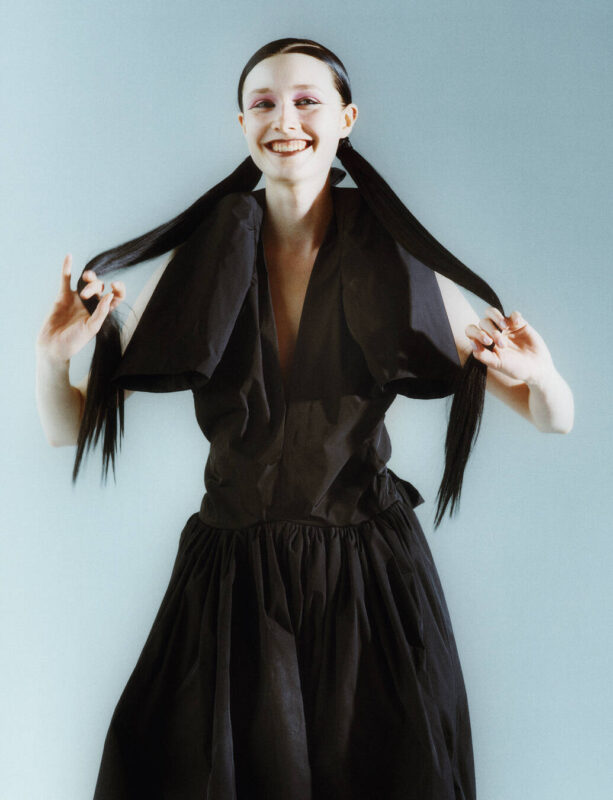 This endearing all-or-nothing attitude seems to be a constant for Dumi, whose enthusiasm for her craft has driven her to seek out and absorb every morsel of knowledge she can. With a BA in menswear from London College of Fashion and an MA from Central Saint Martins, she used her student years to work in New York for Phillip Lim, at Phoebe Philo’s Celine in Paris and then in Antwerp for Ann Demeulemeester (a move she thought was “chic and bohemian” – it was). There she learned the value of archiving and manifested one of her core design tenets. “A T-shirt’s a T-shirt,” she says. “At the end of the day, everything’s been done before. It’s how much can you make it yours?” That’s where the beauty of Dumi’s designs lies. Each piece feels both closely personal and distinctly otherworldly. “You have to build,” she says. “World-building with fashion is why I chose it. You’re able to show people a dream and I love it.”