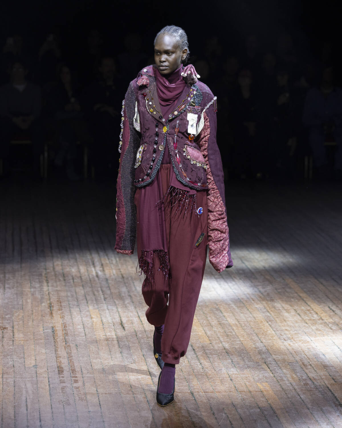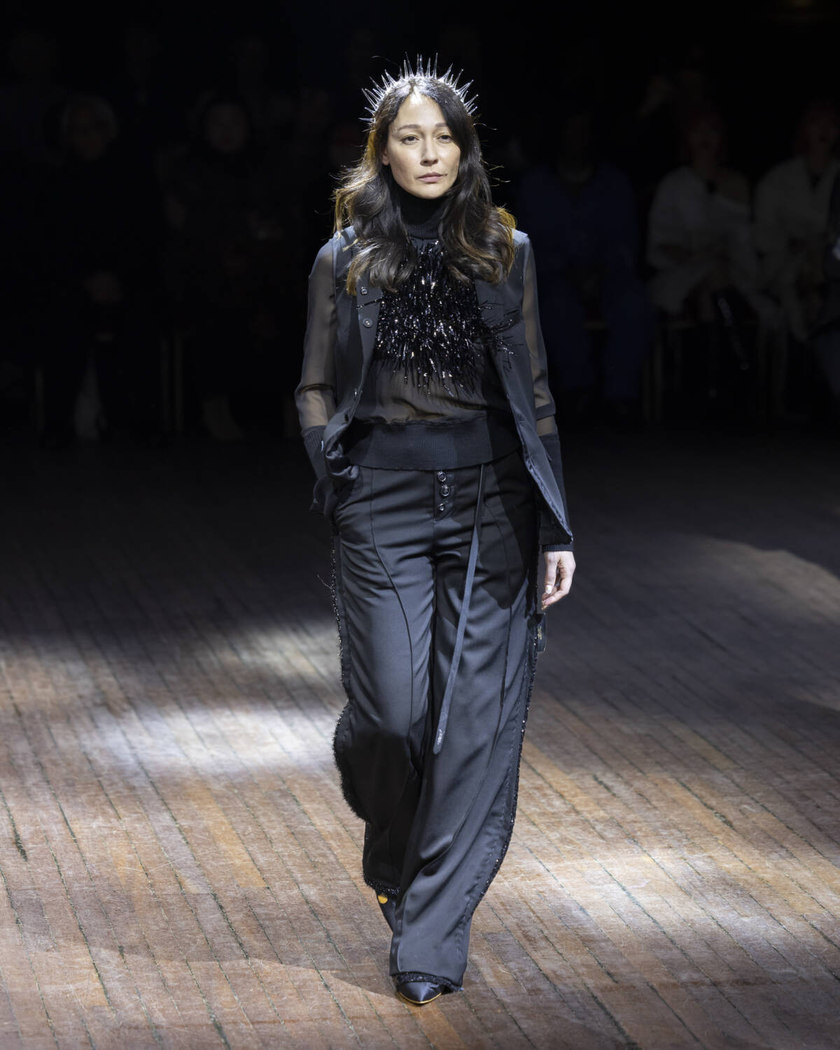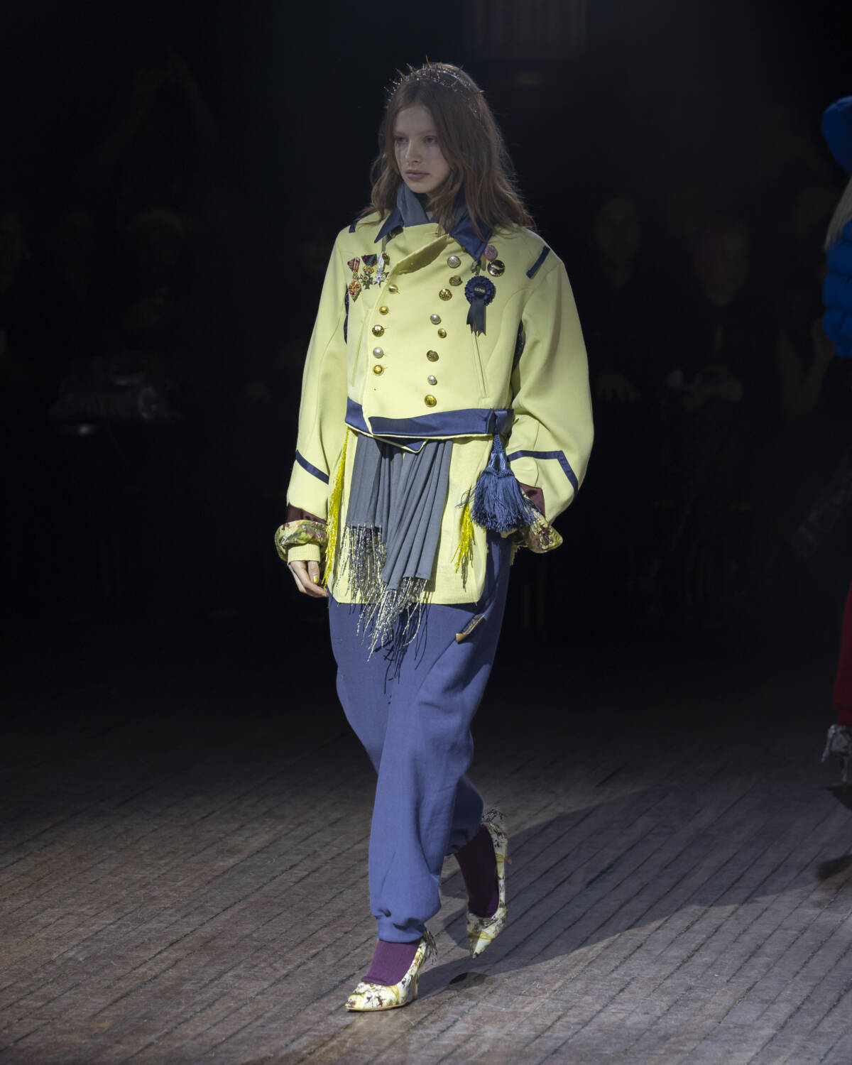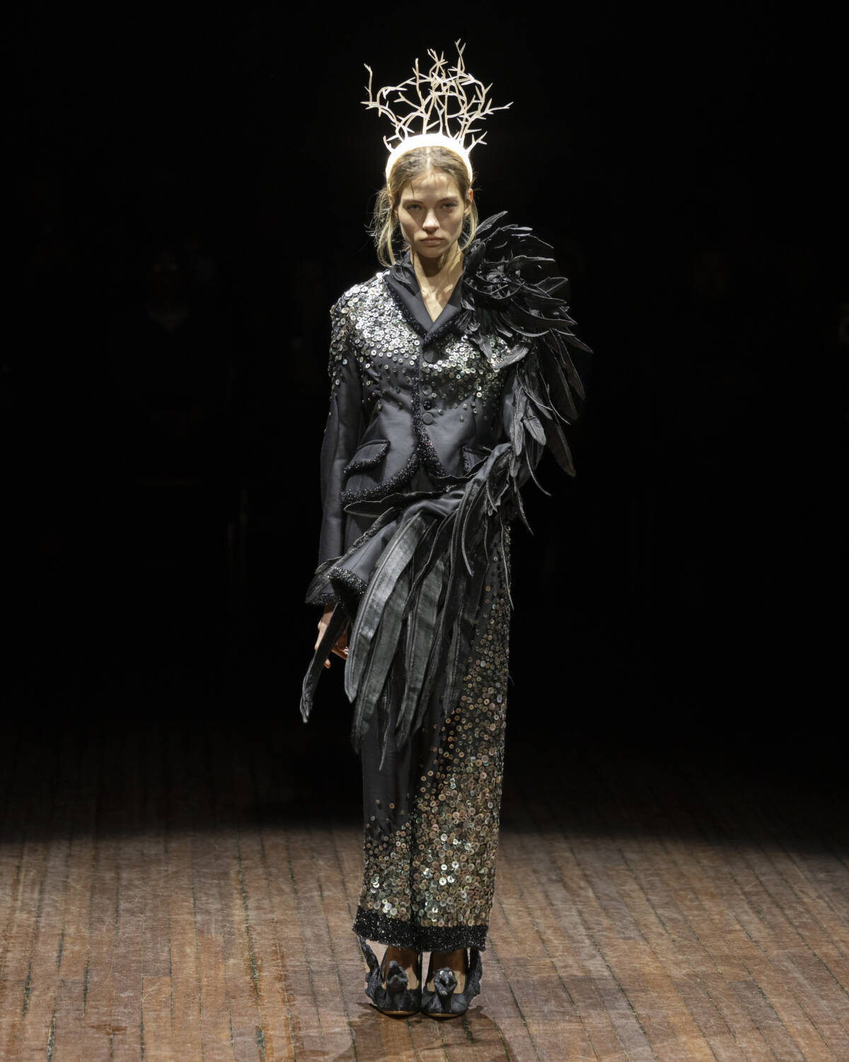 But the party had only just begun. Embellishment wasn’t an afterthought – it was the dress code. And this wasn’t the kind of camouflage that helped you disappear; it was the kind that ensured you stood out. Bijouterie, buttons and beads spilled over sweatshirts like confetti and bomber jackets bristled with keepsakes – military medals, lucky charms… the kind of trinkets collected over time. Champion sweats met floral stilettos because why not? Models turned partygoers – sometimes colliding, sometimes lost in thought – mirrored the collection’s contained chaos, sporting spiky headbands. At one point, a metallic blue cardigan dazzled into view – proof that this was an Undercover birthday, and that was when the real fun started.