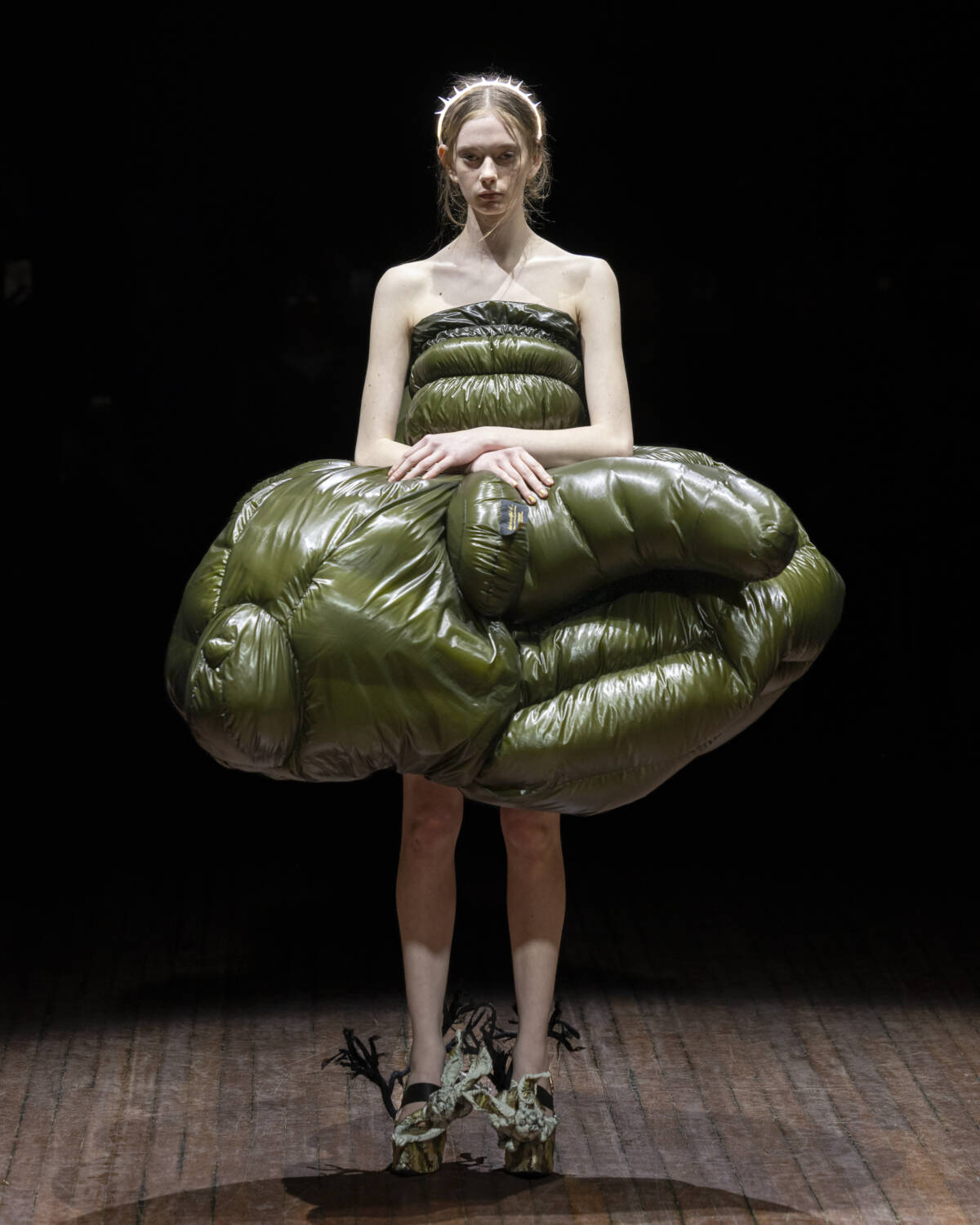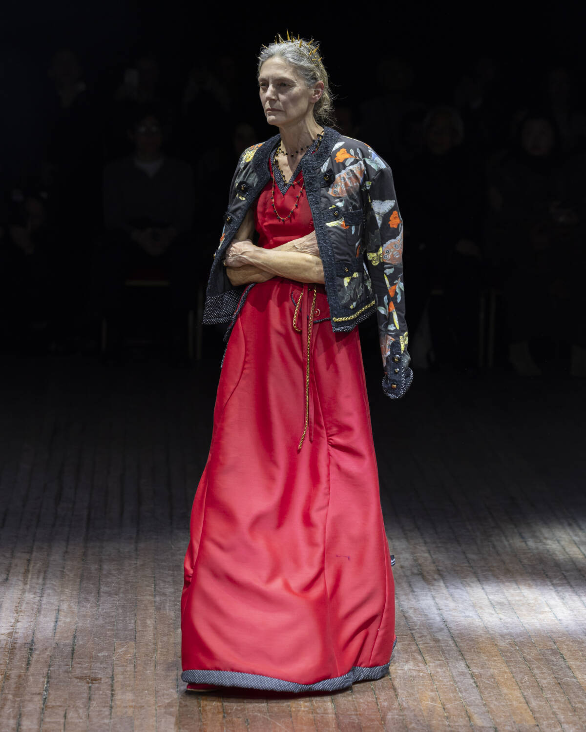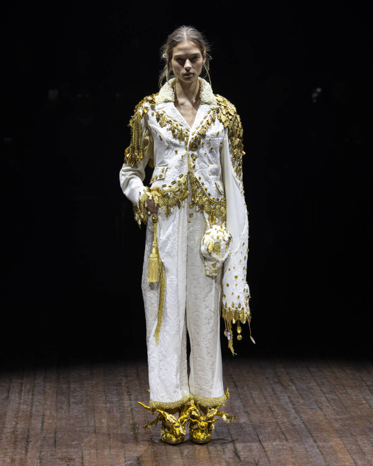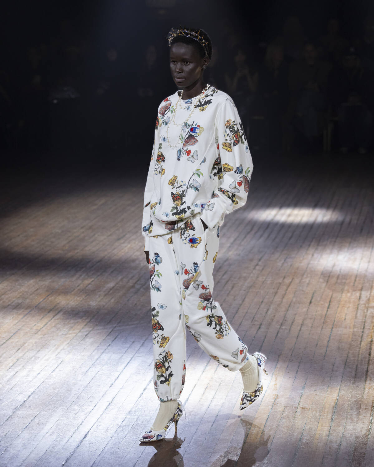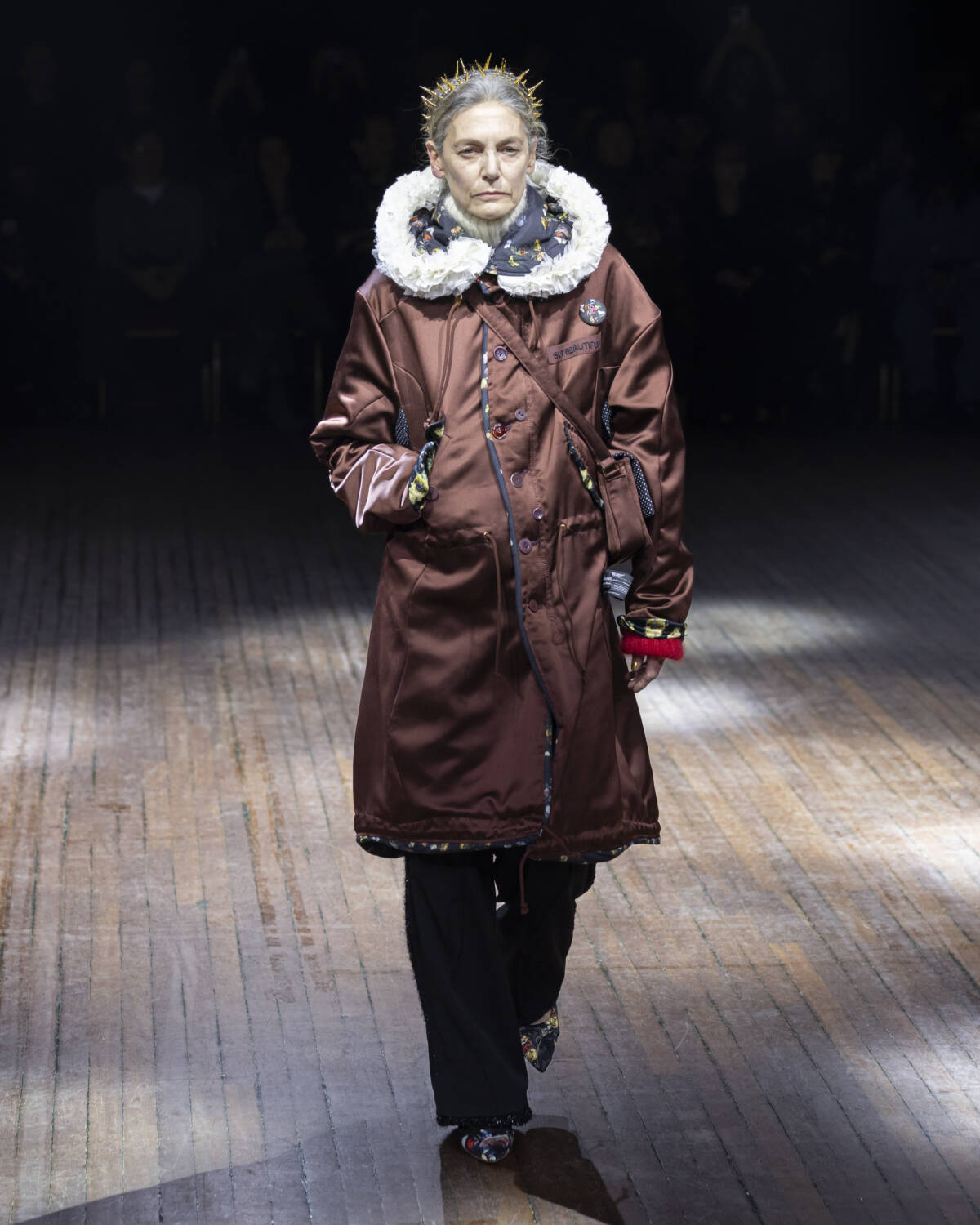 But the party had only just begun. Embellishment wasn’t an afterthought – it was the dress code. And this wasn’t the kind of camouflage that helped you disappear; it was the kind that ensured you stood out. Bijouterie, buttons and beads spilled over sweatshirts like confetti and bomber jackets bristled with keepsakes – military medals, lucky charms… the kind of trinkets collected over time. Champion sweats met floral stilettos because why not? Models turned partygoers – sometimes colliding, sometimes lost in thought – mirrored the collection’s contained chaos, sporting spiky headbands. At one point, a metallic blue cardigan dazzled into view – proof that this was an Undercover birthday, and that was when the real fun started.