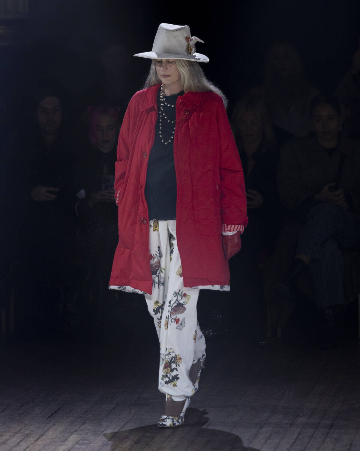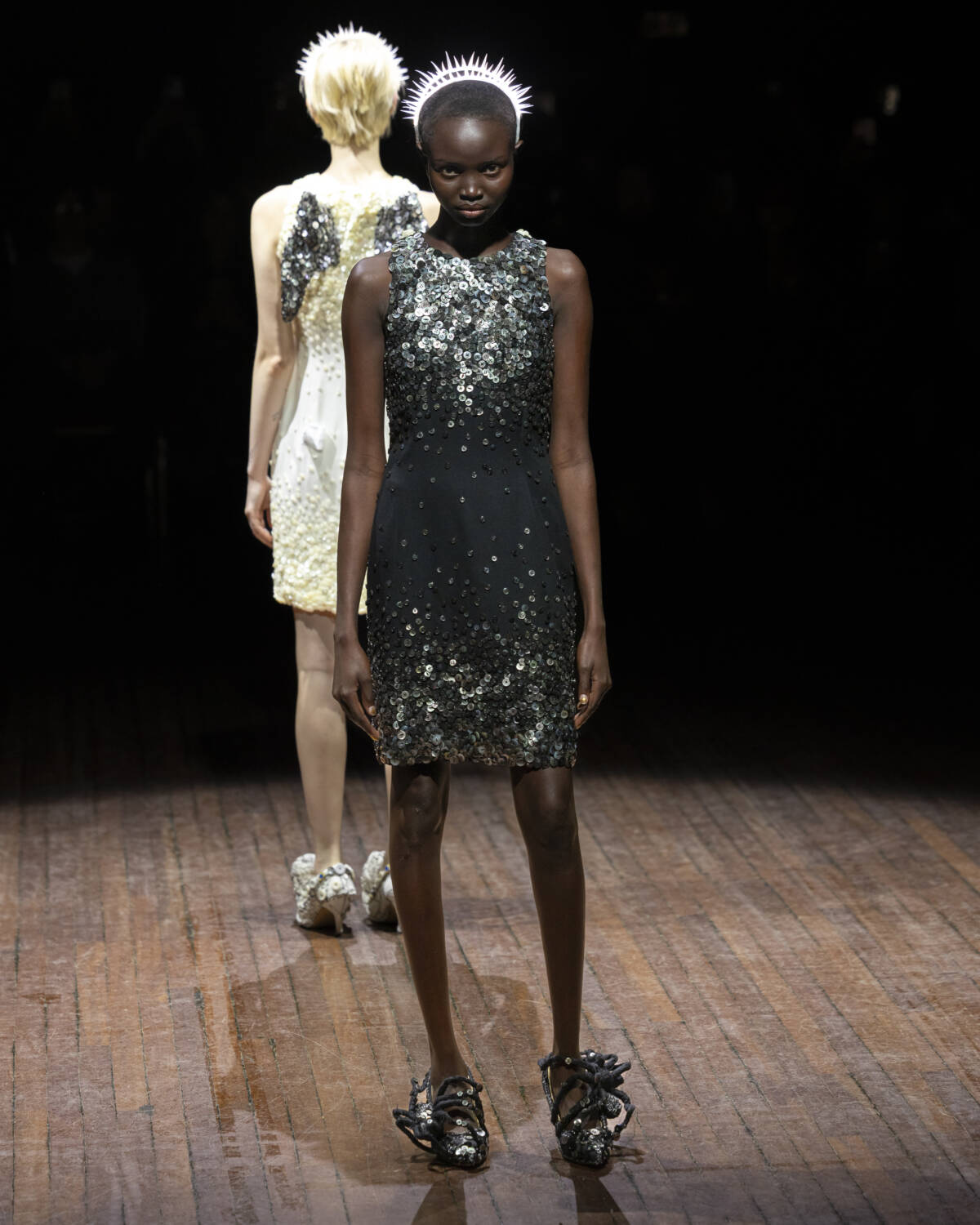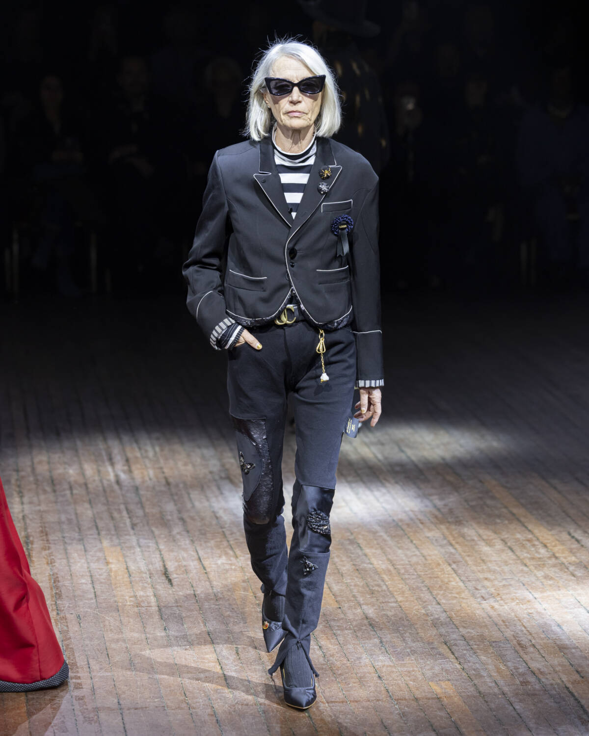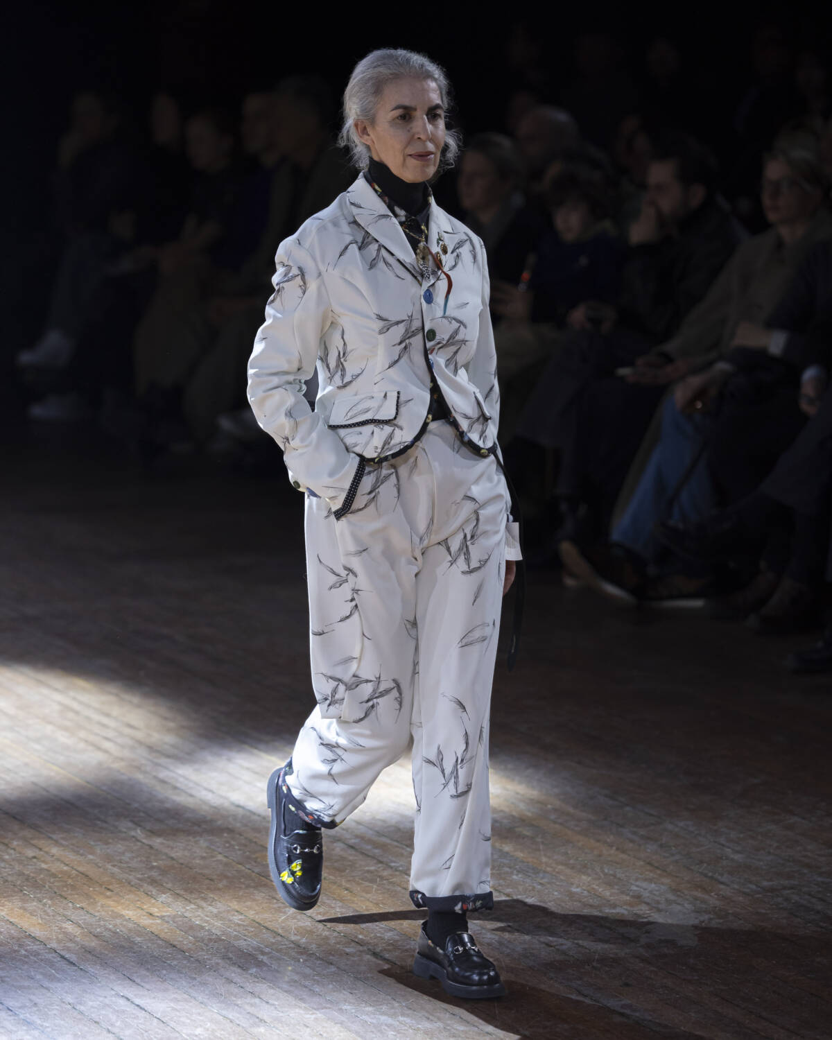 But the party had only just begun. Embellishment wasn’t an afterthought – it was the dress code. And this wasn’t the kind of camouflage that helped you disappear; it was the kind that ensured you stood out. Bijouterie, buttons and beads spilled over sweatshirts like confetti and bomber jackets bristled with keepsakes – military medals, lucky charms… the kind of trinkets collected over time. Champion sweats met floral stilettos because why not? Models turned partygoers – sometimes colliding, sometimes lost in thought – mirrored the collection’s contained chaos, sporting spiky headbands. At one point, a metallic blue cardigan dazzled into view – proof that this was an Undercover birthday, and that was when the real fun started.