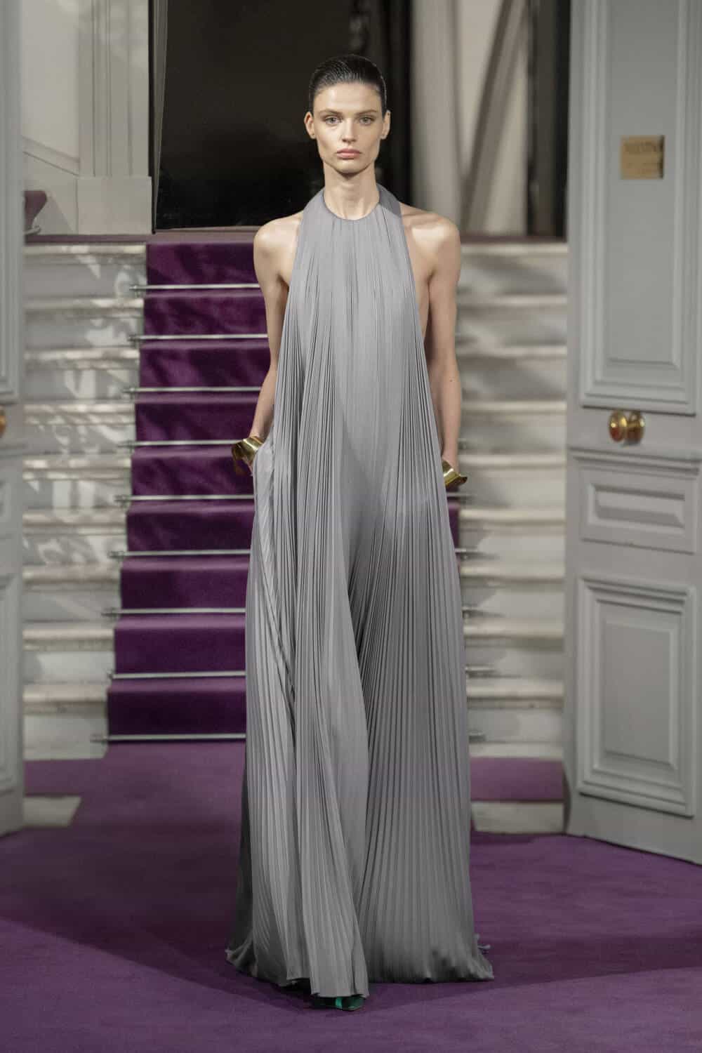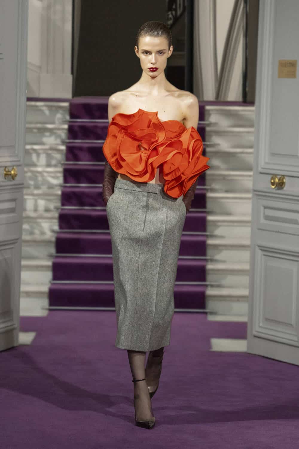 The maison’s trusted couture clients will undoubtedly be drawn to the collection’s boxy parkas and swing skirt combinations, alongside the high-waisted trousers, relaxed suit jackets and vests with scooped necklines. Where Piccioli thrives is his ability to collide understated elegance with serious show-stopping power. Think floor-sweeping capes made from a bed of silk roses, and opulent skirts and coats that, at a glance, looked tinsel-like yet were actually crafted from strands of metal. It made for a dazzling highlight amongst this season’s couture shows.
