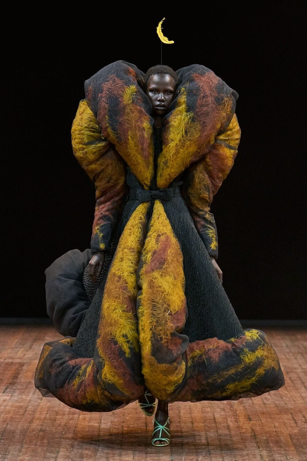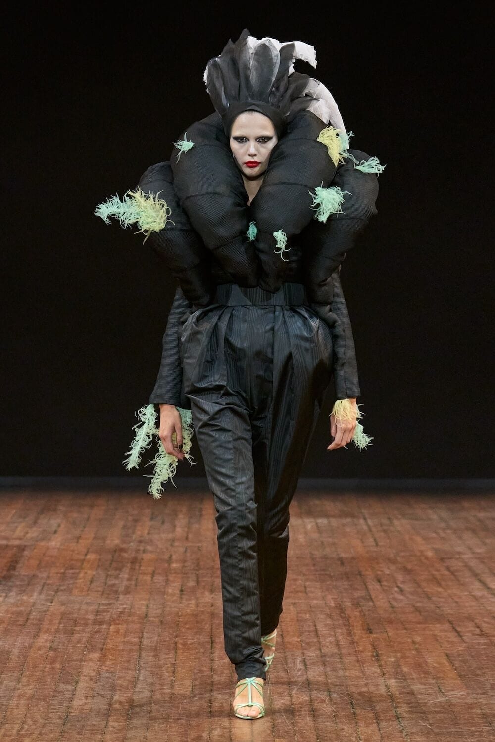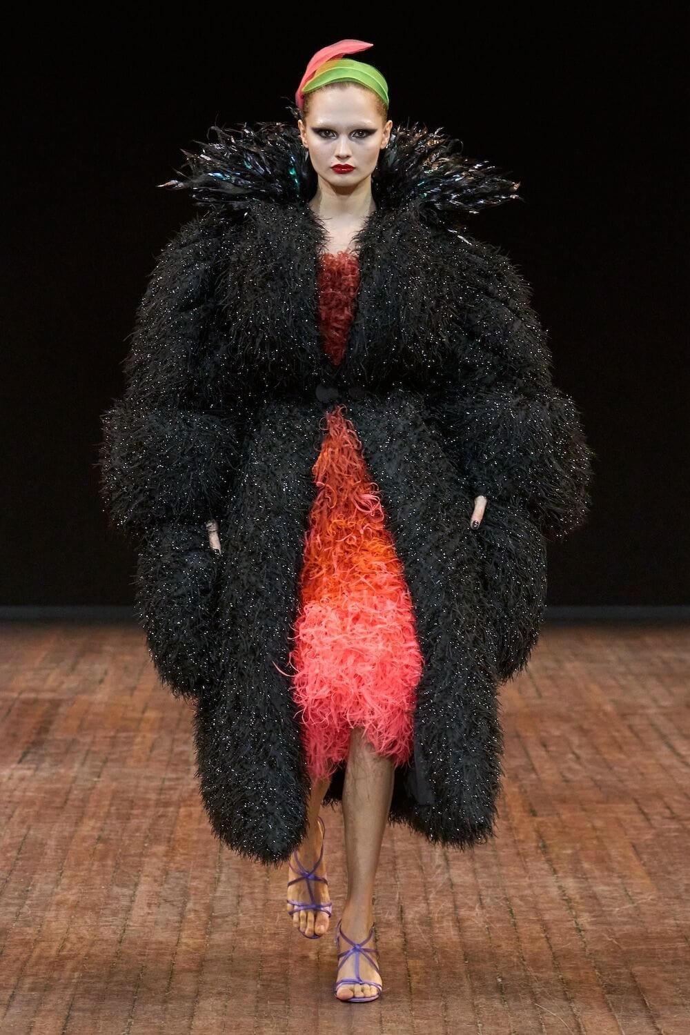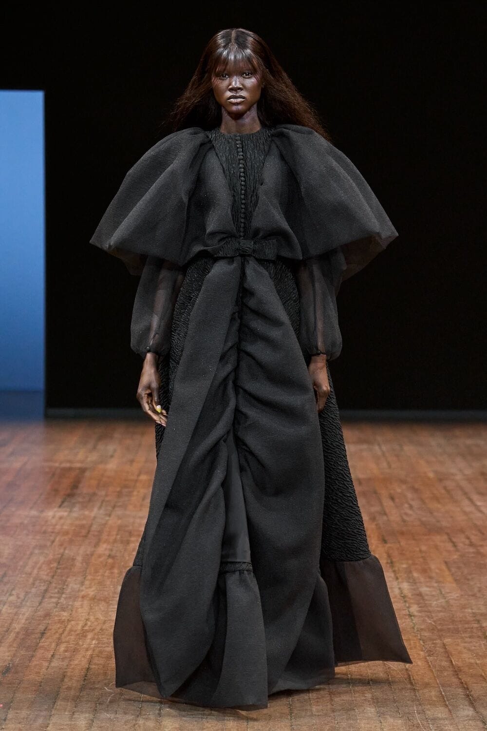 The feathers – long a fixture of haute couture as symbols of fantasy and feminine display – became something else entirely here: infrastructure. They built the garment but also obscured it. Their removal deflated the robust silhouette so much so it seemed to deflate the myth that couture equals adornment. What remained was simpler, monochrome and in many ways, more unsettling.