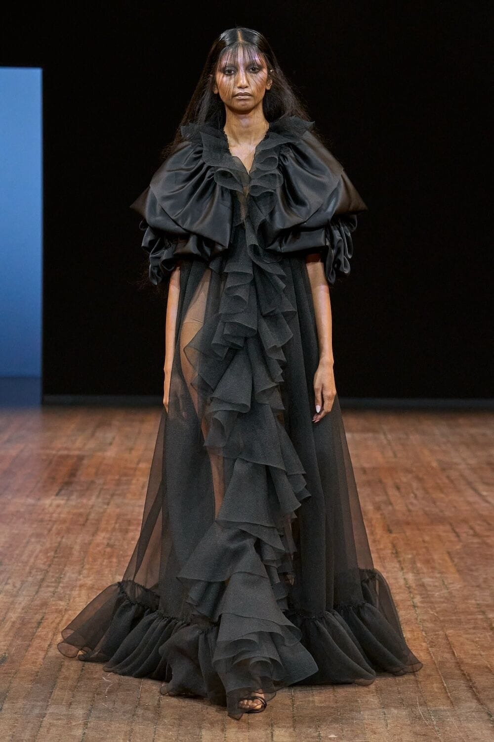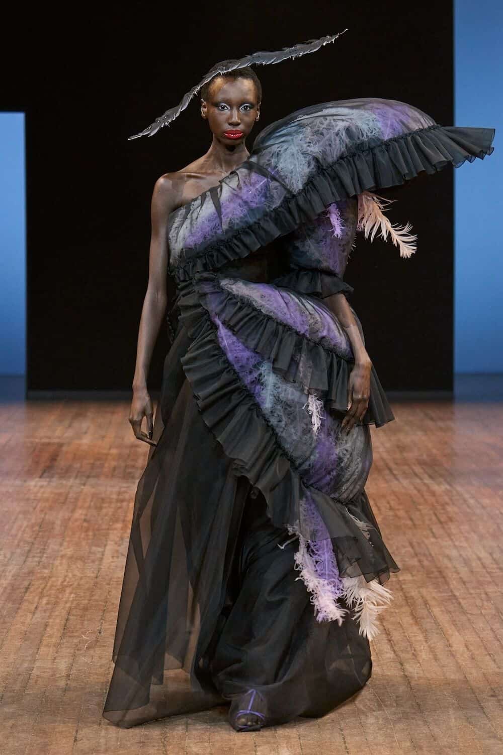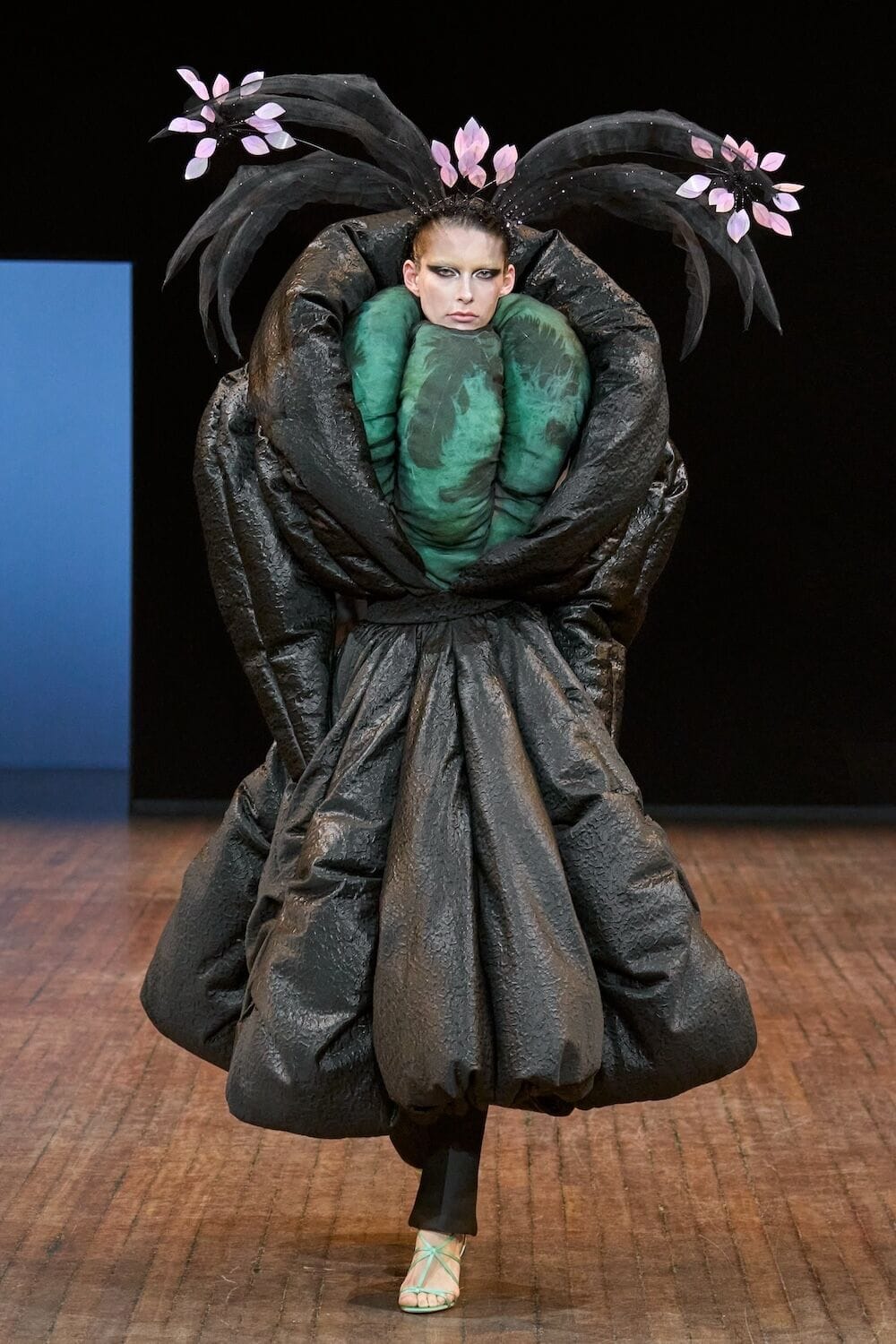 The feathers – long a fixture of haute couture as symbols of fantasy and feminine display – became something else entirely here: infrastructure. They built the garment but also obscured it. Their removal deflated the robust silhouette so much so it seemed to deflate the myth that couture equals adornment. What remained was simpler, monochrome and in many ways, more unsettling.