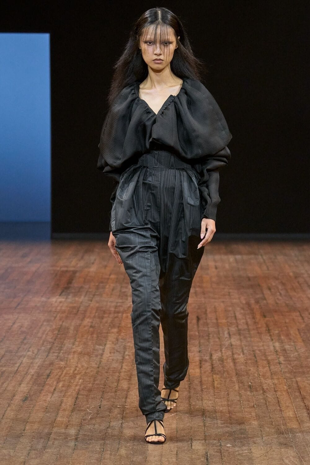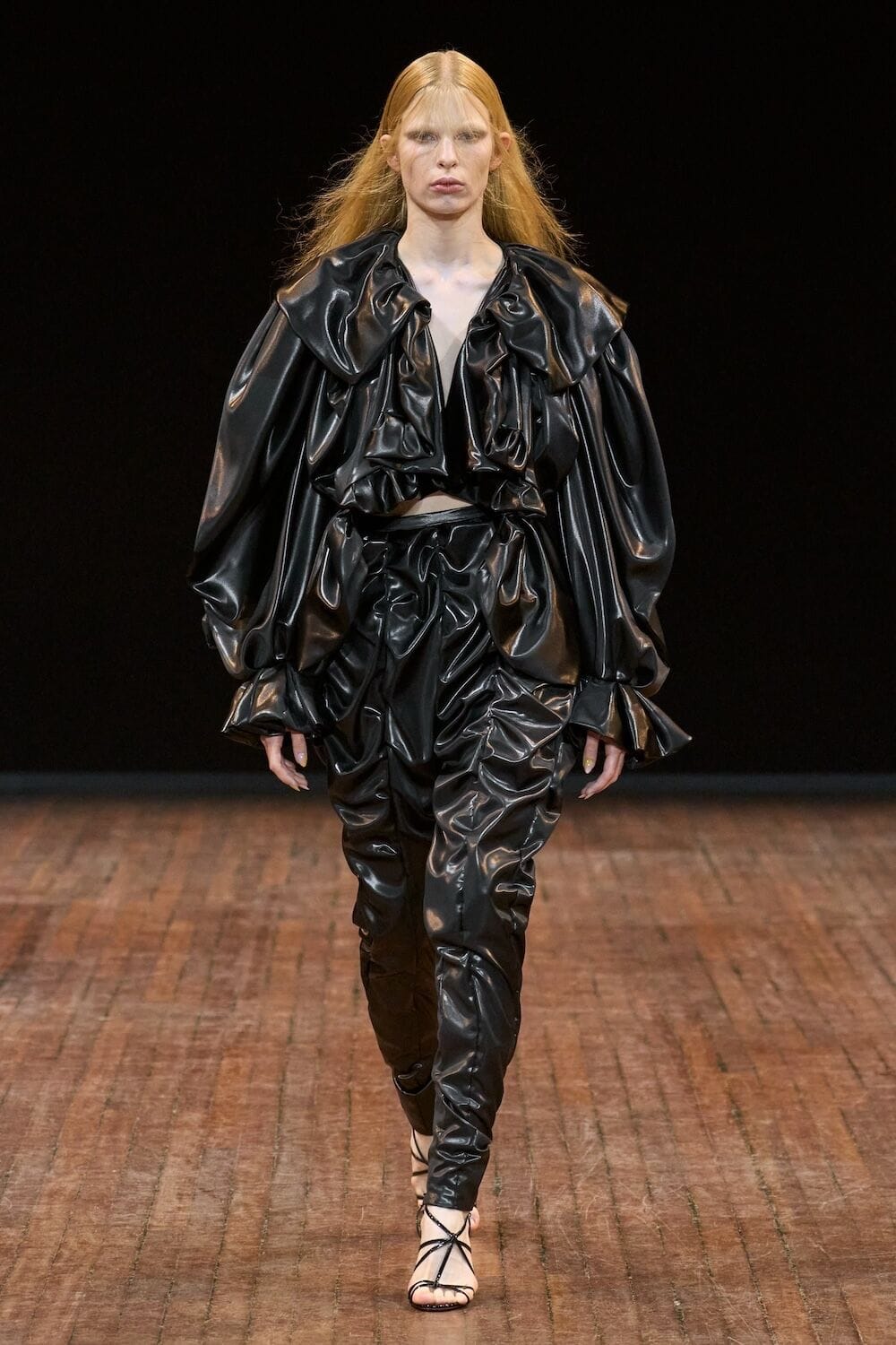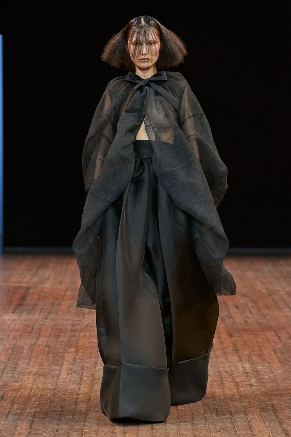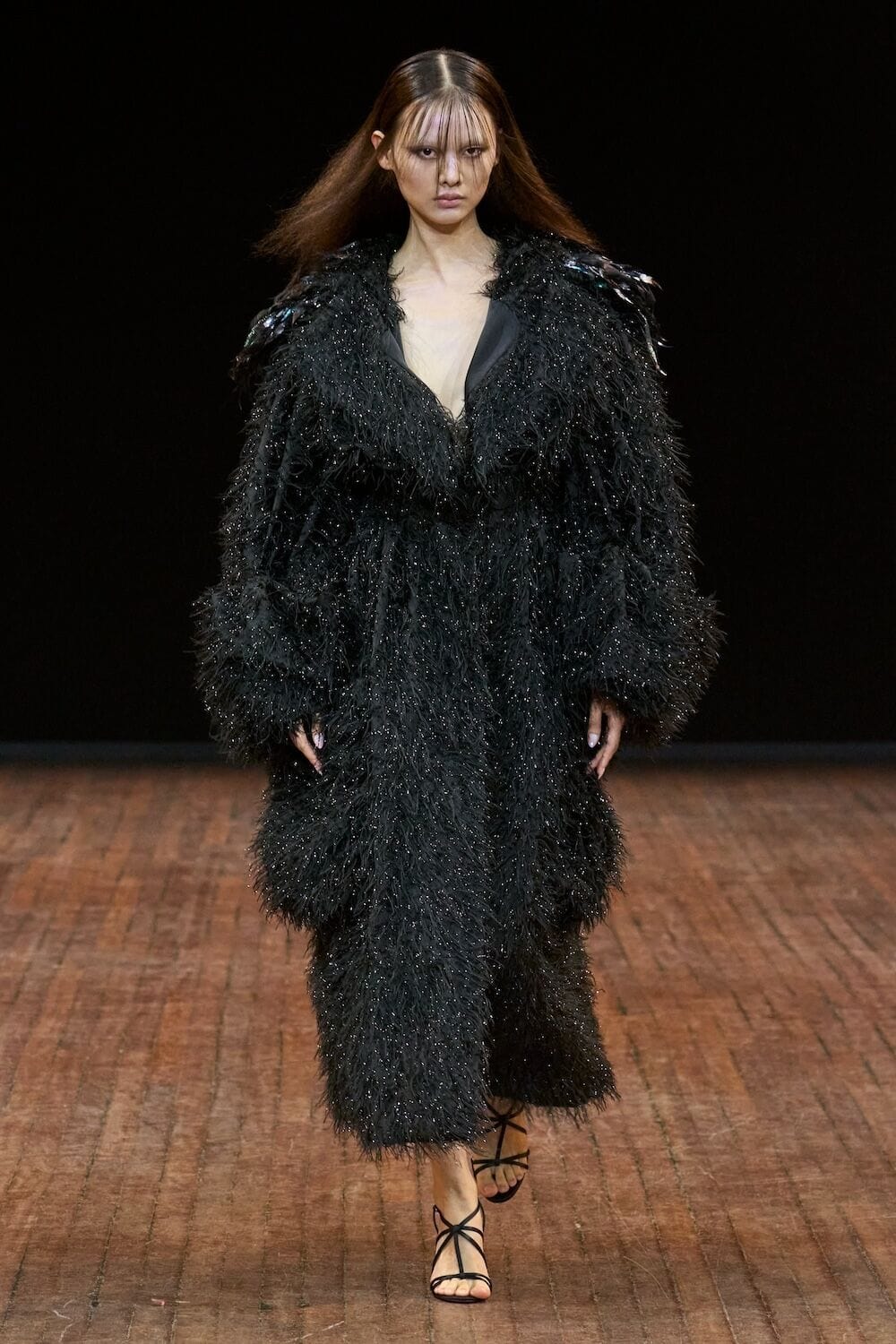 The feathers – long a fixture of haute couture as symbols of fantasy and feminine display – became something else entirely here: infrastructure. They built the garment but also obscured it. Their removal deflated the robust silhouette so much so it seemed to deflate the myth that couture equals adornment. What remained was simpler, monochrome and in many ways, more unsettling.