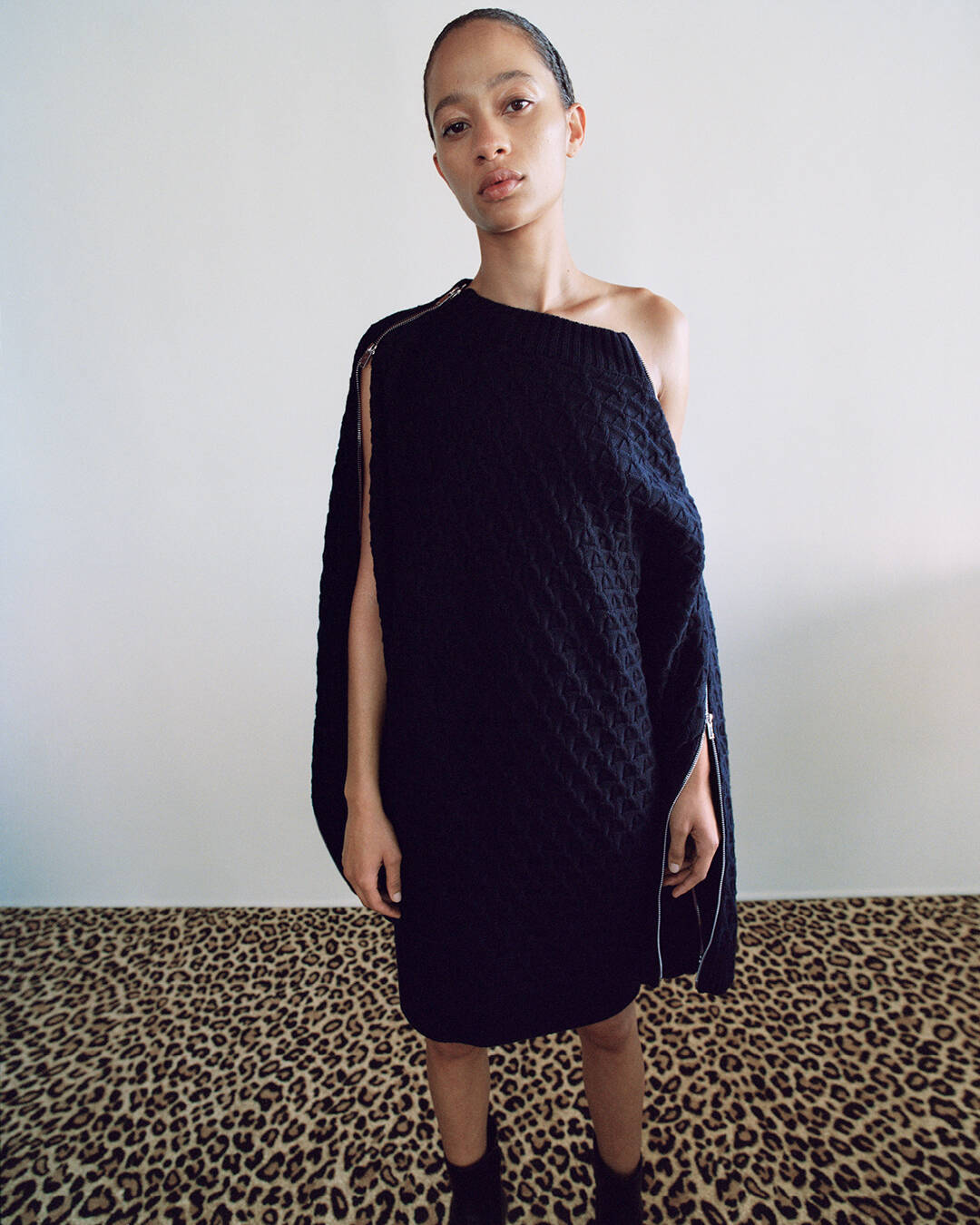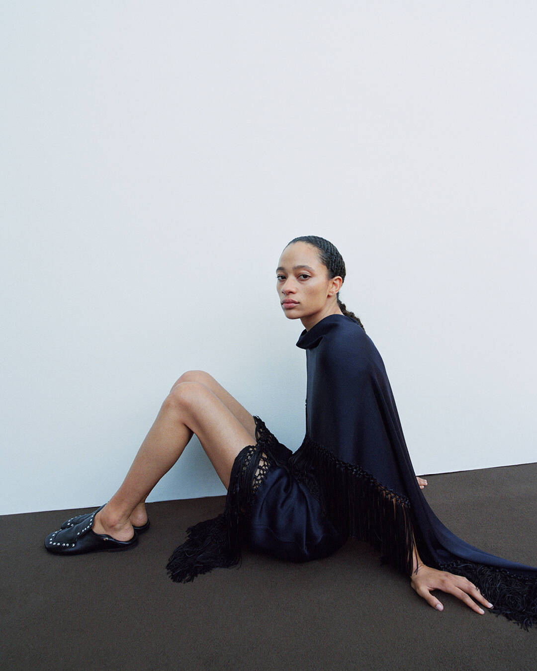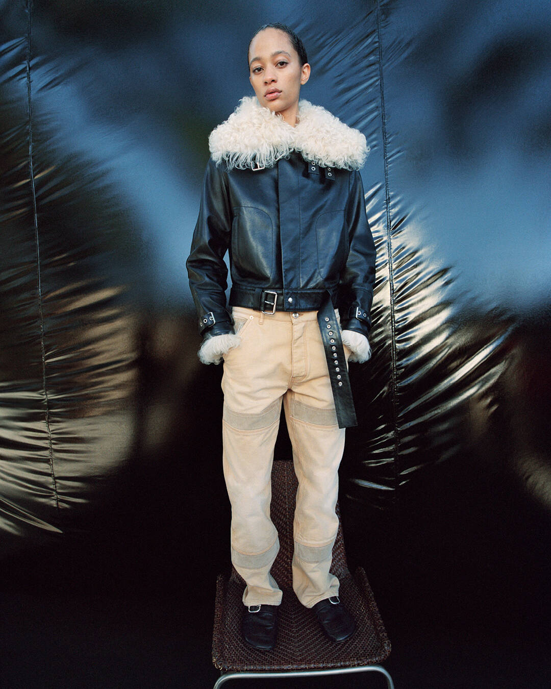 True to form, Bonner composes a wardrobe where refinement and edge walk in step. Masculinity and femininity entwine in silhouettes that balance urbanity with utility. Lavish fringe dresses flounce in measured excess, conjuring the archival glamour of Ebony and Jet, while navy satin and ivory cashmere are cut to captivate. Open-back knits find their counterpoint in biker jackets, the toughness of leather softened by creamy Mongolian shearling – a timeless take on the trending jacket.