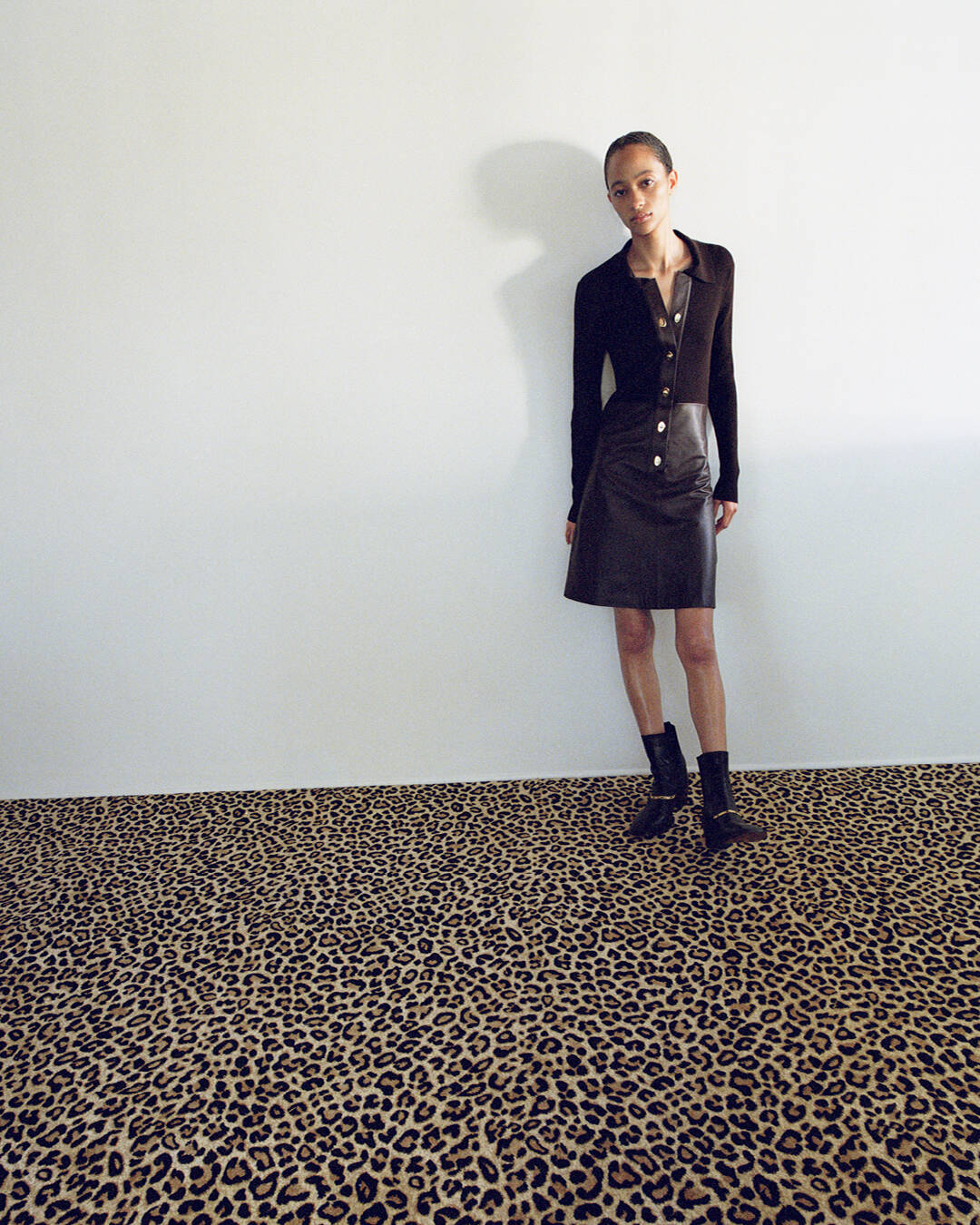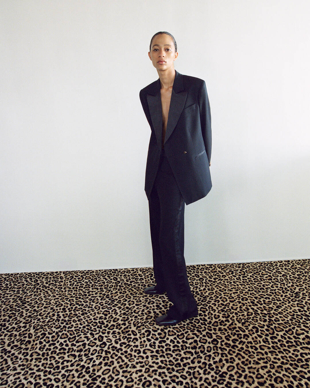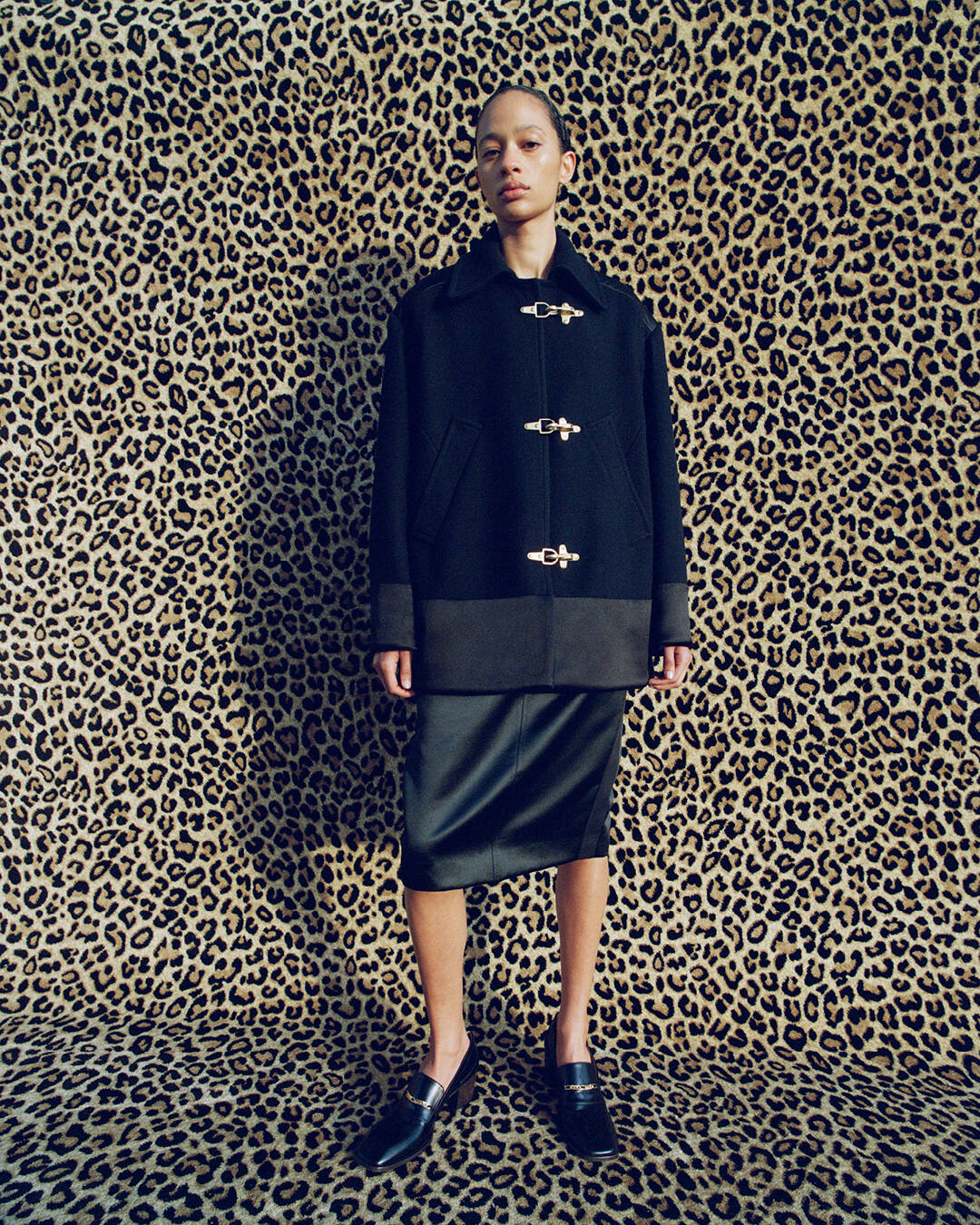 Against leopard-print backdrops, heritage tailoring takes centre stage: a Crombie collaboration reworks the classic grate coat in navy wool with leather accents, while Anderson & Sheppard lend their mastery to a cavalry uniform, its supple satin contrasts and embossed gold buttons exuding stately elegance.