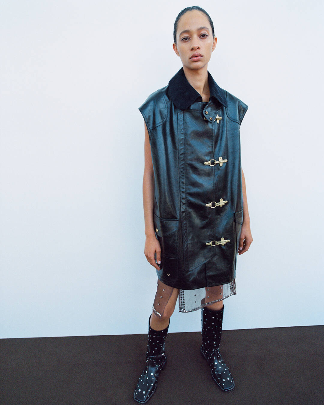 Craft runs deep, materialising in natural indigo and textural corduroy contrasts. Macramé sets handwoven in India sit alongside silk and organza, where chrome stud embellishments transform into fine embroidery. The finishing touch? Gold-studded pilgrim loafers, leather boots and the Jewel Mary Jane, reissued in gold. This is a designer who understands glamour – not with excess, but with intention.