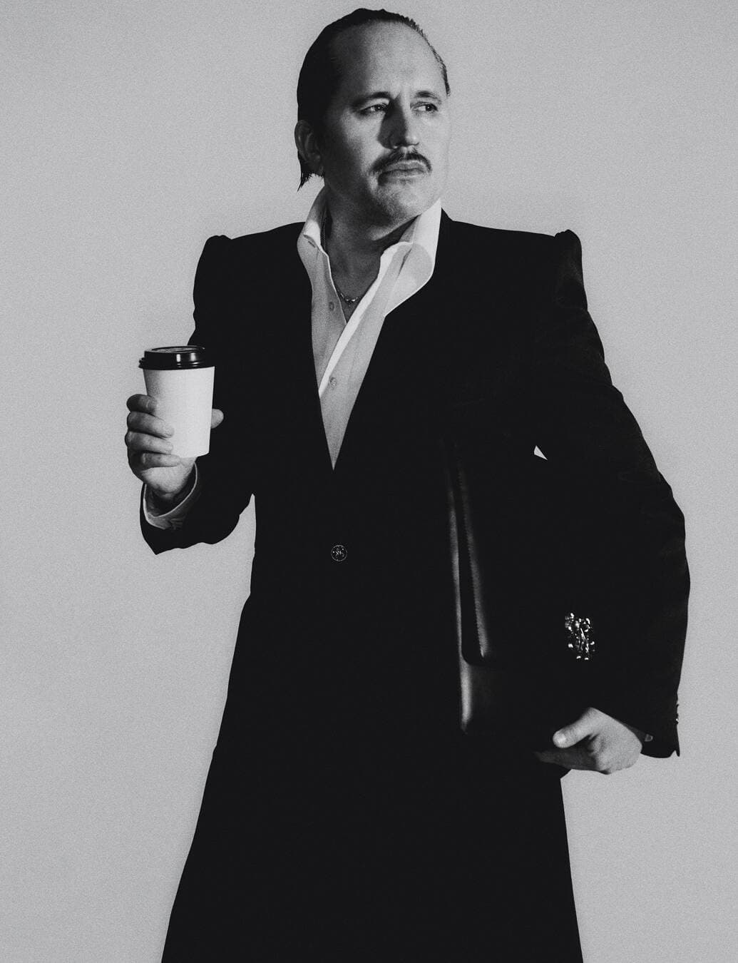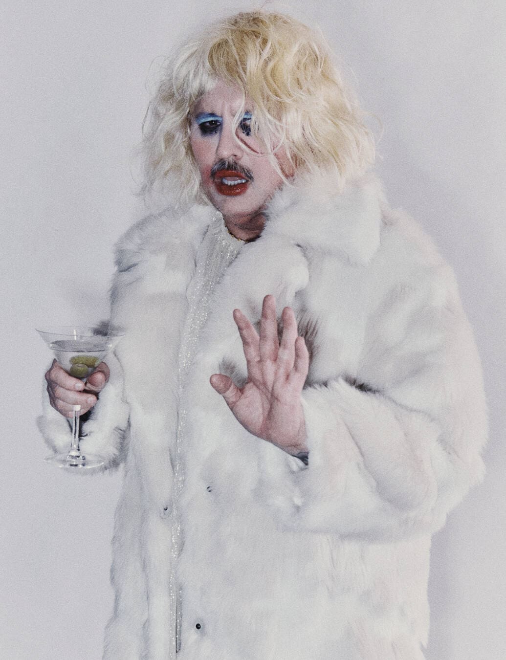 Wearing a dressing robe with classic black pumps while waving around a lit cigarette and newspaper, emphatically smiling with slept-in hair and an afterglow, he’s the embodiment of the ‘Morning After’. In a sharp-shouldered overcoat, Chavarria channels ‘Executive Realness’ with the same stark professionalism he injected into the AW24 show and, in a sequinned dress, faux-fur coat, fluffy high heels and smudged make-up, he takes on the disorderly role of ‘Aunt Charlie’. The one where he’s wearing an azure button-up jumper and bug-eye sunglasses they’ve aptly named ‘Griselda’ after “the Godmother” of Miami’s drug empire. Tapping into Chavarria’s Latinx side, ‘Cholombiano’ – an ode to the Mexican subculture of the same name, it means ‘Colombians’ in Spanish –shows him in a flannel shirt tucked into wide-legged jeans and carrying a bouquet of red roses. ‘Latinaire’ wears a plum-coloured leather jacket and a tartan skirt. The creative pair even link back to the designer’s Californian upbringing with ‘Fresno Dad’, a man sporting a Dickies jacket and dirty-looking dungarees while he chugs a ‘chill’ beer. Decked in biker leathers he is ‘Oh Daddy’, while ‘Dykes on Bikes’ depicts Chavarria in a classic white tank top, admiring his biceps, and then, another audacious character, ‘Y2K Club Promoter’, wears monograph MCM jeans with a snakeskin bomber jacket and rave-ready sunglasses. His favourite, and the penultimate one of the ‘faces’, is ‘Walter Mercado’. Wearing a multi-hued and crystal-embellished alb, a religious robe, Chavarria embodies the late Puerto Rican astrologer and actor that the character is named after with a unique, high fashion flair.