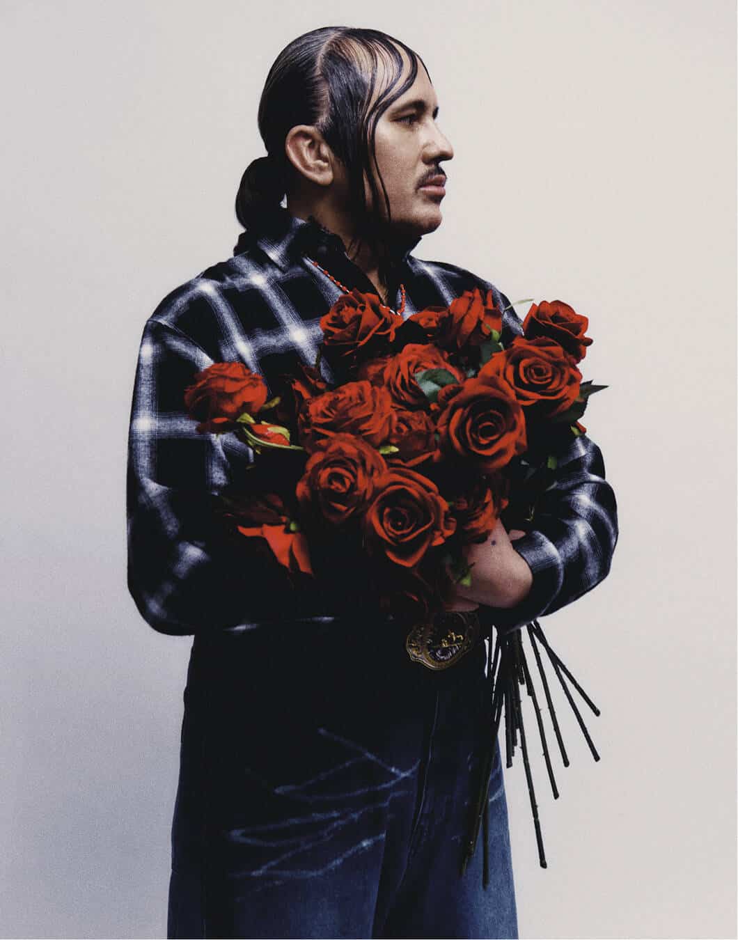 Configured as a candid supper club experience, the show took place in Greenpoint in the same building as his studio. (It’s avast, historic warehouse space, situated along the banks of the East River between Manhattan and Brooklyn. Before Chavarria moved his brand in, the repository functioned as a manufacturer of aircraft carriers.) Once his models completed their walks and arranged themselves behind a long, white, cloth-draped table set with an altar and votive candles – a high-glam Last Supper– his plan was to put the collection on view publicly for the rest of the evening via a short film that he dubbed Safe From Harm. The democratic nature of it was meant to be “like a gift to New York City,” says the CFDA Menswear Designer of the Year Award winner. “Just sharing [the collection] with the whole of the city that supported me throughout the growth of my career.” For the pages of this issue, creative director and multimedia artist Jess Cuevas conceptualised the shoot, alongside Chavarria, to capture his “many faces”. Like a well-dressed chameleon, the designer shapeshifts into 12 quirky, campy characters. With a single tear dripping down his cheek, Willy is ‘Sad Papi’; he wears a long flannel shirt with baggy slacks and holds a white cowboy-style ranchero with red roses along its brim in his hand.